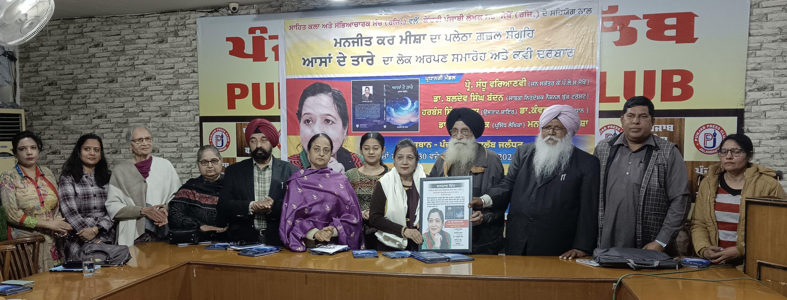 ਸਾਹਿਤ ਕਲਾ ਅਤੇ ਸੱਭਿਆਚਾਰਕ ਮੰਚ ਰਜਿ. ਵਲੋਂ ਕੇਂਦਰੀ ਪੰਜਾਬੀ ਲੇਖਕ ਸਭਾ ਸੇਖੋਂ ਰਜਿ.ਦੇ ਸਹਿਯੋਗ ਨਾਲ ਪੰਜਾਬ ਪ੍ਰੈੱਸ ਕਲੱਬ ਜਲੰਧਰ ਵਿਖੇ ਇਕ ਸ਼ਾਨਦਾਰ ਤੇ ਪ੍ਰਭਾਵਸ਼ੀਲ ਸਾਹਤਿਕ ਪ੍ਰੋਗਰਾਮ ਕਰਵਾ ਕੇ ਚਰਚਿਤ ਸ਼ਾਇਰਾ ਮਨਜੀਤ ਕੌਰ ਮੀਸ਼ਾ ਦਾ ਪਲੇਠਾ ਗ਼ਜ਼ਲ ਸੰਗ੍ਰਹਿ ਆਸਾਂ ਦੇ ਤਾਰੇ ਲੋਕ ਅਰਪਣ ਕੀਤਾ ਗਿਆ।ਪ੍ਰੋਗਰਾਮ ਦੇ ਪ੍ਰਧਾਨਗੀ ਮੰਡਲ ਵਿੱਚ ਕੇਂਦਰੀ ਪੰਜਾਬੀ ਲੇਖਕ ਸਭਾ ਸੇਖੋਂ ਦੇ ਜਨ ਸਕੱਤਰ ਪ੍ਰੋ.ਸੰਧੂ ਵਰਿਆਣਵੀ,ਮੰਚ ਦੇ ਪ੍ਰਧਾਨ ਡਾ.ਕੰਵਲ ਭੱਲਾ,ਡਾ.ਸੋਮਾ ਸਬਲੋਕ, ਡਾ.ਬਲਦੇਵ ਸਿੰਘ ਬੱਦਨ (ਸਾਬਕਾ ਨਿਰਦੇਸ਼ਕ ਨੈਸ਼ਨਲ ਬੁੱਕ ਟਰੱਸਟ ਇੰਡੀਆ),ਹਰਬੰਸ ਸਿੰਘ ਅਕਸ ਅਤੇ ਲੋਕ ਸ਼ਾਇਰ ਜਗਦੀਸ਼ ਰਾਣਾ ਸੁਸ਼ੋਭਿਤ ਹੋਏ।ਮੰਚ ਦੇ ਪ੍ਰਧਾਨ ਡਾ.ਕੰਵਲ ਭੱਲਾ ਨੇ ਸਭ ਨੂੰ ਜੀ ਆਇਆਂ ਨੂੰ ਆਖਦੇ ਹੋਏ ਮੰਚ ਦੀਆਂ ਸਾਹਤਿਕ ਗਤੀਵਿਧੀਆਂ ਬਾਰੇ ਵਿਸਥਾਰ ਪੂਰਵਕ ਜਾਣਕਾਰੀ ਦਿੱਤੀ।ਮੰਚ ਸੰਚਾਲਨ ਕਰਦਿਆਂ ਮੰਚ ਦੇ ਜਨਰਲ ਸਕੱਤਰ ਜਗਦੀਸ਼ ਰਾਣਾ ਨੇ ਦੱਸਿਆ ਕਿ ਮੰਚ ਵਲੋਂ ਜਿੱਥੇ ਨਵੀਆਂ ਕਲਮਾਂ ਦੀ ਹੌਸਲਾ ਅਫ਼ਜ਼ਾਈ ਕੀਤੀ ਜਾਂਦੀ ਹੈ ਓਥੇ ਹੀ ਸਥਾਪਿਤ ਕਲਮਕਾਰਾਂ ਦਾ ਵੀ ਸਮੇਂ ਸਮੇਂ ਤੇ ਸਨਮਾਨ ਕੀਤਾ ਜਾਂਦਾ ਹੈ।ਪੁਸਤਕ ਆਸਾਂ ਦੇ ਤਾਰੇ ਬਾਰੇ ਵਿਚਾਰ ਸਾਂਝੇ ਕਰਦਿਆਂ ਪ੍ਰੋ.ਸੰਧੂ ਵਰਿਆਣਵੀ ਨੇ ਕਿਹਾ ਕਿ ਮੀਸ਼ਾ ਦੀ ਬਹੁਤੀ ਸ਼ਾਇਰੀ ਸ਼ਿੰਗਾਰ ਰਸ ਤੇ ਪਿਆਰ ਮੁਹੱਬਤ ਨਾਲ਼ ਲਬਰੇਜ਼ ਹੈ। ਡਾ.ਬਲਦੇਵ ਸਿੰਘ ਬੱਦਨ ਨੇ ਕਿਹਾ ਕਿ ਮੀਸ਼ਾ ਦੀ ਸ਼ਾਇਰੀ ਦੇ ਅਲੱਗ ਅਲੱਗ ਰੰਗ ਹਨ।ਡਾ.ਸੋਮਾ ਸਬਲੋਕ, ਡਾ.ਕੰਵਲ ਭੱਲਾ ਅਤੇ ਜਗਦੀਸ਼ ਰਾਣਾ ਨੇ ਕਿਹਾ ਕਿ ਮਨਜੀਤ ਕੌਰ ਮੀਸ਼ਾ ਤੋਂ ਭਵਿੱਖ ਵਿੱਚ ਹੋਰ ਵੀ ਉਮੀਦਾਂ ਹਨ।ਇਸ ਮੌਕੇ ਸਾਹਿਤ ਕਲਾ ਅਤੇ ਸੱਭਿਆਚਾਰਕ ਮੰਚ ਵਲੋਂ ਮਨਜੀਤ ਕੌਰ ਮੀਸ਼ਾ ਦਾ ਵਿਸ਼ੇਸ਼ ਸਨਮਾਨ ਵੀ ਕੀਤਾ ਗਿਆ।ਇਸ ਮੌਕੇ ਮਨਜੀਤ ਕੌਰ ਮੀਸ਼ਾ ਨੇ ਆਪਣੇ ਗ਼ਜ਼ਲ ਸੰਗ੍ਰਹਿ ਵਿੱਚੋਂ ਦੋ ਗ਼ਜ਼ਲਾਂ ਸਾਂਝੀਆਂ ਕੀਤੀਆਂ। ਮੀਸ਼ਾ ਦੀ ਬੇਟੀ ਜਸਪ੍ਰੀਤ ਕੌਰ ਨੇ ਵੀ ਮੀਸ਼ਾ ਦੀ ਇਕ ਗ਼ਜ਼ਲ ਪੇਸ਼ ਕਰ ਕੇ ਵਾਹ ਵਾਹ ਖੱਟੀ।ਇਸ ਦੌਰਾਨ ਹੋਏ ਸ਼ਾਨਦਾਰ ਕਵੀ ਦਰਬਾਰ ਵਿਚ ਪ੍ਰਧਾਨਗੀ ਮੰਡਲ ਦੇ ਨਾਲ਼ ਨਾਲ਼ ਗੁਰਦੀਪ ਸਿੰਘ ਸੈਣੀ,ਨਵਤੇਜ ਗੜ੍ਹਦੀਵਾਲਾ, ਪ੍ਰੋ.ਬਲਬੀਰ ਸਿੰਘ ਬੱਲੀ,ਕੀਮਤੀ ਕੈਸਰ,ਵਿਜੈ ਵਾਜਿਦ, ਸਾਹਿਬਾ ਜੀਟਨ ਕੌਰ,ਵਿਜੈ ਫ਼ਿਰਾਕ, ਮਾਧਵੀ ਅੱਗਰਵਾਲ,ਜਰਨੈਲ ਸਾਖੀ, ਮਨਜੀਤ ਸਿੰਘ,ਮਨੋਜ ਫਗਵਾੜਵੀ,ਸੁਖਦੇਵ ਗੰਢਵਾਂ, ਦਲਜੀਤ ਮਹਿਮੀ ,ਸਵਿੰਦਰ ਸੰਧੂ,ਦਿਲਬਹਾਰ ਸ਼ੌਕਤ, ਹਰਜਿੰਦਰ ਜਿੰਦੀ,ਰੀਤੂ ਕਲਸੀ,ਜਸਪਾਲ ਜੀਰਵੀ, ਤਰਸੇਮ ਜਲੰਧਰੀ, ਕੁਲਵਿੰਦਰ ਗਾਖਲ, ਨਗੀਨਾ ਸਿੰਘ ਬਲੱਗਣ,ਰੋਹਿਤ ਸਿੱਧੂ,ਆਸ਼ੀ ਈਸਪੁਰੀ,ਲਾਡੀ ਭੁੱਲਰ, ਕੇ.ਕੇ. ਸਮੇਤ ਤਿੰਨ ਦਰਜਨ ਤੋਂ ਵੱਧ ਕਵੀਆਂ ਨੇ ਆਪਣੀਆਂ ਰਚਨਾਵਾਂ ਜ਼ਰੀਏ ਖ਼ੂਬ ਰੰਗ ਬੰਨ੍ਹਿਆ।ਇਸ ਮੌਕੇ ਗ਼ਜ਼ਲ ਗਾਇਕ ਸੁਰਿੰਦਰ ਗੁਲਸ਼ਨ ਨੇ ਮਨਜੀਤ ਕੌਰ ਮੀਸ਼ਾ ਦੀ ਗ਼ਜ਼ਲ ਸਮੇਤ ਉਲਫ਼ਤ ਬਾਜਵਾ ਦੀ ਇਕ ਗ਼ਜ਼ਲ ਸੁਣਾ ਕੇ ਪ੍ਰੋਗਰਾਮ ਨੂੰ ਚਾਰ ਚੰਨ ਲਾ ਦਿੱਤੇ।ਇਸ ਮੌਕੇ ਹੋਰਨਾਂ ਤੋਂ ਇਲਾਵਾ ਕਰਨਲ ਜਗਬੀਰ ਸਿੰਘ ਸੰਧੂ,ਗੀਤਾ ਵਰਮਾ, ਮੋਹਨ ਸਿੰਘ ਮੋਤੀ, ਪ੍ਰੀਤ ਮੋਹੱਦੀਪੁਰੀਆ, ਹਰੀਸ਼ ਭੰਡਾਰੀ, ਲੱਕੀ ਬੰਗੜ ਆਦਿ ਵੀ ਹਾਜ਼ਰ ਰਹੇ।