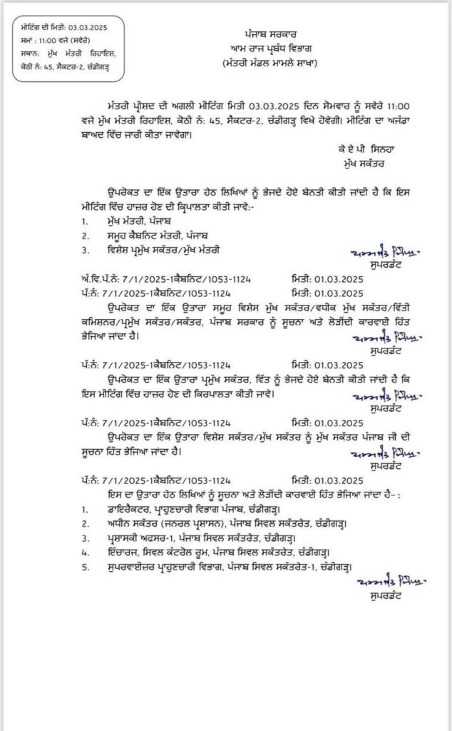 ਮੁੱਖ ਮੰਤਰੀ ਭਗਵੰਤ ਮਾਨ ਦੀ ਅਗਵਾਈ ਵਿੱਚ ਪੰਜਾਬ ਕੈਬਨਿਟ ਦੀ ਅਹਿਮ ਮੀਟਿੰਗ 3 ਮਾਰਚ ਨੂੰ ਹੋਵੇਗੀ। ਇਹ ਮੀਟਿੰਗ ਚੰਡੀਗੜ੍ਹ ਵਿਖੇ ਮੁੱਖ ਮੰਤਰੀ ਦੀ ਰਿਹਾਇਸ਼ ਵਿੱਚ ਸਵੇਰੇ 11 ਵਜੇ ਹੋਵੇਗੀ।