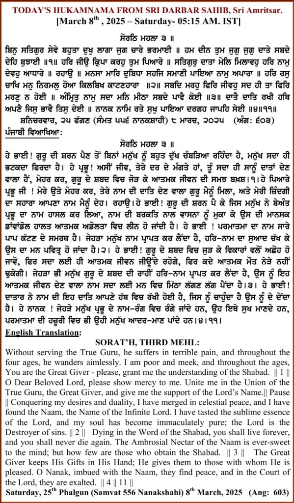ਅੰਮ੍ਰਿਤ ਵੇਲੇ ਦਾ ਹੁਕਮਨਾਮਾ ਸ੍ਰੀ ਦਰਬਾਰ ਸਾਹਿਬ, ਅੰਮ੍ਰਿਤਸਰ, ਮਿਤੀ 08-03-2025,ਅੰਗ 603