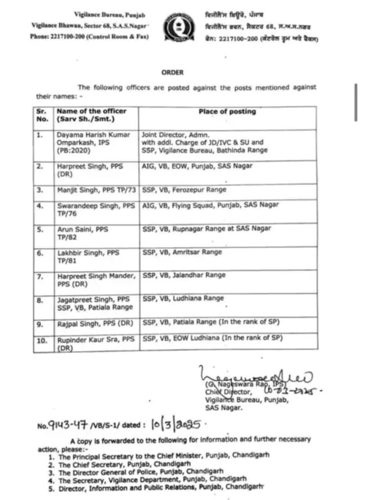 ਇਸ ਤੋਂ ਇਲਾਵਾ, ਮਨਜੀਤ ਸਿੰਘ ਨੂੰ SSP ਵਿਜੀਲੈਂਸ ਫਿਰੋਜ਼ਪੁਰ ਰੇਂਜ, ਅਰੁਣ ਸੈਣੀ ਨੂੰ SSP ਵਿਜੀਲੈਂਸ ਰੂਪਨਗਰ ਰੇਂਜ, ਲਖਬੀਰ ਸਿੰਘ ਨੂੰ SSP ਵਿਜੀਲੈਂਸ ਅੰਮ੍ਰਿਤਸਰ ਰੇਂਜ, ਹਰਪ੍ਰੀਤ ਸਿੰਘ ਨੂੰ SSP ਵਿਜੀਲੈਂਸ ਜਲੰਧਰ ਰੇਂਜ, ਜਗਤਪ੍ਰੀਤ ਸਿੰਘ ਨੂੰ SSP ਵਿਜੀਲੈਂਸ ਲੁਧਿਆਣਾ ਰੇਂਜ, ਰਾਜਪਾਲ ਸਿੰਘ ਨੂੰ SSP ਵਿਜੀਲੈਂਸ ਪਟਿਆਲਾ ਰੇਂਜ ਅਤੇ ਰੁਪਿੰਦਰ ਕੌਰ ਨੂੰ SSP ਵਿਜੀਲੈਂਸ ਬਿਊਰੋ EWO ਵਿੰਗ ਲੁਧਿਆਣਾ ਬਣਾਇਆ ਗਿਆ ਹੈ।