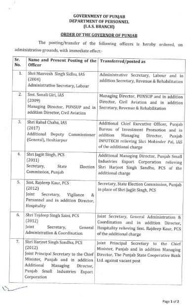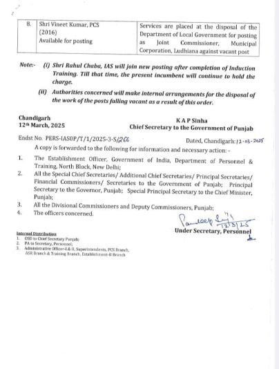 ਪੰਜਾਬ ਸਰਕਾਰ ਵੱਲੋਂ IAS ਅਤੇ PCS ਅਧਿਕਾਰੀਆਂ ਦੇ ਤਬਾਦਲੇ ਕੀਤੇ ਗਏ ਹਨ