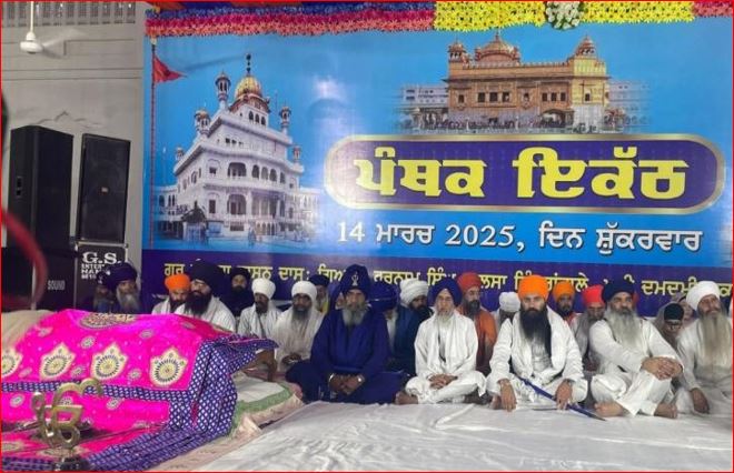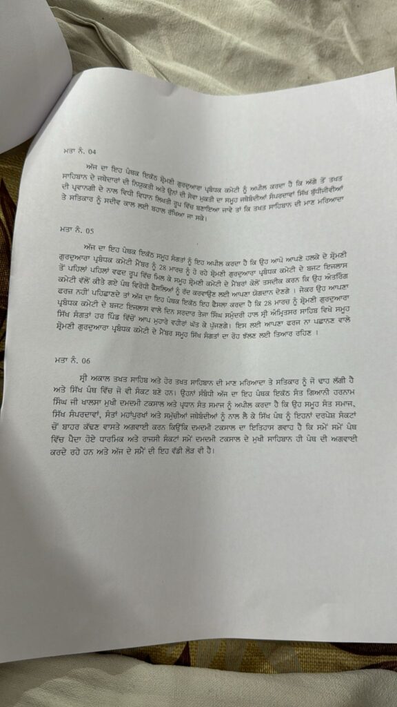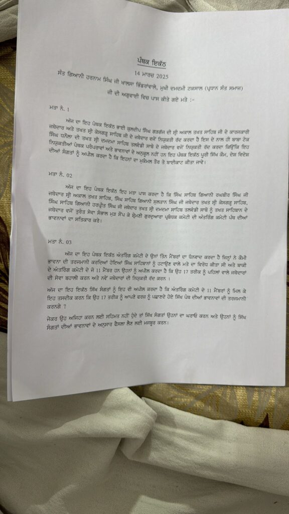 ਜਥੇਦਾਰ ਸਾਹਿਬ ਗੜਗੱਜ, ਟੇਕ ਸਿੰਘ ਧਨੌਲਾ ਦੀ ਨਿਯੁਕਤੀ ਰੱਦ ਕਰਨ ਲਈ ਮਤਾ ਪਾਸ ਕੀਤਾ ਗਿਆ। ‘ਜਥੇਦਾਰਾਂ ਦੀ ਨਿਯੁਕਤੀ ਲਈ ਵਿਧੀ-ਵਿਧਾਨ’ ਬਣੇ, ‘ਪੰਥ ਵਿਰੋਧੀਆਂ ਦੇ ਸਮਾਜਿਕ ਬਾਈਕਾਟ ਐਲਾਨ’ ਹੋਵੇ, ‘ਜਥੇਦਾਰਾਂ ਨੂੰ ਮੁੜ ਤਖ਼ਤਾਂ ਦੇ ਅਹੁਦੇ ਸੌਂਪੇ ਜਾਣ’, ‘ਅੰਤ੍ਰਿੰਗ ਕਮੇਟੀ ਦੀ ਮੈਂਬਰ 17 ਮਾਰਚ ਨੂੰ ਫਰਜ਼ ਨਿਭਾਉਣ’, ‘ਫਰਜ਼ ਨਾ ਨਿਭਾਉਣ ‘ਤੇ ਵਿਰੋਧ ਦੀ ਦਿੱਤੀ ਚਿਤਾਵਨੀ’, ‘ਅੰਤ੍ਰਿੰਗ ਕਮੇਟੀ ਆਪਣੇ ਫ਼ੈਸਲਾ ਕਰੇ ਰੱਦ’, ‘ਫ਼ੈਸਲਾ ਰੱਦ ਨਾ ਕਰਨ ‘ਤੇ ਮੈਂਬਰਾਂ ਦਾ ਘਿਰਾਓ ਕਰੇ ਸੰਗਤ’ ਮਤੇ ਪਾਸ ਕੀਤੇ ਗਏ।