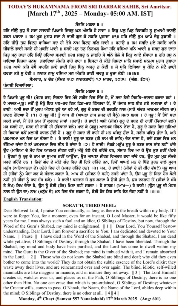 ਅੰਮ੍ਰਿਤ ਵੇਲੇ ਦਾ ਹੁਕਮਨਾਮਾ ਸ੍ਰੀ ਦਰਬਾਰ ਸਾਹਿਬ, ਅੰਮ੍ਰਿਤਸਰ, ਮਿਤੀ 17-03-2025 ,ਅੰਗ 601