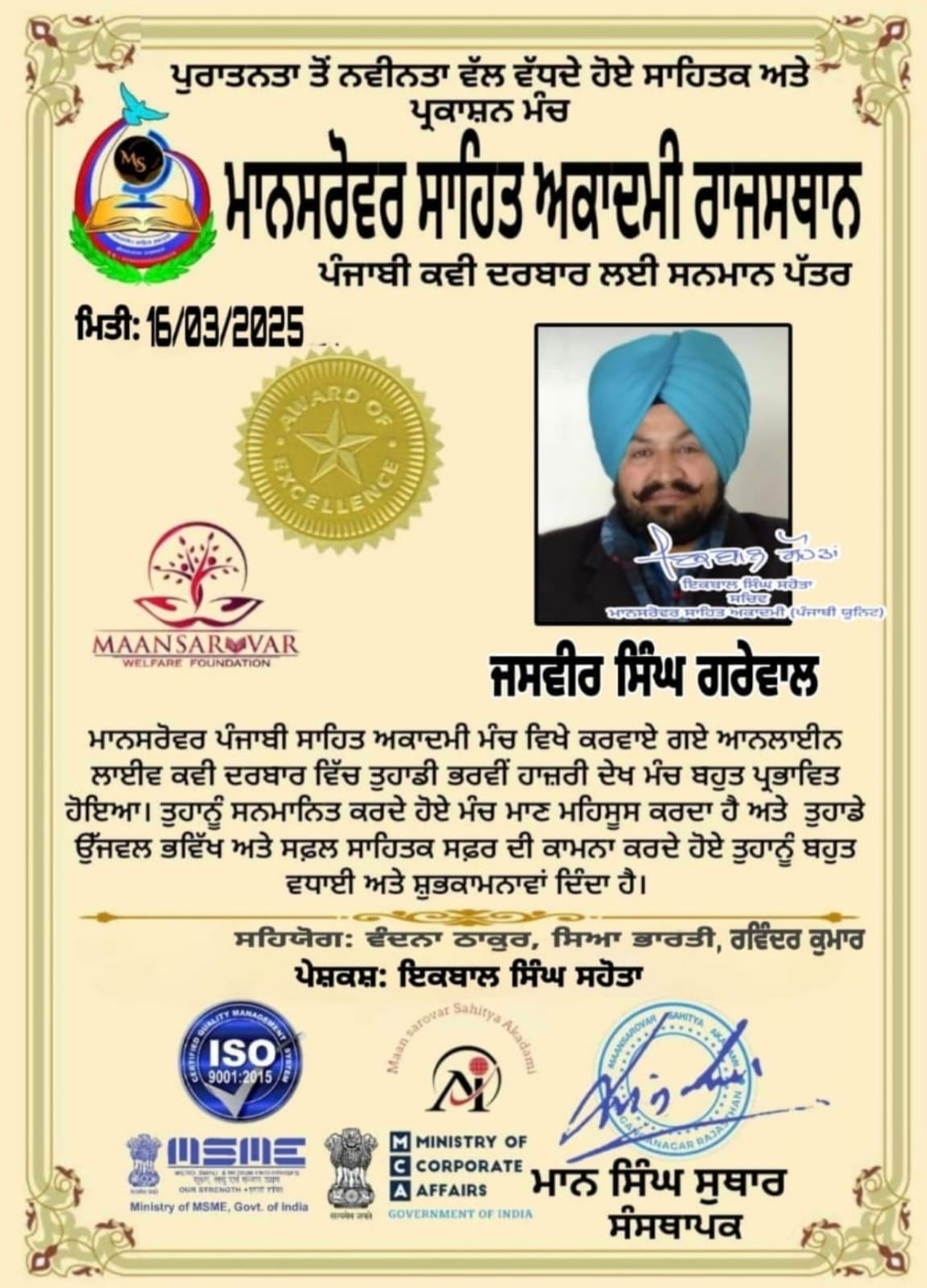ਕਵੀ ਦਰਬਾਰ ਦੇ ਸੰਚਾਲਕ ਮਹਿੰਦਰ ਸੂਦ ਜੀ ਨੇ ਜਿਕਰ ਕੀਤਾ ਕਿ ਸਾਡੀ ਸੰਸਥਾ ਦੇ ਸਚਿਵ ਅਤੇ ਕਵੀ ਦਰਬਾਰ ਦੇ ਪ੍ਰਬੰਧਕ ਇਕਬਾਲ ਸਿੰਘ ਸਹੋਤਾ ਤੇ ਸੰਸਥਾਪਕ ਮਾਨ ਸਿੰਘ ਸੁਥਾਰ ਦੀ ਸਰਾਹਨਾ ਕਰਦਿਆਂ ਕਿਹਾ ਸੰਸਥਾ ਦੇ ਪ੍ਰਧਾਨ ਮੈਡਮ ਸੀਆ ਭਾਰਤੀ ਦੀ ਰਹਿਨੁਮਾਈ ਹੇਠ ਇਹ ਸੰਸਥਾ ਦੇ ਸਾਰੇ ਮੈਂਬਰ ਮਾਂ ਬੋਲੀ ਪੰਜਾਬੀ ਲਈ ਬੜੇ ਸਮਰਪਣ ਭਾਵ ਨਾਲ ਕੰਮ ਕਰਦੇ ਹਨ, ਇਸ ਤੋਂ ਬਿਨਾਂ ਇਲਾਵਾ ਮੈਡਮ ਵੰਦਨਾ ਠਾਕਰ ਤੇ ਰਵਿੰਦਰ ਕੁਮਾਰ ਸਦਾ ਹੀ ਮਾਨਸਰੋਵਰ ਅਕਾਦਮੀ ਨੂੰ ਸਹਿਯੋਗ ਕਰਦੇ ਰਹਿੰਦੇ ਹਨ,ਸਾਨੂੰ ਸਾਰਿਆਂ ਤੇ ਮਾਣ ਹੈ। ਮਾਨਸਰੋਵਰ ਅਕਾਦਮੀ ਵੱਲੋਂ ਪੰਜਾਬ, ਪੰਜਾਬੀ ਅਤੇ ਪੰਜਾਬੀਅਤ ਨੂੰ ਪ੍ਰਫੁੱਲਤ ਕਰਨ ਲਈ ਵੱਖੋ ਵੱਖਰੀਆਂ ਸਾਹਿਤਕ ਵੰਨਗੀਆਂ ਦੇ ਮੁਕਾਬਲੇ ਔਨ ਲਾਇਨ ਕਰਵਾਏ ਜਾਂਦੇ ਹਨ ਅਤੇ ਮੁਕਾਬਲਾ ਜਿੱਤਣ ਵਾਲੇ ਦੀ ਹੌਸਲਾ ਅਫ਼ਸਾਈ ਵਾਸਤੇ ਸਨਮਾਨ ਦਿੱਤੇ ਜਾਂਦੇ ਹਨ, 16 ਮਾਰਚ ਨੂੰ ਹੋਏ ਕਵੀ ਦਰਬਾਰ ਲਈ ਮਾਨਸਰੋਵਰ ਅਕਾਦਮੀ ਰਾਜਸਥਾਨ ਵੱਲੋਂ ਡਾ ਜਸਵੀਰ ਸਿੰਘ ਗਰੇਵਾਲ ਨੂੰ ਸਨਮਾਨ ਦਿੱਤਾ ਗਿਆ, ਸਚਿਵ ਸਹੋਤਾ ਦਾ ਕਹਿਣਾ ਹੈ ਕਿ ਅੱਜ ਕੱਲ ਦੀਆਂ ਟਾਵੀਆਂ ਟਾਵੀਆਂ ਕਲਮਾਂ ਹੀ ਸੱਚਾਈ ਦਾ ਸਾਥ ਦਿੰਦੀਆਂ ਹਨ।