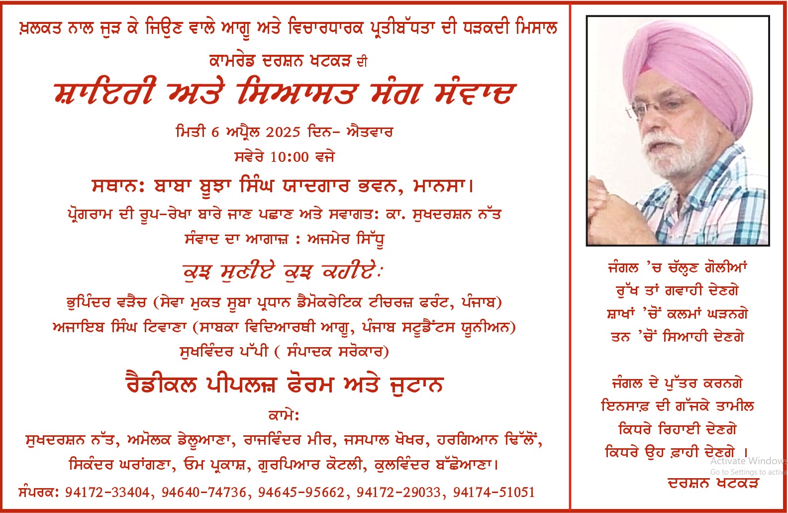 ਰੈਡੀਕਲ ਪੀਪਲਜ਼ ਫੋਰਮ ਅਤੇ ਜੁਟਾਨ ਵਲੋਂ 6 ਅਪਰੈਲ ਨੂੰ ਇਥੇ ਬਾਬਾ ਬੂਝਾ ਸਿੰਘ ਯਾਦਗਾਰ ਭਵਨ ਵਿਖੇ ‘ਸ਼ਾਇਰੀ ਤੇ ਸਿਆਸਤ ਸੰਗ ਸੰਵਾਦ’ ਤਹਿਤ ਉਘੇ ਇਨਕਲਾਬੀ ਆਗੂ ਅਤੇ ਸ਼ਾਇਰ ਦਰਸ਼ਨ ਖਟਕੜ ਨਾਲ ਮਿਲਣੀ ਰੱਖੀ ਗਈ ਹੈ।