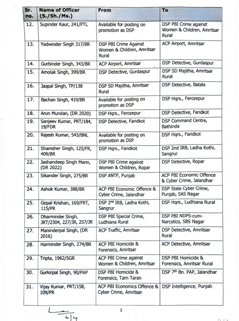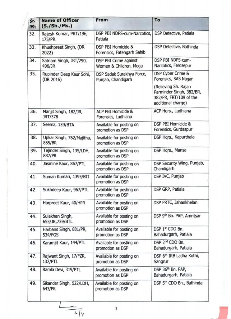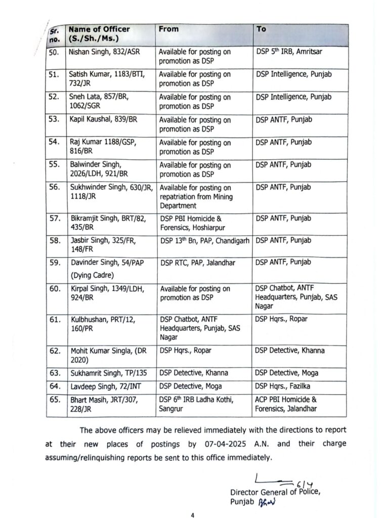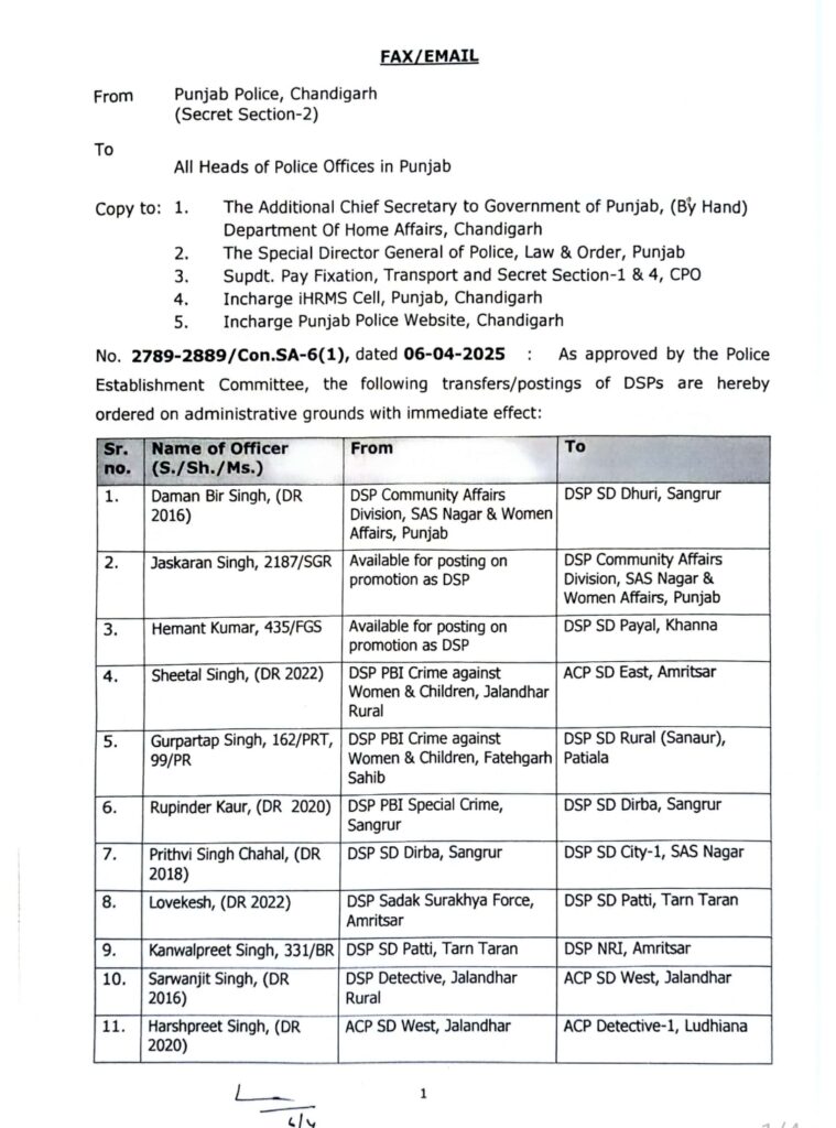 ਪੰਜਾਬ ਸਰਕਾਰ ਨੇ 65 DSP’s ਦੇ ਤਬਾਦਲੇ ਕੀਤੇ ਹਨ