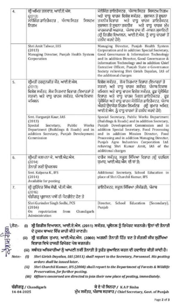ਪੰਜਾਬ ‘ਚ ਆਈਏਐਸ ਤੇ ਪੀਸੀਐਸ ਅਧਿਕਾਰੀਆਂ ਦੀਆਂ ਬਦਲੀਆਂ ਤੇ ਤਾਇਨਾਤੀਆਂ ਚੰਡੀਗੜ੍ਹ ਪੰਜਾਬ ਅਪ੍ਰੈਲ 15, 2025ਅਪ੍ਰੈਲ 15, 2025BolePunjab.comLeave a Comment on ਪੰਜਾਬ ‘ਚ ਆਈਏਐਸ ਤੇ ਪੀਸੀਐਸ ਅਧਿਕਾਰੀਆਂ ਦੀਆਂ ਬਦਲੀਆਂ ਤੇ ਤਾਇਨਾਤੀਆਂ ਚੰਡੀਗੜ੍ਹ, 15 ਅਪ੍ਰੈਲ,ਬੋਲੇ ਪੰਜਾਬ ਬਿਊਰੋ :ਪੰਜਾਬ ‘ਚ ਆਈਏਐਸ ਤੇ ਪੀਸੀਐਸ ਅਧਿਕਾਰੀਆਂ ਦੀਆਂ ਬਦਲੀਆਂ ਤੇ ਤਾਇਨਾਤੀਆਂ ਕੀਤੀਆਂ ਗਈਆਂ ਹਨ ਜੋ ਹੇਠ ਲਿਖੇ ਅਨੁਸਾਰ ਹਨ। Related Postਪੰਜਾਬ ਨੇ ਸਕੂਲ ਅਧਿਆਪਕਾਂ ਨੂੰ ਕਰੀਅਰ ਮੈਂਟਰ ਵਜੋਂ ਸਿਖਲਾਈ ਦੇਣ ਲਈ ਆਈ.ਆਈ.ਟੀ. ਮਦਰਾਸ ਨਾਲ ਹੱਥ ਮਿਲਾਇਆਦਸੰਬਰ 5, 2025ਪੰਜਾਬ ਵਿੱਚ ਜ਼ਿਲ੍ਹਾ ਪ੍ਰੀਸ਼ਦ ਚੋਣਾਂ ਨੂੰ ਲੈ ਕੇ ਕਾਂਗਰਸ ਨੇ ਹਾਈ ਕੋਰਟ ਦਾ ਦਰਵਾਜ਼ਾ ਖੜਕਾਇਆਦਸੰਬਰ 5, 2025ਚੰਡੀਗੜ੍ਹ ਪੁਲਿਸ ਦੇ ਸ਼ਰਾਬੀ ASI ਨੇ 10 ਵਾਹਨਾਂ ਨੂੰ ਮਾਰੀ ਟੱਕਰਦਸੰਬਰ 5, 2025Latest Newsਪੰਜਾਬ ਨੇ ਸਕੂਲ ਅਧਿਆਪਕਾਂ ਨੂੰ ਕਰੀਅਰ ਮੈਂਟਰ ਵਜੋਂ ਸਿਖਲਾਈ ਦੇਣ ਲਈ ਆਈ.ਆਈ.ਟੀ. ਮਦਰਾਸ ਨਾਲ ਹੱਥ ਮਿਲਾਇਆਸੰਸਦ ਮੈਂਬਰ ਸ਼੍ਰੀ ਮਨੀਸ਼ ਤਿਵਾੜੀ ਨੇ ਲੋਕ ਸਭਾ ਵਿੱਚ ਹਰਿਆਣਾ, ਪੰਜਾਬ ਅਤੇ ਹਿਮਾਚਲ ਪ੍ਰਦੇਸ਼ ਦੇ ਡੈਮਾਂ ਦੀ ਡੀ-ਸਿਲਟਿੰਗ ਅਤੇ ਘਟਦੀ ਸਟੋਰੇਜ ਸਮਰੱਥਾ ਦਾ ਮੁੱਦਾ ਉਠਾਇਆਮੁੱਖ ਪ੍ਰਸ਼ਾਸ਼ਕ ਪੁੱਡਾ ਮੈਡਮ ਨੀਰੂ ਕਤਿਆਲ ਗੁਪਤਾ ਦੇ ਦਫਤਰ ਪੁੱਡਾ ਭਵਨ ਮੋਹਾਲੀ ਵਿਖੇ ਲੜੀਵਾਰ ਭੁੱਖ ਹੜਤਾਲਪੰਜਾਬ ਵਿੱਚ ਜ਼ਿਲ੍ਹਾ ਪ੍ਰੀਸ਼ਦ ਚੋਣਾਂ ਨੂੰ ਲੈ ਕੇ ਕਾਂਗਰਸ ਨੇ ਹਾਈ ਕੋਰਟ ਦਾ ਦਰਵਾਜ਼ਾ ਖੜਕਾਇਆਬਿਜਲੀ ਸੋਧ ਬਿਲ ਤੇ ਨਵੇਂ ਬੀਜ ਬਿੱਲ ਖਿਲਾਫ ਕਿਰਤੀ ਕਿਸਾਨ ਮੋਰਚਾ ਦੀ ਹੋਈ ਮੀਟਿੰਗPreviousNextLatest Newsਪੰਜਾਬ ਨੇ ਸਕੂਲ ਅਧਿਆਪਕਾਂ ਨੂੰ ਕਰੀਅਰ ਮੈਂਟਰ ਵਜੋਂ ਸਿਖਲਾਈ ਦੇਣ ਲਈ ਆਈ.ਆਈ.ਟੀ. ਮਦਰਾਸ ਨਾਲ ਹੱਥ ਮਿਲਾਇਆਸੰਸਦ ਮੈਂਬਰ ਸ਼੍ਰੀ ਮਨੀਸ਼ ਤਿਵਾੜੀ ਨੇ ਲੋਕ ਸਭਾ ਵਿੱਚ ਹਰਿਆਣਾ, ਪੰਜਾਬ ਅਤੇ ਹਿਮਾਚਲ ਪ੍ਰਦੇਸ਼ ਦੇ ਡੈਮਾਂ ਦੀ ਡੀ-ਸਿਲਟਿੰਗ ਅਤੇ ਘਟਦੀ ਸਟੋਰੇਜ ਸਮਰੱਥਾ ਦਾ ਮੁੱਦਾ ਉਠਾਇਆਮੁੱਖ ਪ੍ਰਸ਼ਾਸ਼ਕ ਪੁੱਡਾ ਮੈਡਮ ਨੀਰੂ ਕਤਿਆਲ ਗੁਪਤਾ ਦੇ ਦਫਤਰ ਪੁੱਡਾ ਭਵਨ ਮੋਹਾਲੀ ਵਿਖੇ ਲੜੀਵਾਰ ਭੁੱਖ ਹੜਤਾਲਪੰਜਾਬ ਵਿੱਚ ਜ਼ਿਲ੍ਹਾ ਪ੍ਰੀਸ਼ਦ ਚੋਣਾਂ ਨੂੰ ਲੈ ਕੇ ਕਾਂਗਰਸ ਨੇ ਹਾਈ ਕੋਰਟ ਦਾ ਦਰਵਾਜ਼ਾ ਖੜਕਾਇਆਬਿਜਲੀ ਸੋਧ ਬਿਲ ਤੇ ਨਵੇਂ ਬੀਜ ਬਿੱਲ ਖਿਲਾਫ ਕਿਰਤੀ ਕਿਸਾਨ ਮੋਰਚਾ ਦੀ ਹੋਈ ਮੀਟਿੰਗਪਾਈਟੈਕਸ ਵਿਖੇ ਅਪਾਹਜਾਂ ਅਤੇ ਬਜ਼ੁਰਗਾਂ ਲਈ ਵ੍ਹੀਲਚੇਅਰ ਦੀ ਸਹੂਲਤਚੰਡੀਗੜ੍ਹ ਪੁਲਿਸ ਦੇ ਸ਼ਰਾਬੀ ASI ਨੇ 10 ਵਾਹਨਾਂ ਨੂੰ ਮਾਰੀ ਟੱਕਰਪੰਜਾਬ ਵਿੱਚ ਰੇਲਵੇ ਪਟੜੀਆਂ ‘ਤੇ ਕਿਸਾਨਾਂ ਅਤੇ ਪੁਲਿਸ ਵਿਚਕਾਰ ਝੜਪਾਂਦੇਸ਼ ਭਗਤ ਯੂਨੀਵਰਸਿਟੀ ਨੇ ਕਰਵਾਈ ਅੰਤਰਰਾਸ਼ਟਰੀ ਕਾਨਫਰੰਸ ਅਤੇ ਅਗਾਂਹਵਧੂ ਕਿਸਾਨ ਮਿਲਣੀਆਮ ਆਦਮੀ ਪਾਰਟੀ ਵੱਲੋਂ ਨਾਮਜ਼ਦਗੀ ਪੱਤਰ ਦਾਖਲ ਕਰਨ ਦੌਰਾਨ ਸ਼ਰੇਆਮ ਗੁੰਡਾਗਰਦੀ ਦੀਆਂ ਘਟਨਾਵਾਂ ਅਤੇ ਚੋਣ ਪ੍ਰਕਿਰਿਆ ਦੌਰਾਨ ਸਰਕਾਰੀ ਮਸ਼ੀਨਰੀ ਦੀ ਕਥਿਤ ਦੁਰਵਰਤੋਂ ਲੋਕਤੰਤਰ ਲਈ ਖ਼ਤਰਨਾਕ – ਕੈਂਥ ਪੁਲਿਸ ਮੁਲਾਜ਼ਮਾਂ ‘ਤੇ ਵਰਦੀ ‘ਚ ਰੀਲਾਂ ਬਣਾਉਣ ‘ਤੇ ਲੱਗੀ ਪਾਬੰਦੀਜਲੰਧਰ ‘ਚ ਰੋਡਵੇਜ਼ ਬੱਸ ਨੇ ਸਕੂਟਰ ਨੂੰ ਟੱਕਰ ਮਾਰੀ, ਪੁੱਤ ਦੀ ਮੌਤ ਪਿਤਾ ਗੰਭੀਰ ਜ਼ਖ਼ਮੀ PreviousNext