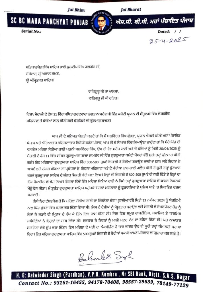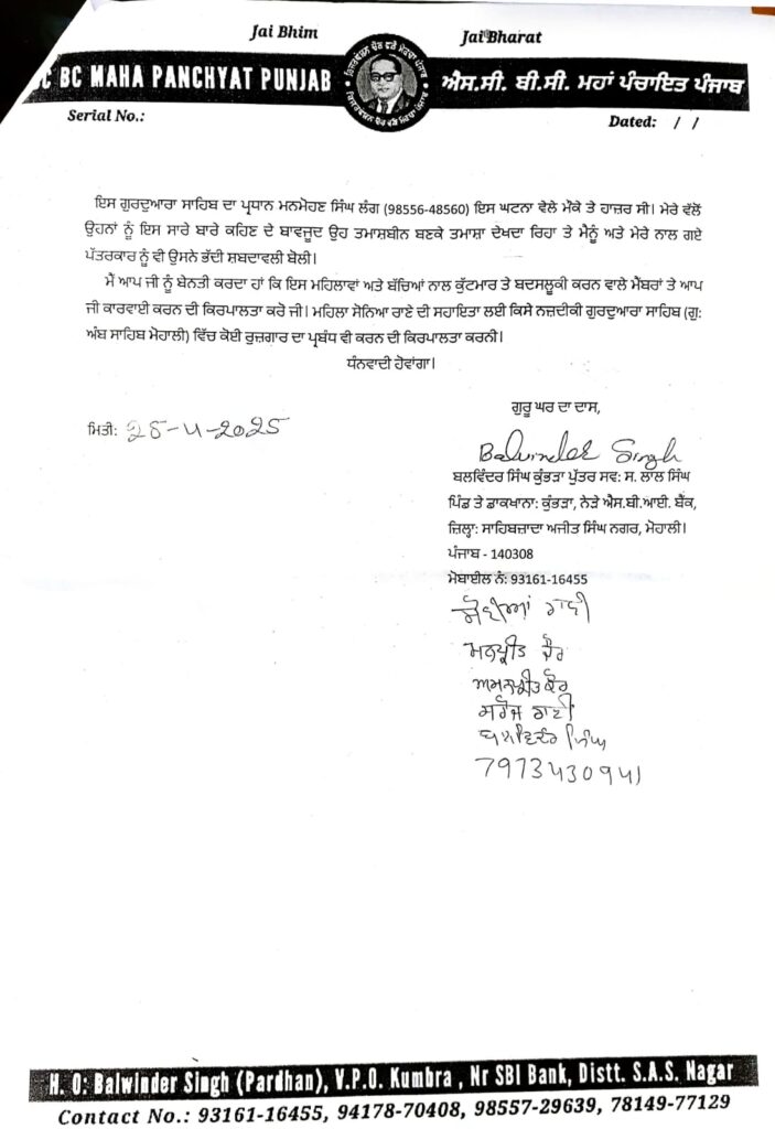 ਮਿਤੀ 20 ਅਪ੍ਰੈਲ ਨੂੰ ਮੋਹਾਲੀ ਦੇ ਫੇਸ 11 ਵਿੱਚ ਸਥਿਤ ਗੁਰਦੁਆਰਾ ਭਗਤ ਨਾਮਦੇਵ ਜੀ ਦੇ ਪ੍ਰਬੰਧਕਾਂ ਵੱਲੋਂ ਗੁਰਦੁਆਰਾ ਪ੍ਰਬੰਧਕ ਕਮੇਟੀ ਦੇ ਪ੍ਰਧਾਨ ਮਨਮੋਹਨ ਸਿੰਘ ਲੰਗ ਦੀ ਮੌਜੂਦਗੀ ਵਿੱਚ ਪਿੰਡ ਕੁੰਭੜਾ ਦੀਆਂ ਮਹਿਲਾਵਾਂ ਸੋਨੀਆ ਰਾਣੀ, ਸਰੋਜ ਰਾਣੀ ਤੇ ਦੋ ਬੱਚਿਆਂ ਦੀ ਇਨਸਾਨੀਅਤ ਨੂੰ ਸ਼ਰਮਸ਼ਾਰ ਕਰਦੇ ਹੋਏ ਸਿਰਾਂ ਚ ਜੁੱਤੀਆਂ ਮਾਰ ਕੇ ਬੇਰਹਿਮੀ ਨਾਲ ਕੁੱਟਮਾਰ ਕੀਤੀ ਗਈ ਸੀ। ਉੱਗੇ ਸਮਾਜ ਸੇਵੀ ਤੇ ਐਸਸੀ ਬੀਸੀ ਮਹਾ ਪੰਚਾਇਤ ਪੰਜਾਬ ਦੇ ਪ੍ਰਧਾਨ ਬਲਵਿੰਦਰ ਸਿੰਘ ਕੁੰਭੜਾ ਦੀ ਦਖਲੰਦਾਜ਼ੀ ਨਾਲ ਬੰਦੀ ਬਣਾਈਆਂ ਗਈਆਂ ਮਹਿਲਾ ਮਹਿਲਾਵਾਂ ਅਤੇ ਬੱਚੀਆਂ ਨੂੰ ਛੁਡਾਇਆ ਗਿਆ ਤੇ ਪੁਲਿਸ ਥਾਣੇ ਜਾਕੇ ਸ਼ਿਕਾਇਤ ਨੰਬਰ 734/20.4.25 ਦਰਜ ਕਰਾਈ।