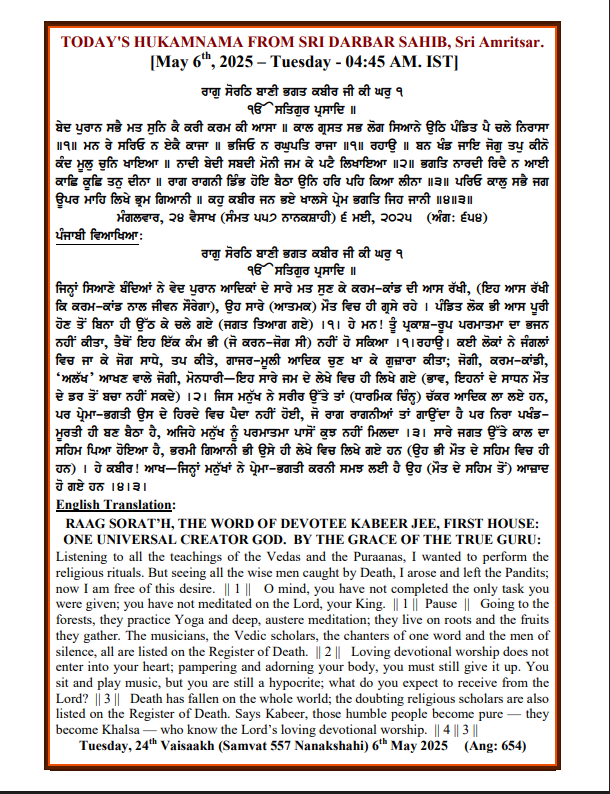 ਅੰਮ੍ਰਿਤ ਵੇਲੇ ਦਾ ਹੁਕਮਨਾਮਾ ਸ੍ਰੀ ਦਰਬਾਰ ਸਾਹਿਬ, ਅੰਮ੍ਰਿਤਸਰ, ਮਿਤੀ 06-05-2025,ਅੰਗ 654