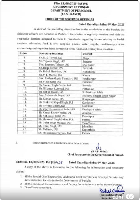 ਪੰਜਾਬ ਦੇ ਗਵਰਨਰ ਦੇ ਹੁਕਮਾਂ ਅਨੁਸਾਰ ਬਾਰਡਰ ‘ਤੇ ਵਧਦੇ ਤਣਾਅ ਦੇ ਕਾਰਨ ਤੇ ਮੌਜੂਦਾ ਸਥਿਤੀ ਦੇ ਮੱਦੇਨਜ਼ਰ, ਸਿਹਤ ਸੇਵਾਵਾਂ, ਸਿੱਖਿਆ, ਖੁਰਾਕ ਅਤੇ ਸਿਵਲ ਸਪਲਾਈ, ਬਿਜਲੀ, ਪਾਣੀ ਸਪਲਾਈ, ਸੜਕ/ਟਰਾਂਸਪੋਰਟੇਸ਼ਨ ਕਨੈਕਟੀਵਿਟੀ ਅਤੇ ਮਿਲਿਟਲ ਕੋਆਰਡੀਨੇਸ਼ਨ ਨਾਲ ਸਬੰਧਤ ਕਿਸੇ ਵੀ ਹੋਰ ਮੁੱਦੇ ‘ਤੇ ਤਾਲਮੇਲ ਕਰਨ ਲਈ ਹੇਠ ਅਧਿਕਾਰੀਆਂ ਨੂੰ ਪ੍ਰਭਾਰੀ ਸਕੱਤਰਾਂ ਵਜੋਂ ਨਿਯਮਤ ਤੌਰ ‘ਤੇ ਨਿਗਰਾਨੀ ਕਰਨ ਅਤੇ ਉਨ੍ਹਾਂ ਨੂੰ ਸੌਂਪੇ ਗਏ ਸਬੰਧਤ ਜ਼ਿਲ੍ਹਿਆਂ ਦਾ ਦੌਰਾ ਕਰਨ ਲਈ ਤਾਇਨਾਤ ਕੀਤਾ ਗਿਆ ਹੈ: