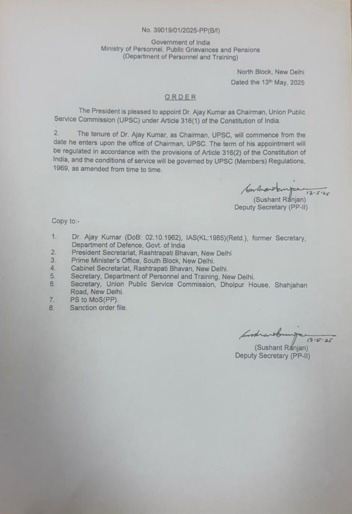 ਭਾਰਤ ਸਰਕਾਰ ਨੇ ਕੇਂਦਰੀ ਸਿਵਲ ਸੇਵਾਵਾਂ ਦੀ ਚੋਣ ਸੰਸਥਾ ਯੂਨੀਅਨ ਪਬਲਿਕ ਸਰਵਿਸ ਕਮਿਸ਼ਨ (UPSC) ਦੇ ਨਵੇਂ ਚੇਅਰਮੈਨ ਵਜੋਂ ਅਜੈ ਕੁਮਾਰ ਦੀ ਨਿਯੁਕਤੀ ਦੀ ਘੋਸ਼ਣਾ ਕਰ ਦਿੱਤੀ ਹੈ। ਰਾਸ਼ਟਰਪਤੀ ਦ੍ਰੌਪਦੀ ਮੁਰਮੂ ਵੱਲੋਂ ਮਨਜ਼ੂਰੀ ਦੇਣ ਮਗਰੋਂ ਇਹ ਨਿਯੁਕਤੀ ਲਾਗੂ ਹੋ ਗਈ ਹੈ।