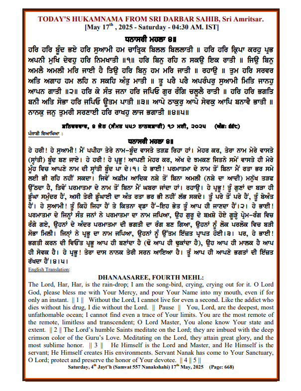 ਅੰਮ੍ਰਿਤ ਵੇਲੇ ਦਾ ਹੁਕਮਨਾਮਾ ਸ੍ਰੀ ਦਰਬਾਰ ਸਾਹਿਬ, ਅੰਮ੍ਰਿਤਸਰ, ਮਿਤੀ 17-05-2025,ਅੰਗ 668