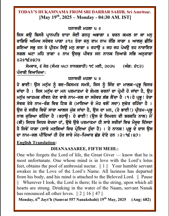 ਅੰਮ੍ਰਿਤ ਵੇਲੇ ਦਾ ਹੁਕਮਨਾਮਾ ਸ੍ਰੀ ਦਰਬਾਰ ਸਾਹਿਬ, ਅੰਮ੍ਰਿਤਸਰ, ਮਿਤੀ 19-05-2025,ਅੰਗ 682