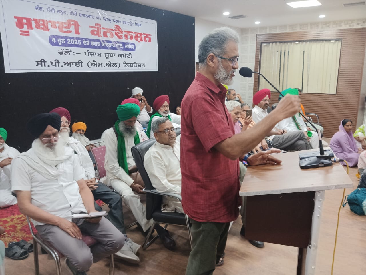 ਇਸ ਸਮੇ ਬੋਲਦਿਆ ਆਰ ਐੱਮ ਪੀ ਆਈ ਦੇ ਜਨਰਲ ਸਕੱਤਰ ਮੰਗਤ ਰਾਮ ਪਾਸਲਾ ਨੇ ਮੋਦੀ ਸਰਕਾਰ ਦੀਆਂ ਸੰਵਿਧਾਨ ਵਿਰੋਧੀ ਤੇ ਜਮਹੂਰੀਅਤ ਵਿਰੋਧੀ ਨੀਤੀਆਂ ਖ਼ਿਲਾਫ਼ ਇਕਜੁੱਟ ਹੋ ਕੇ ਇਕ ਮਜ਼ਬੂਤ ਸਿਆਸੀ ਮੋਰਚਾ ਵਿਕਸਤ ਕਰਨ ਦੀ ਲੋੜ ਉਤੇ ਜ਼ੋਰ ਦਿੱਤਾ। ਪੰਜਾਬ ਵਿੱਚ ਸੀਪੀਆਈ (ਐਮ ਐਲ) ਦੇ ਮੁੱਢਲੇ ਆਗੂਆਂ ਵਿਚੋਂ ਇਕ ਅਤੇ ਦੇਸ਼ ਭਗਤ ਯਾਦਗਾਰ ਹਾਲ ਦੀ ਟਰੱਸਟੀ ਕਾਮਰੇਡ ਸੁਰਿੰਦਰ ਕੁਮਾਰੀ ਕੋਛੜ ਨੇ ਇਹ ਵੱਡੀ ਜੰਗ ਵਿਰੋਧੀ ਕਨਵੈਨਸ਼ਨ ਕਰਨ ਲਈ ਲਿਬਰੇਸ਼ਨ ਪਾਰਟੀ ਨੂੰ ਸ਼ਾਬਾਸ਼ੇ ਦਿੱਤੀ।
