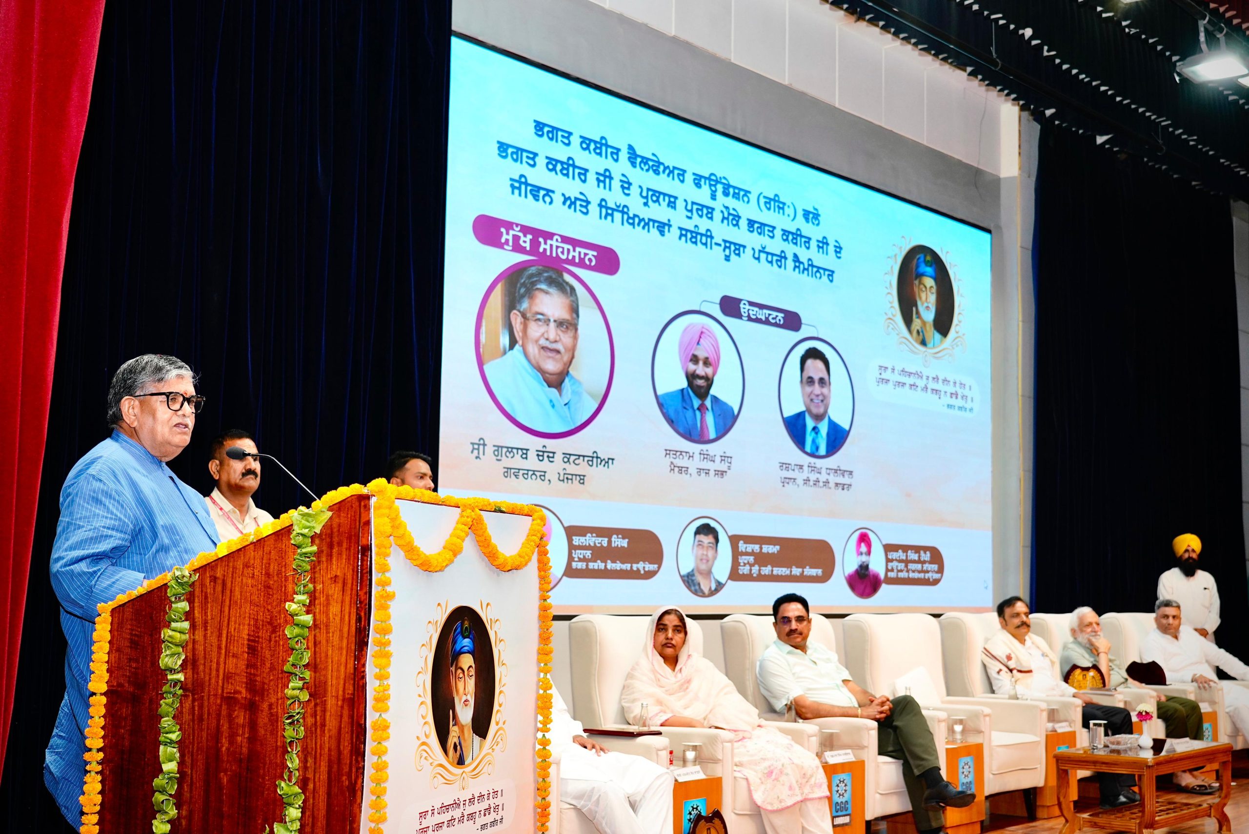ਪੰਜਾਬ ਦੇ ਰਾਜਪਾਲ ਗੁਲਾਬ ਚੰਦ ਕਟਾਰੀਆ ਨੇ ਅੱਜ ਇੱਥੇ ਭਗਤ ਕਬੀਰ ਜੀ ਦੇ ਪ੍ਰਕਾਸ਼ ਉਤਸਵ ਮੌਕੇ ਭਗਤ ਕਬੀਰ ਵੈਲਫੇਅਰ ਫਾਊਂਡੇਸ਼ਨ ਵੱਲੋਂ ਚੰਡੀਗੜ੍ਹ ਗਰੁੱਪ ਆਫ ਕਾਲਜਿਜ਼ ਲਾਂਡਰਾਂ ਕਰਵਾਏ ਸੂਬਾ ਪੱਧਰੀ ਸੈਮੀਨਾਰ ਚ ਸ਼ਿਰਕਤ ਕਰਦਿਆਂ ਕਿਹਾ ਕਿ ਭਗਤ ਕਬੀਰ ਜੀ ਦੀ ਦੋਹਾ ਰੂਪ ਬਾਣੀ ਅਤੇ ਸਿੱਖਿਆਵਾਂ ਅਜੋਕੇ ਸਮਾਜਿਕ ਹਾਲਤਾਂ ਅਤੇ ਮਾਨਵੀ ਜੀਵਨ ਲਈ ਪੂਰਣ ਰੂਪ ਵਿੱਚ ਪ੍ਰਸੰਗਿਕ ਹਨ।