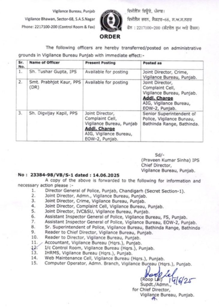 ਵਿਜੀਲੈਂਸ ਬਿਊਰੋ ‘ਚ IPS ਤੇ PCS ਅਧਿਕਾਰੀਆਂ ਦੇ ਤਬਾਦਲੇ ਤੇ ਤਾਇਨਾਤੀ ਚੰਡੀਗੜ੍ਹ ਪੰਜਾਬ ਜੂਨ 15, 2025ਜੂਨ 15, 2025BolePunjab.comLeave a Comment on ਵਿਜੀਲੈਂਸ ਬਿਊਰੋ ‘ਚ IPS ਤੇ PCS ਅਧਿਕਾਰੀਆਂ ਦੇ ਤਬਾਦਲੇ ਤੇ ਤਾਇਨਾਤੀ ਚੰਡੀਗੜ੍ਹ, 14 ਜੂਨ,ਬੋਲੇ ਪੰਜਾਬ ਬਿਊਰੋ;ਵਿਜੀਲੈਂਸ ਬਿਊਰੋ ਪੰਜਾਬ ‘ਚ ਪ੍ਰਸ਼ਾਸਕੀ ਆਧਾਰ ‘ਤੇ IPS ਤੇ PCS ਅਧਿਕਾਰੀਆਂ ਦੇ ਤਬਾਦਲੇ ਤੇ ਤਾਇਨਾਤੀ ਕੀਤੀ ਗਈ ਹੈ। Related Postਪੰਜਾਬ ਨੇ ਸਕੂਲ ਅਧਿਆਪਕਾਂ ਨੂੰ ਕਰੀਅਰ ਮੈਂਟਰ ਵਜੋਂ ਸਿਖਲਾਈ ਦੇਣ ਲਈ ਆਈ.ਆਈ.ਟੀ. ਮਦਰਾਸ ਨਾਲ ਹੱਥ ਮਿਲਾਇਆਦਸੰਬਰ 5, 2025ਪੰਜਾਬ ਵਿੱਚ ਜ਼ਿਲ੍ਹਾ ਪ੍ਰੀਸ਼ਦ ਚੋਣਾਂ ਨੂੰ ਲੈ ਕੇ ਕਾਂਗਰਸ ਨੇ ਹਾਈ ਕੋਰਟ ਦਾ ਦਰਵਾਜ਼ਾ ਖੜਕਾਇਆਦਸੰਬਰ 5, 2025ਚੰਡੀਗੜ੍ਹ ਪੁਲਿਸ ਦੇ ਸ਼ਰਾਬੀ ASI ਨੇ 10 ਵਾਹਨਾਂ ਨੂੰ ਮਾਰੀ ਟੱਕਰਦਸੰਬਰ 5, 2025Latest Newsਪੰਜਾਬ ਨੇ ਸਕੂਲ ਅਧਿਆਪਕਾਂ ਨੂੰ ਕਰੀਅਰ ਮੈਂਟਰ ਵਜੋਂ ਸਿਖਲਾਈ ਦੇਣ ਲਈ ਆਈ.ਆਈ.ਟੀ. ਮਦਰਾਸ ਨਾਲ ਹੱਥ ਮਿਲਾਇਆਸੰਸਦ ਮੈਂਬਰ ਸ਼੍ਰੀ ਮਨੀਸ਼ ਤਿਵਾੜੀ ਨੇ ਲੋਕ ਸਭਾ ਵਿੱਚ ਹਰਿਆਣਾ, ਪੰਜਾਬ ਅਤੇ ਹਿਮਾਚਲ ਪ੍ਰਦੇਸ਼ ਦੇ ਡੈਮਾਂ ਦੀ ਡੀ-ਸਿਲਟਿੰਗ ਅਤੇ ਘਟਦੀ ਸਟੋਰੇਜ ਸਮਰੱਥਾ ਦਾ ਮੁੱਦਾ ਉਠਾਇਆਮੁੱਖ ਪ੍ਰਸ਼ਾਸ਼ਕ ਪੁੱਡਾ ਮੈਡਮ ਨੀਰੂ ਕਤਿਆਲ ਗੁਪਤਾ ਦੇ ਦਫਤਰ ਪੁੱਡਾ ਭਵਨ ਮੋਹਾਲੀ ਵਿਖੇ ਲੜੀਵਾਰ ਭੁੱਖ ਹੜਤਾਲਪੰਜਾਬ ਵਿੱਚ ਜ਼ਿਲ੍ਹਾ ਪ੍ਰੀਸ਼ਦ ਚੋਣਾਂ ਨੂੰ ਲੈ ਕੇ ਕਾਂਗਰਸ ਨੇ ਹਾਈ ਕੋਰਟ ਦਾ ਦਰਵਾਜ਼ਾ ਖੜਕਾਇਆਬਿਜਲੀ ਸੋਧ ਬਿਲ ਤੇ ਨਵੇਂ ਬੀਜ ਬਿੱਲ ਖਿਲਾਫ ਕਿਰਤੀ ਕਿਸਾਨ ਮੋਰਚਾ ਦੀ ਹੋਈ ਮੀਟਿੰਗPreviousNextLatest Newsਪੰਜਾਬ ਨੇ ਸਕੂਲ ਅਧਿਆਪਕਾਂ ਨੂੰ ਕਰੀਅਰ ਮੈਂਟਰ ਵਜੋਂ ਸਿਖਲਾਈ ਦੇਣ ਲਈ ਆਈ.ਆਈ.ਟੀ. ਮਦਰਾਸ ਨਾਲ ਹੱਥ ਮਿਲਾਇਆਸੰਸਦ ਮੈਂਬਰ ਸ਼੍ਰੀ ਮਨੀਸ਼ ਤਿਵਾੜੀ ਨੇ ਲੋਕ ਸਭਾ ਵਿੱਚ ਹਰਿਆਣਾ, ਪੰਜਾਬ ਅਤੇ ਹਿਮਾਚਲ ਪ੍ਰਦੇਸ਼ ਦੇ ਡੈਮਾਂ ਦੀ ਡੀ-ਸਿਲਟਿੰਗ ਅਤੇ ਘਟਦੀ ਸਟੋਰੇਜ ਸਮਰੱਥਾ ਦਾ ਮੁੱਦਾ ਉਠਾਇਆਮੁੱਖ ਪ੍ਰਸ਼ਾਸ਼ਕ ਪੁੱਡਾ ਮੈਡਮ ਨੀਰੂ ਕਤਿਆਲ ਗੁਪਤਾ ਦੇ ਦਫਤਰ ਪੁੱਡਾ ਭਵਨ ਮੋਹਾਲੀ ਵਿਖੇ ਲੜੀਵਾਰ ਭੁੱਖ ਹੜਤਾਲਪੰਜਾਬ ਵਿੱਚ ਜ਼ਿਲ੍ਹਾ ਪ੍ਰੀਸ਼ਦ ਚੋਣਾਂ ਨੂੰ ਲੈ ਕੇ ਕਾਂਗਰਸ ਨੇ ਹਾਈ ਕੋਰਟ ਦਾ ਦਰਵਾਜ਼ਾ ਖੜਕਾਇਆਬਿਜਲੀ ਸੋਧ ਬਿਲ ਤੇ ਨਵੇਂ ਬੀਜ ਬਿੱਲ ਖਿਲਾਫ ਕਿਰਤੀ ਕਿਸਾਨ ਮੋਰਚਾ ਦੀ ਹੋਈ ਮੀਟਿੰਗਪਾਈਟੈਕਸ ਵਿਖੇ ਅਪਾਹਜਾਂ ਅਤੇ ਬਜ਼ੁਰਗਾਂ ਲਈ ਵ੍ਹੀਲਚੇਅਰ ਦੀ ਸਹੂਲਤਚੰਡੀਗੜ੍ਹ ਪੁਲਿਸ ਦੇ ਸ਼ਰਾਬੀ ASI ਨੇ 10 ਵਾਹਨਾਂ ਨੂੰ ਮਾਰੀ ਟੱਕਰਪੰਜਾਬ ਵਿੱਚ ਰੇਲਵੇ ਪਟੜੀਆਂ ‘ਤੇ ਕਿਸਾਨਾਂ ਅਤੇ ਪੁਲਿਸ ਵਿਚਕਾਰ ਝੜਪਾਂਦੇਸ਼ ਭਗਤ ਯੂਨੀਵਰਸਿਟੀ ਨੇ ਕਰਵਾਈ ਅੰਤਰਰਾਸ਼ਟਰੀ ਕਾਨਫਰੰਸ ਅਤੇ ਅਗਾਂਹਵਧੂ ਕਿਸਾਨ ਮਿਲਣੀਆਮ ਆਦਮੀ ਪਾਰਟੀ ਵੱਲੋਂ ਨਾਮਜ਼ਦਗੀ ਪੱਤਰ ਦਾਖਲ ਕਰਨ ਦੌਰਾਨ ਸ਼ਰੇਆਮ ਗੁੰਡਾਗਰਦੀ ਦੀਆਂ ਘਟਨਾਵਾਂ ਅਤੇ ਚੋਣ ਪ੍ਰਕਿਰਿਆ ਦੌਰਾਨ ਸਰਕਾਰੀ ਮਸ਼ੀਨਰੀ ਦੀ ਕਥਿਤ ਦੁਰਵਰਤੋਂ ਲੋਕਤੰਤਰ ਲਈ ਖ਼ਤਰਨਾਕ – ਕੈਂਥ ਪੁਲਿਸ ਮੁਲਾਜ਼ਮਾਂ ‘ਤੇ ਵਰਦੀ ‘ਚ ਰੀਲਾਂ ਬਣਾਉਣ ‘ਤੇ ਲੱਗੀ ਪਾਬੰਦੀਜਲੰਧਰ ‘ਚ ਰੋਡਵੇਜ਼ ਬੱਸ ਨੇ ਸਕੂਟਰ ਨੂੰ ਟੱਕਰ ਮਾਰੀ, ਪੁੱਤ ਦੀ ਮੌਤ ਪਿਤਾ ਗੰਭੀਰ ਜ਼ਖ਼ਮੀ PreviousNext