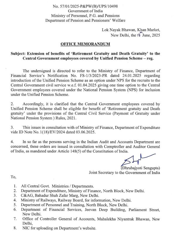 ਸਰਕਾਰੀ ਮੁਲਾਜ਼ਮਾਂ ਦੇ ਲਈ ਲਾਗੂ ਕੀਤੀ ਗਈ ਯੂਪੀਐਸ ਸਬੰਧੀ ਸਰਕਾਰ ਵੱਲੋਂ ਇਕ ਅਹਿਮ ਪੱਤਰ ਜਾਰੀ ਕੀਤਾ ਗਿਆ ਹੈ। ਕੇਂਦਰ ਸਰਕਾਰ ਵੱਲੋਂ ਜਾਰੀ ਪੱਤਰ ਮੁਤਾਬਕ ਯੂਨੀਫਾਈਡ ਪੈਨਸ਼ਨ ਸਕੀਮ ਦਾ ਵਿਕਲਪ ਚੁਣਨ ਵਾਲੇ ਸਰਕਾਰੀ ਕਰਮਚਾਰੀ ਕੇਂਦਰੀ ਸਿਵਿਲ ਸੇਵਾ (ਰਾਸ਼ਟਰੀ ਪੈਨਸ਼ਨ ਪ੍ਰਣਾਲੀ ਦੇ ਨਿਯਮ 2021 ਦੇ ਪ੍ਰਾਵਧਾਨਾਂ ਦੇ ਤਹਿਤ ‘ਸੇਵਾਮੁਕਤੀ ਗ੍ਰੇਚੂਟੀ ਅਤੇ ਡੈਥ ਗ੍ਰੇਚੂਇਟੀ’ ਦੇ ਲਾਭ ਲਈ ਯੋਗ ਹੋਣਗੇ।