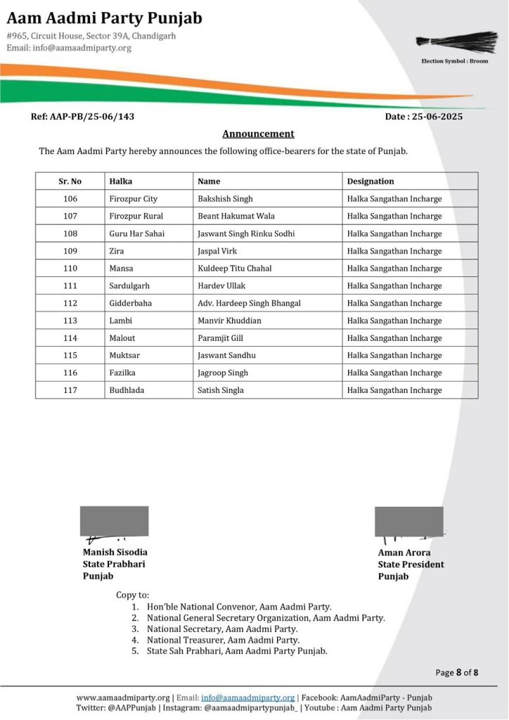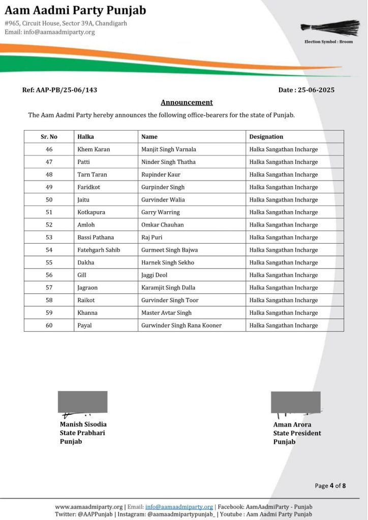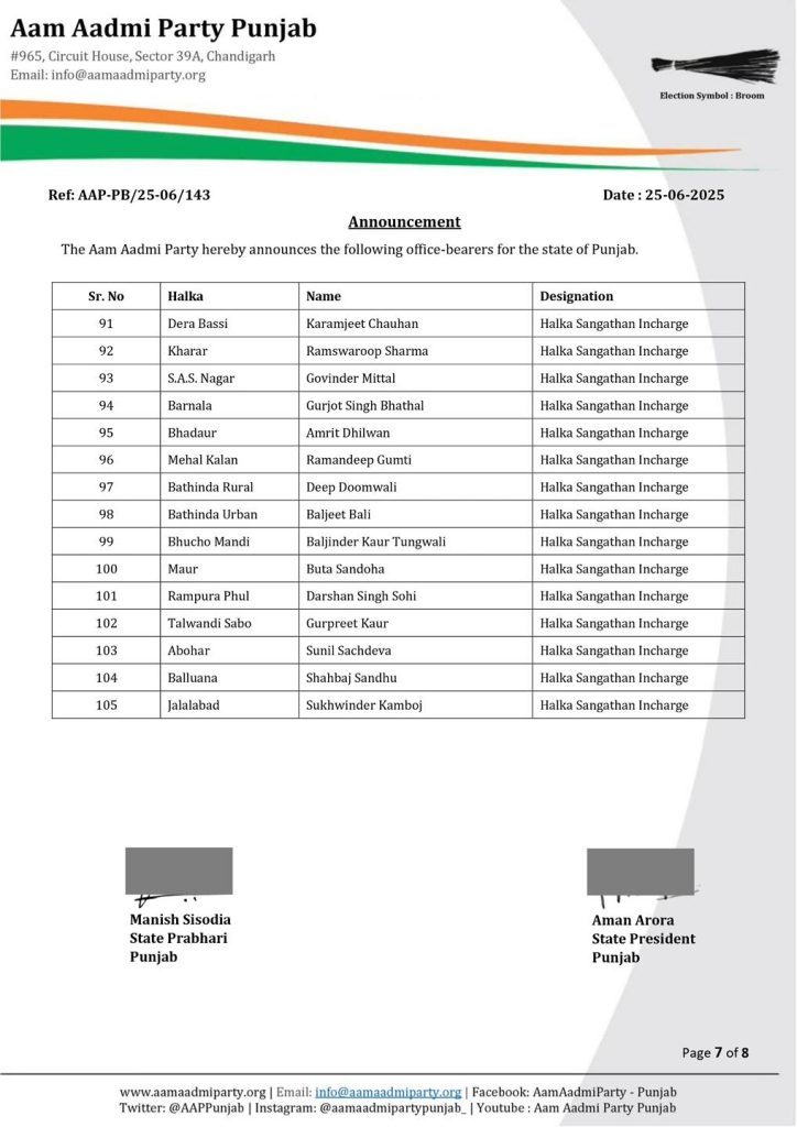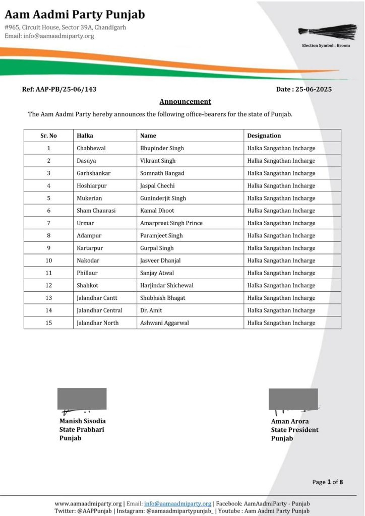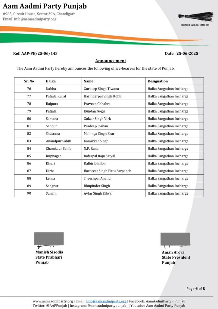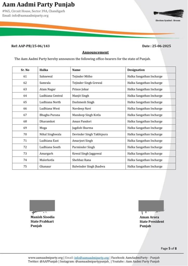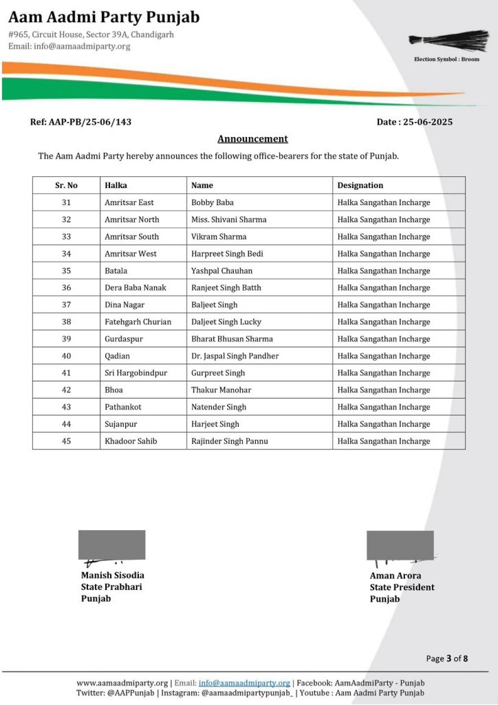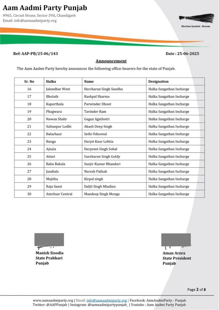 ਆਮ ਆਦਮੀ ਪਾਰਟੀ ਪੰਜਾਬ ਵੱਲੋਂ ਨਵੇਂ ਹਲਕਾ ਇੰਚਾਰਜਾਂ ਨੂੰ ਜ਼ਿੰਮੇਵਾਰੀਆਂ ਸੌਂਪਣ ਦਾ ਐਲਾਨ ਕੀਤਾ ਗਿਆ ਹੈ। ਇਸ ਤੋਂ ਇਲਾਵਾ ਆਮ ਆਦਮੀ ਪਾਰਟੀ ਨਵੇਂ ਹਲਕਾ ਸੰਗਠਨ ਇੰਚਾਰਜਾਂ ਦਾ ਵੀ ਐਲਾਨ ਕੀਤਾ ਗਿਆ ਹੈ।