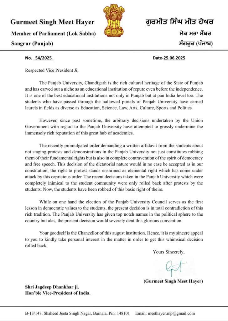 ਪੰਜਾਬ ਯੂਨੀਵਰਸਿਟੀ ਰੋਸ ਪ੍ਰਦਰਸ਼ਨਾਂ ‘ਤੇ ਪਾਬੰਦੀ ਦੇ ਲਗਾਏ ਲੋਕਤੰਤਰ ਵਿਰੋਧੀ ਫੈਸਲੇ ਖਿਲਾਫ ਸੰਗਰੂਰ ਤੋਂ ਲੋਕ ਸਭਾ ਮੈਂਬਰ ਗੁਰਮੀਤ ਸਿੰਘ ਮੀਤ ਹੇਅਰ ਨੇ ਪੰਜਾਬ ਯੂਨੀਵਰਸਿਟੀ ਦੇ ਚਾਂਸਲਰ ਜਗਦੀਪ ਧਨਖੜ ਜੋ ਦੇਸ਼ ਦੇ ਉਪ ਰਾਸ਼ਟਰਪਤੀ ਵੀ ਹਨ, ਨੂੰ ਪੱਤਰ ਲਿਖ ਕੇ ਇਹ ਫੈਸਲਾ ਵਾਪਸ ਕਰਵਾਉਣ ਦੀ ਮੰਗ ਰੱਖੀ ਹੈ।