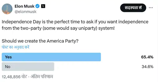 ਅਰਬਪਤੀ ਕਾਰੋਬਾਰੀ ਐਲੋਨ ਮਸਕ ਨੇ ਸ਼ਨੀਵਾਰ ਨੂੰ ਅਮਰੀਕਾ ਵਿੱਚ ਇੱਕ ਨਵੀਂ ਰਾਜਨੀਤਿਕ ਪਾਰਟੀ ਦੇ ਗਠਨ ਦਾ ਐਲਾਨ ਕੀਤਾ। ਉਸਨੇ ਇਸਦਾ ਨਾਮ ‘ਅਮਰੀਕਾ ਪਾਰਟੀ’ ਰੱਖਿਆ ਹੈ। ਮਸਕ ਨੇ ਆਪਣੇ ਸੋਸ਼ਲ ਮੀਡੀਆ ਪਲੇਟਫਾਰਮ X ‘ਤੇ ਇਹ ਜਾਣਕਾਰੀ ਦਿੱਤੀ। ਉਸਨੇ ਲਿਖਿਆ – ਅੱਜ ਅਮਰੀਕਾ ਪਾਰਟੀ ਬਣਾਈ ਜਾ ਰਹੀ ਹੈ, ਤਾਂ ਜੋ ਤੁਸੀਂ ਆਪਣੀ ਆਜ਼ਾਦੀ ਵਾਪਸ ਪ੍ਰਾਪਤ ਕਰ ਸਕੋ।” ਉਸਨੇ ਇਸ ਸੰਬੰਧੀ X ‘ਤੇ ਇੱਕ ਜਨਤਕ ਪੋਲ ਵੀ ਕਰਵਾਇਆ। ਮਸਕ ਨੇ ਆਪਣੀ ਪੋਸਟ ਵਿੱਚ ਕਿਹਾ ਕਿ ਤੁਹਾਡੇ ਵਿੱਚੋਂ 66% ਲੋਕ ਇੱਕ ਨਵੀਂ ਰਾਜਨੀਤਿਕ ਪਾਰਟੀ ਚਾਹੁੰਦੇ ਹਨ ਅਤੇ ਹੁਣ ਤੁਹਾਨੂੰ ਇਹ ਮਿਲੇਗੀ। ਜਦੋਂ ਅਮਰੀਕਾ ਨੂੰ ਬਰਬਾਦ ਕਰਨ ਅਤੇ ਭ੍ਰਿਸ਼ਟਾਚਾਰ ਦੀ ਗੱਲ ਆਉਂਦੀ ਹੈ, ਤਾਂ ਅਮਰੀਕਾ ਵਿੱਚ ਦੋਵੇਂ ਪਾਰਟੀਆਂ (ਰਿਪਬਲਿਕਨ ਅਤੇ ਡੈਮੋਕ੍ਰੇਟ) ਇੱਕੋ ਜਿਹੀਆਂ ਹਨ। ਹੁਣ ਦੇਸ਼ ਨੂੰ 2 ਪਾਰਟੀ ਪ੍ਰਣਾਲੀ ਤੋਂ ਆਜ਼ਾਦੀ ਮਿਲੇਗੀ। ਮਸਕ ਨੇ 4 ਜੁਲਾਈ ਨੂੰ ਅਮਰੀਕਾ ਦੇ ਆਜ਼ਾਦੀ ਦਿਵਸ ਦੇ ਮੌਕੇ ‘ਤੇ X ‘ਤੇ ਇੱਕ ਪੋਲ ਪੋਸਟ ਕੀਤਾ। ਇਸ ਵਿੱਚ ਉਸਨੇ ਪੁੱਛਿਆ, “ਕੀ ਤੁਸੀਂ ਦੋ-ਪਾਰਟੀ ਪ੍ਰਣਾਲੀ ਤੋਂ ਆਜ਼ਾਦੀ ਚਾਹੁੰਦੇ ਹੋ? ਕੀ ਸਾਨੂੰ ਅਮਰੀਕਾ ਪਾਰਟੀ ਬਣਾਉਣੀ ਚਾਹੀਦੀ ਹੈ?” ਪੋਲ ਨਤੀਜਿਆਂ ਵਿੱਚ, 65.4% ਲੋਕਾਂ ਨੇ “ਹਾਂ” ਅਤੇ 34.6% ਲੋਕਾਂ ਨੇ “ਨਹੀਂ” ਵੋਟ ਦਿੱਤੀ।