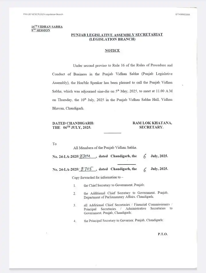 PUNJAB VIDHAN SABHA ਦਾ ਵਿਸ਼ੇਸ਼ ਇਜਲਾਸ ਪੰਜਾਬ ਸਰਕਾਰ ਵੱਲੋਂ ਸੱਦ ਲਿਆ ਗਿਆ ਹੈ। ਜਾਰੀ ਕੀਤੇ ਗਏ ਪੱਤਰ ਅਨੁਸਾਰ ਵਿਸ਼ੇਸ਼ ਇਜਲਾਸ 10 ਜੁਲਾਈ ਨੂੰ ਸੱਦਿਆ ਗਿਆ ਹੈ