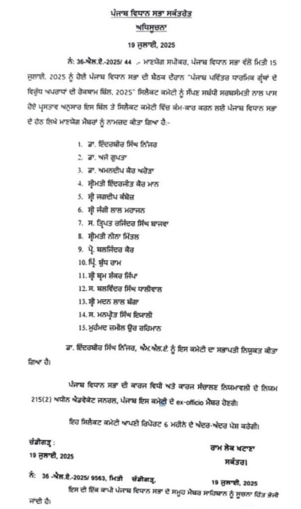 ਬੇਅਦਬੀ ਬਿੱਲ ’ਤੇ ਬਣੀ ਸਿਲੈਕਟ ਕਮੇਟੀ ਦੇ ਮੈਂਬਰਾਂ ਦਾ ਐਲਾਨ ਚੰਡੀਗੜ੍ਹ ਪੰਜਾਬ ਜੁਲਾਈ 19, 2025ਜੁਲਾਈ 19, 2025BolePunjab.comLeave a Comment on ਬੇਅਦਬੀ ਬਿੱਲ ’ਤੇ ਬਣੀ ਸਿਲੈਕਟ ਕਮੇਟੀ ਦੇ ਮੈਂਬਰਾਂ ਦਾ ਐਲਾਨ ਚੰਡੀਗੜ੍ਹ 19 ਜੁਲਾਈ ,ਬੋਲੇ ਪੰਜਾਬ ਬਿਊਰੋ; ਪੰਜਾਬ ਵਿਧਾਨ ਸਭਾ ਵਿੱਚ ਪੰਜਾਬ ਪਵਿੱਤਰ ਧਾਰਮਿਕ ਗ੍ਰੰਥਾਂ ਦੇ ਵਿਰੁੱਧ ਅਪਰਾਧਾਂ ਦੀ ਰੋਕਥਾਮ ਬਿੱਲ, 2025 ਪੇਸ਼ ਕੀਤਾ ਗਿਆ ਸੀ, ਜਿਸ ਨੂੰ ਸਿਲੈਕਟ ਕਮੇਟੀ ਕੋਲ ਭੇਜਣ ਦਾ ਫੈਸਲਾ ਕੀਤਾ ਗਿਆ ਸੀ। ਹੁਣ ਸਿਲੈਕਟ ਕਮੇਟੀ ਦੇ ਮੈਂਬਰਾਂ ਦਾ ਐਲਾਨ ਕਰ ਦਿੱਤਾ ਗਿਆ ਹੈ। Related Postਪੰਜਾਬ ਨੇ ਸਕੂਲ ਅਧਿਆਪਕਾਂ ਨੂੰ ਕਰੀਅਰ ਮੈਂਟਰ ਵਜੋਂ ਸਿਖਲਾਈ ਦੇਣ ਲਈ ਆਈ.ਆਈ.ਟੀ. ਮਦਰਾਸ ਨਾਲ ਹੱਥ ਮਿਲਾਇਆਦਸੰਬਰ 5, 2025ਪੰਜਾਬ ਵਿੱਚ ਜ਼ਿਲ੍ਹਾ ਪ੍ਰੀਸ਼ਦ ਚੋਣਾਂ ਨੂੰ ਲੈ ਕੇ ਕਾਂਗਰਸ ਨੇ ਹਾਈ ਕੋਰਟ ਦਾ ਦਰਵਾਜ਼ਾ ਖੜਕਾਇਆਦਸੰਬਰ 5, 2025ਚੰਡੀਗੜ੍ਹ ਪੁਲਿਸ ਦੇ ਸ਼ਰਾਬੀ ASI ਨੇ 10 ਵਾਹਨਾਂ ਨੂੰ ਮਾਰੀ ਟੱਕਰਦਸੰਬਰ 5, 2025Latest Newsਪੰਜਾਬ ਨੇ ਸਕੂਲ ਅਧਿਆਪਕਾਂ ਨੂੰ ਕਰੀਅਰ ਮੈਂਟਰ ਵਜੋਂ ਸਿਖਲਾਈ ਦੇਣ ਲਈ ਆਈ.ਆਈ.ਟੀ. ਮਦਰਾਸ ਨਾਲ ਹੱਥ ਮਿਲਾਇਆਸੰਸਦ ਮੈਂਬਰ ਸ਼੍ਰੀ ਮਨੀਸ਼ ਤਿਵਾੜੀ ਨੇ ਲੋਕ ਸਭਾ ਵਿੱਚ ਹਰਿਆਣਾ, ਪੰਜਾਬ ਅਤੇ ਹਿਮਾਚਲ ਪ੍ਰਦੇਸ਼ ਦੇ ਡੈਮਾਂ ਦੀ ਡੀ-ਸਿਲਟਿੰਗ ਅਤੇ ਘਟਦੀ ਸਟੋਰੇਜ ਸਮਰੱਥਾ ਦਾ ਮੁੱਦਾ ਉਠਾਇਆਮੁੱਖ ਪ੍ਰਸ਼ਾਸ਼ਕ ਪੁੱਡਾ ਮੈਡਮ ਨੀਰੂ ਕਤਿਆਲ ਗੁਪਤਾ ਦੇ ਦਫਤਰ ਪੁੱਡਾ ਭਵਨ ਮੋਹਾਲੀ ਵਿਖੇ ਲੜੀਵਾਰ ਭੁੱਖ ਹੜਤਾਲਪੰਜਾਬ ਵਿੱਚ ਜ਼ਿਲ੍ਹਾ ਪ੍ਰੀਸ਼ਦ ਚੋਣਾਂ ਨੂੰ ਲੈ ਕੇ ਕਾਂਗਰਸ ਨੇ ਹਾਈ ਕੋਰਟ ਦਾ ਦਰਵਾਜ਼ਾ ਖੜਕਾਇਆਬਿਜਲੀ ਸੋਧ ਬਿਲ ਤੇ ਨਵੇਂ ਬੀਜ ਬਿੱਲ ਖਿਲਾਫ ਕਿਰਤੀ ਕਿਸਾਨ ਮੋਰਚਾ ਦੀ ਹੋਈ ਮੀਟਿੰਗPreviousNextLatest Newsਪੰਜਾਬ ਨੇ ਸਕੂਲ ਅਧਿਆਪਕਾਂ ਨੂੰ ਕਰੀਅਰ ਮੈਂਟਰ ਵਜੋਂ ਸਿਖਲਾਈ ਦੇਣ ਲਈ ਆਈ.ਆਈ.ਟੀ. ਮਦਰਾਸ ਨਾਲ ਹੱਥ ਮਿਲਾਇਆਸੰਸਦ ਮੈਂਬਰ ਸ਼੍ਰੀ ਮਨੀਸ਼ ਤਿਵਾੜੀ ਨੇ ਲੋਕ ਸਭਾ ਵਿੱਚ ਹਰਿਆਣਾ, ਪੰਜਾਬ ਅਤੇ ਹਿਮਾਚਲ ਪ੍ਰਦੇਸ਼ ਦੇ ਡੈਮਾਂ ਦੀ ਡੀ-ਸਿਲਟਿੰਗ ਅਤੇ ਘਟਦੀ ਸਟੋਰੇਜ ਸਮਰੱਥਾ ਦਾ ਮੁੱਦਾ ਉਠਾਇਆਮੁੱਖ ਪ੍ਰਸ਼ਾਸ਼ਕ ਪੁੱਡਾ ਮੈਡਮ ਨੀਰੂ ਕਤਿਆਲ ਗੁਪਤਾ ਦੇ ਦਫਤਰ ਪੁੱਡਾ ਭਵਨ ਮੋਹਾਲੀ ਵਿਖੇ ਲੜੀਵਾਰ ਭੁੱਖ ਹੜਤਾਲਪੰਜਾਬ ਵਿੱਚ ਜ਼ਿਲ੍ਹਾ ਪ੍ਰੀਸ਼ਦ ਚੋਣਾਂ ਨੂੰ ਲੈ ਕੇ ਕਾਂਗਰਸ ਨੇ ਹਾਈ ਕੋਰਟ ਦਾ ਦਰਵਾਜ਼ਾ ਖੜਕਾਇਆਬਿਜਲੀ ਸੋਧ ਬਿਲ ਤੇ ਨਵੇਂ ਬੀਜ ਬਿੱਲ ਖਿਲਾਫ ਕਿਰਤੀ ਕਿਸਾਨ ਮੋਰਚਾ ਦੀ ਹੋਈ ਮੀਟਿੰਗਪਾਈਟੈਕਸ ਵਿਖੇ ਅਪਾਹਜਾਂ ਅਤੇ ਬਜ਼ੁਰਗਾਂ ਲਈ ਵ੍ਹੀਲਚੇਅਰ ਦੀ ਸਹੂਲਤਚੰਡੀਗੜ੍ਹ ਪੁਲਿਸ ਦੇ ਸ਼ਰਾਬੀ ASI ਨੇ 10 ਵਾਹਨਾਂ ਨੂੰ ਮਾਰੀ ਟੱਕਰਪੰਜਾਬ ਵਿੱਚ ਰੇਲਵੇ ਪਟੜੀਆਂ ‘ਤੇ ਕਿਸਾਨਾਂ ਅਤੇ ਪੁਲਿਸ ਵਿਚਕਾਰ ਝੜਪਾਂਦੇਸ਼ ਭਗਤ ਯੂਨੀਵਰਸਿਟੀ ਨੇ ਕਰਵਾਈ ਅੰਤਰਰਾਸ਼ਟਰੀ ਕਾਨਫਰੰਸ ਅਤੇ ਅਗਾਂਹਵਧੂ ਕਿਸਾਨ ਮਿਲਣੀਆਮ ਆਦਮੀ ਪਾਰਟੀ ਵੱਲੋਂ ਨਾਮਜ਼ਦਗੀ ਪੱਤਰ ਦਾਖਲ ਕਰਨ ਦੌਰਾਨ ਸ਼ਰੇਆਮ ਗੁੰਡਾਗਰਦੀ ਦੀਆਂ ਘਟਨਾਵਾਂ ਅਤੇ ਚੋਣ ਪ੍ਰਕਿਰਿਆ ਦੌਰਾਨ ਸਰਕਾਰੀ ਮਸ਼ੀਨਰੀ ਦੀ ਕਥਿਤ ਦੁਰਵਰਤੋਂ ਲੋਕਤੰਤਰ ਲਈ ਖ਼ਤਰਨਾਕ – ਕੈਂਥ ਪੁਲਿਸ ਮੁਲਾਜ਼ਮਾਂ ‘ਤੇ ਵਰਦੀ ‘ਚ ਰੀਲਾਂ ਬਣਾਉਣ ‘ਤੇ ਲੱਗੀ ਪਾਬੰਦੀਜਲੰਧਰ ‘ਚ ਰੋਡਵੇਜ਼ ਬੱਸ ਨੇ ਸਕੂਟਰ ਨੂੰ ਟੱਕਰ ਮਾਰੀ, ਪੁੱਤ ਦੀ ਮੌਤ ਪਿਤਾ ਗੰਭੀਰ ਜ਼ਖ਼ਮੀ PreviousNext
