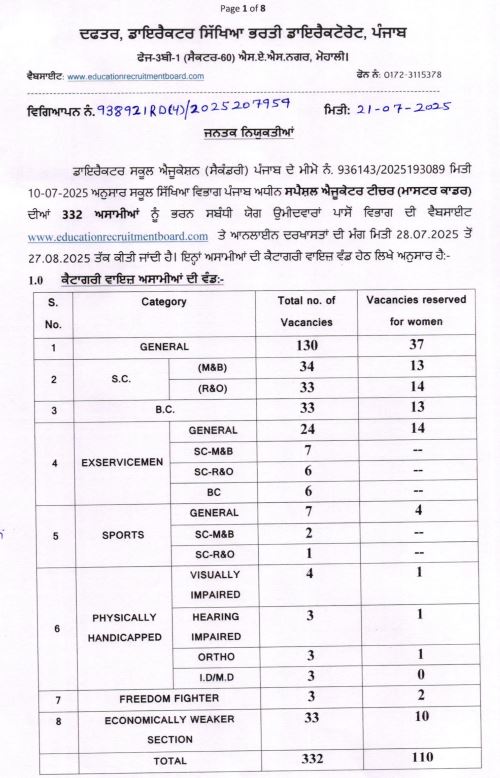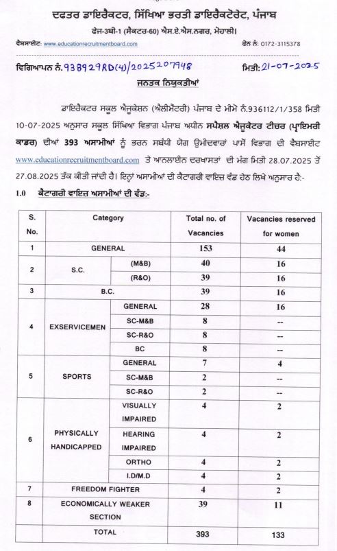 ਪੰਜਾਬ ਸਰਕਾਰ (punjab govt) ਵੱਲੋਂ ਸਰਕਾਰੀ ਸਕੂਲਾਂ ਵਾਸਤੇ 725 ਅਧਿਆਪਕਾਂ ਦੀਆਂ ਅਸਾਮੀਆਂ (vacancies) ਕੱਢੀਆਂ ਗਈਆਂ ਹਨ। ਸਰਕਾਰ ਵੱਲੋਂ ਅਧਿਆਪਕਾਂ ਦੀ ਭਰਤੀ ਲਈ ਆਨਲਾਈਨ ਅਰਜ਼ੀਆਂ ਦੀ ਮੰਗ ਕੀਤੀ ਗਈ ਹੈ। ਸਕੂਲ ਸਿੱਖਿਆ ਵਿਭਾਗ ਪੰਜਾਬ (punjab school education department) ਅਧੀਨ ਸਪੈਸ਼ਲ ਐਜੂਕੇਟਰ ਟੀਚਰ (ਪ੍ਰਾਇਮਰੀ ਕਾਡਰ) ਅਤੇ ਮਾਸਟਰ ਕਾਡਰ ਲਈ ਕੱਢੀਆਂ ਗਈਆਂ ਹਨ। ਯੋਗ ਉਮੀਦਵਾਰ 28 ਜੁਲਾਈ 2025 ਤੋਂ 27 ਅਗਸਤ 2025 ਤੱਕ ਆਨਲਾਈਨ ਅਪਲਾਈ ਕਰ ਸਕਦੇ ਹਨ।