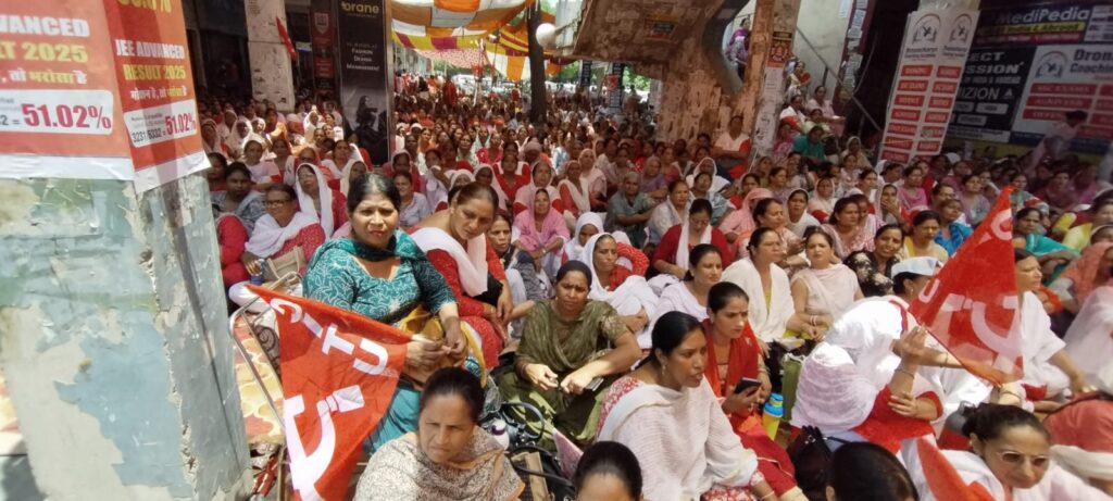 ਈ-ਕੇਵਾਈਸੀ ਅਤੇ ਐਫ ਆਰ ਐਸ ਦੇ ਵਿਰੁੱਧ ਅੱਜ ਪੰਜਾਬ ਦੀਆਂ ਹਜ਼ਾਰਾਂ ਆਂਗਣਵਾੜੀ ਵਰਕਰਾਂ ਨੇ ਚੰਡੀਗੜ੍ਹ ਵਿਚ ਹਜ਼ਾਰਾਂ ਦੀ ਗਿਣਤੀ ਵਿੱਚ ਇਕੱਠੀਆਂ ਹੋ ਕੇ ਸਰਕਾਰ ਵਿਰੁੱਧ ਜ਼ਬਰਦਸਤ ਵਿਰੋਧ ਕੀਤਾ। ਆਂਗਣਵਾੜੀ ਮੁਲਾਜ਼ਮ ਯੂਨੀਅਨ ਪੰਜਾਬ (ਸੀਟੂ) ਦੇ ਬੈਨਰ ਹੇਠ ਅੱਜ ਹਜ਼ਾਰਾਂ ਦੀ ਗਿਣਤੀ ਵਿਚ ਪੰਜਾਬ ਦੇ ਕੋਨੇ ਕੋਨੇ ਤੋਂ ਆਂਗਣਵਾੜੀ ਵਰਕਰਾਂ ਤੇ ਹੈਲਪਰਾਂ ਪਹੁੰਚੀਆਂ। ਅੱਜ ਆਂਗਣਵਾੜੀ ਮੁਲਾਜ਼ਮ ਯੂਨੀਅਨ ਵੱਲੋਂ ਆਪਣੇ ਅਤੇ ਲਾਭਪਾਤਰੀਆਂ ਦੇ ਅਧਿਕਾਰਾਂ ਦੀ ਰਾਖੀ ਲਈ ਇਸਤਰੀ ਤੇ ਬਾਲ ਵਿਕਾਸ ਵਿਭਾਗ ਦੀ ਤਾਨਾਸ਼ਾਹੀ ਦੇ ਖਿਲਾਫ ਝੰਡੇ ਅਤੇ ਬੈਨਰ ਲੈ ਕੇ ਆਪਣੇ ਰੋਸ ਦਾ ਪ੍ਰਗਟਾਵਾ ਕਰਨ ਲਈ ਸੂਬਾ ਪ੍ਰਧਾਨ ਹਰਜੀਤ ਕੌਰ ਪੰਜੋਲਾ ਦੀ ਅਗਵਾਈ ਵਿੱਚ ਹਜ਼ਾਰਾਂ ਦੀ ਗਿਣਤੀ ਵਿੱਚ ਇਕੱਠੀਆਂ ਹੋਈਆਂ ਆਂਗਣਵਾੜੀ ਵਰਕਰਾਂ ਹੈਲਪਰਾਂ ਨੇ ਆਕਾਸ਼ ਗੰਜਾਊ ਨਾਰਿਆਂ ਨਾਲ ਆਪਣਾ ਦਰਦ ਸੁਣਾਉਂਦੇ ਹੋਏ ਕਿਹਾ ਕਿ ਸਮਾਜਿਕ ਸੁਰੱਖਿਆ ਇਸਤਰੀ ਤੇ ਬਾਲ ਵਿਕਾਸ ਵਿਭਾਗ ਵੱਲੋਂ ਆਂਗਣਵਾੜੀ ਵਰਕਰਾਂ ਹੈਲਪਰਾ ਤੋਂ ਬਿਨਾਂ ਹਥਿਆਰ ਦਿੱਤੇ ਜਬਰਨ ਕੰਮ ਕਰਾਉਣ ਲਈ ਤਾਨਾਸ਼ਾਹੀ ਰਵਈਆ ਅਪਣਾਇਆ ਹੋਇਆ ਹੈ । ਜੋ ਬਿਲਕੁਲ ਵੀ ਬਰਦਾਸ਼ਤ ਨਹੀਂ ਕੀਤਾ ਜਾਵੇਗਾ । ਸਰਕਾਰ ਵੱਲੋਂ ਮੁੱਖ ਮੰਤਰੀ ਨਾਲ 28 ਜੁਲਾਈ ਦੀ ਮੀਟਿੰਗ ਦਾ ਸਮਾਂ ਦਿੱਤਾ ਗਿਆ ਯੂਨੀਅਨ ਨੇ ਗਵਰਨਰ ਹਾਊਸ ਵੱਲ ਪਹੁੰਚ ਕੇ ਮੰਗ ਪੱਤਰ ਦੇਣਾ ਸੀ, ਇਸ ਲਈ ਗਵਰਨਰ ਹਾਊਸ ਵੱਲੋਂ ਐਸਡੀਐਮ ਮੈਡਮ ਨੇ ਮਤੇ ਪ੍ਰਾਪਤ ਕੀਤੇ ਅਤੇ ਮੰਗ ਪੱਤਰ ਲੈ ਗਿਆ।