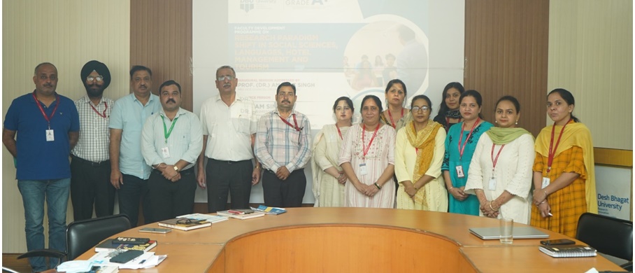 ਦੇਸ਼ ਭਗਤ ਯੂਨੀਵਰਸਿਟੀ ਵਿੱਚ ਫੈਕਲਟੀ ਆਫ ਸੋਸ਼ਲ ਸਾਇੰਸਿਜ਼ ਅਤੇ ਲੈਗੂਏਜ਼ਸ ਵੱਲੋਂ ਹੋਟਲ ਮੈਨੇਜਮੈਂਟ ਅਤੇ ਸੈਰ-ਸਪਾਟਾ ਫੈਕਲਟੀ ਦੇ ਸਹਿਯੋਗ ਨਾਲ, ਸੋਸ਼ਲ ਸਾਇੰਸਿਜ਼ ਅਤੇ ਲੈਗੂਏਜ਼ਸ, ਹੋਟਲ ਮੈਨੇਜਮੈਂਟ ਅਤੇ ਸੈਰ-ਸਪਾਟਾ ਵਿੱਚ ਖੋਜ ਪੈਰਾਡਾਈਮ ਸ਼ਿਫਟ’ ਸਿਰਲੇਖ ਹੇਠ ਇੱਕ ਫੈਕਲਟੀ ਵਿਕਾਸ ਪ੍ਰੋਗਰਾਮ ਦਾ ਆਯੋਜਨ ਕੀਤਾ ਗਿਆ। ਇਸ ਪ੍ਰੋਗਰਾਮ ਦਾ ਉਦੇਸ਼ ਅੰਤਰ-ਅਨੁਸ਼ਾਸਨੀ ਖੇਤਰਾਂ ਵਿੱਚ ਵਿਕਸਤ ਹੋ ਰਹੀਆਂ ਖੋਜ ਵਿਧੀਆਂ, ਸਿਧਾਂਤਕ ਢਾਂਚੇ ਅਤੇ ਗਿਆਨ-ਵਿਗਿਆਨਕ ਪਹੁੰਚਾਂ ਬਾਰੇ ਭਾਗੀਦਾਰਾਂ ਦੀ ਸਮਝ ਨੂੰ ਵਧਾਉਣਾ ਸੀ।