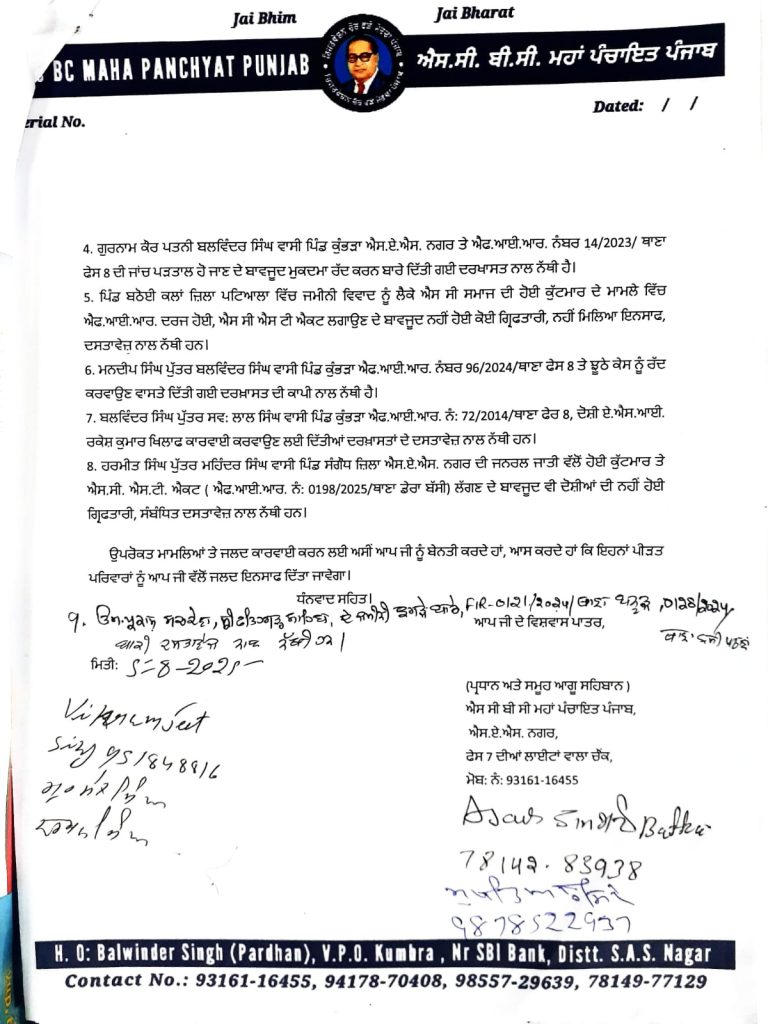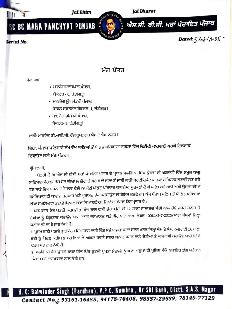 ਐਸ ਸੀ ਬੀਸੀ ਮਹਾ ਪੰਚਾਇਤ ਪੰਜਾਬ ਵੱਲੋਂ ਮੋਹਾਲੀ ਫੇਸ 7 ਦੀਆਂ ਲਾਈਟਾਂ ਤੇ ਅੱਜ ਪੰਜਾਬ ਪੁਲਿਸ ਤੋਂ ਇਨਸਾਫ ਨਾ ਮਿਲਣ ਵਾਲੇ ਕਰੀਬ 15 ਪੀੜਿਤ ਪਰਿਵਾਰਾਂ ਨੇ ਪ੍ਰੈਸ ਸਾਹਮਣੇ ਆਪਣੀ ਹੱਡਬੀਤੀ ਦੱਸੀ ਤੇ ਪੰਜਾਬ ਪੁਲਿਸ ਉੱਤੇ ਸੁਣਵਾਈ ਨਾ ਕਰਨ ਦੇ ਦੋਸ਼ ਲਗਾਏ। ਇਸ ਮੌਕੇ ਮੋਰਚਾ ਪ੍ਰਧਾਨ ਬਲਵਿੰਦਰ ਸਿੰਘ ਕੁੰਭੜਾ ਦੀ ਅਗਵਾਈ ਵਿੱਚ ਮੁਹਾਲੀ ਫੇਸ ਸੱਤ ਦੀਆਂ ਲਾਈਟਾਂ ਤੇ ਪੰਜਾਬ ਦੇ ਮੁੱਖ ਮੰਤਰੀ ਭਗਵੰਤ ਮਾਨ ਦਾ ਪੁਤਲਾ ਫੂਕਿਆ ਗਿਆ ਤੇ ਪੰਜਾਬ ਸਰਕਾਰ ਅਤੇ ਪੰਜਾਬ ਪੁਲਿਸ ਵਿਰੁੱਧ ਜੰਮਕੇ ਨਾਅਰੇਬਾਜ਼ੀ ਕੀਤੀ ਗਈ। ਇਸ ਮੌਕੇ ਇਕੱਠੇ ਹੋਏ ਪੀੜਤ ਪਰਿਵਾਰਾਂ ਵਿੱਚ ਭਾਰੀ ਰੋਸ ਸੀ ਕਿ ਜਿਸ ਸਰਕਾਰ ਨੂੰ ਅਸੀਂ ਚੁਣਿਆ ਉਸੇ ਸਰਕਾਰ ਦੇ ਕਾਰਜਕਾਲ ਵਿੱਚ ਸਾਡੇ ਤੇ ਅੱਤਿਆਚਾਰ ਹੋ ਰਹੇ ਹਨ।
