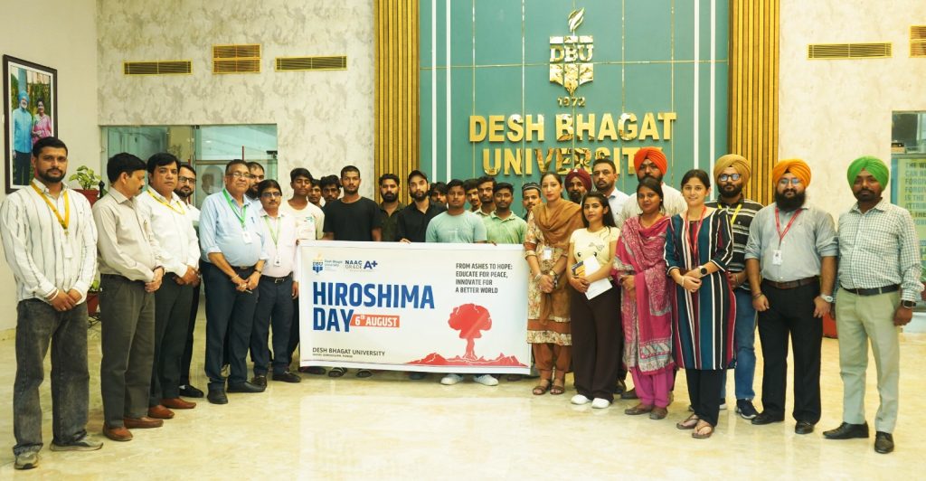 ਦੇਸ਼ ਭਗਤ ਯੂਨੀਵਰਸਿਟੀ ਵੱਲੋਂ ‘ਸੁਆਹ ਤੋਂ ਉਮੀਦ ਤੱਕ: ਸ਼ਾਂਤੀ ਲਈ ਸਿੱਖਿਆ, ਇੱਕ ਬਿਹਤਰ ਦੁਨੀਆ ਲਈ ਨਵੀਨਤਾ ’ ਥੀਮ ਹੇਠ ਹੀਰੋਸ਼ੀਮਾ ਦਿਵਸ ਮਨਾਇਆ ਗਿਆ। ਇਸ ਸਮਾਗਮ ਵਿੱਚ 6 ਅਗਸਤ, 1945 ਨੂੰ ਹੀਰੋਸ਼ੀਮਾ ’ਤੇ ਹੋਏ ਪਰਮਾਣੂ ਬੰਬ ਧਮਾਕੇ ਦੇ ਪੀੜਤਾਂ ਨੂੰ ਸ਼ਰਧਾਂਜਲੀ ਦਿੱਤੀ ਗਈ, ਜਦੋਂਕਿ ਵਿਦਿਆਰਥੀਆਂ ਨੂੰ ਇੱਕ ਸ਼ਾਂਤੀਪੂਰਨ ਅਤੇ ਪ੍ਰਗਤੀਸ਼ੀਲ ਭਵਿੱਖ ਵੱਲ ਕੰਮ ਕਰਨ ਲਈ ਉਤਸ਼ਾਹਿਤ ਕੀਤਾ ਗਿਆ।