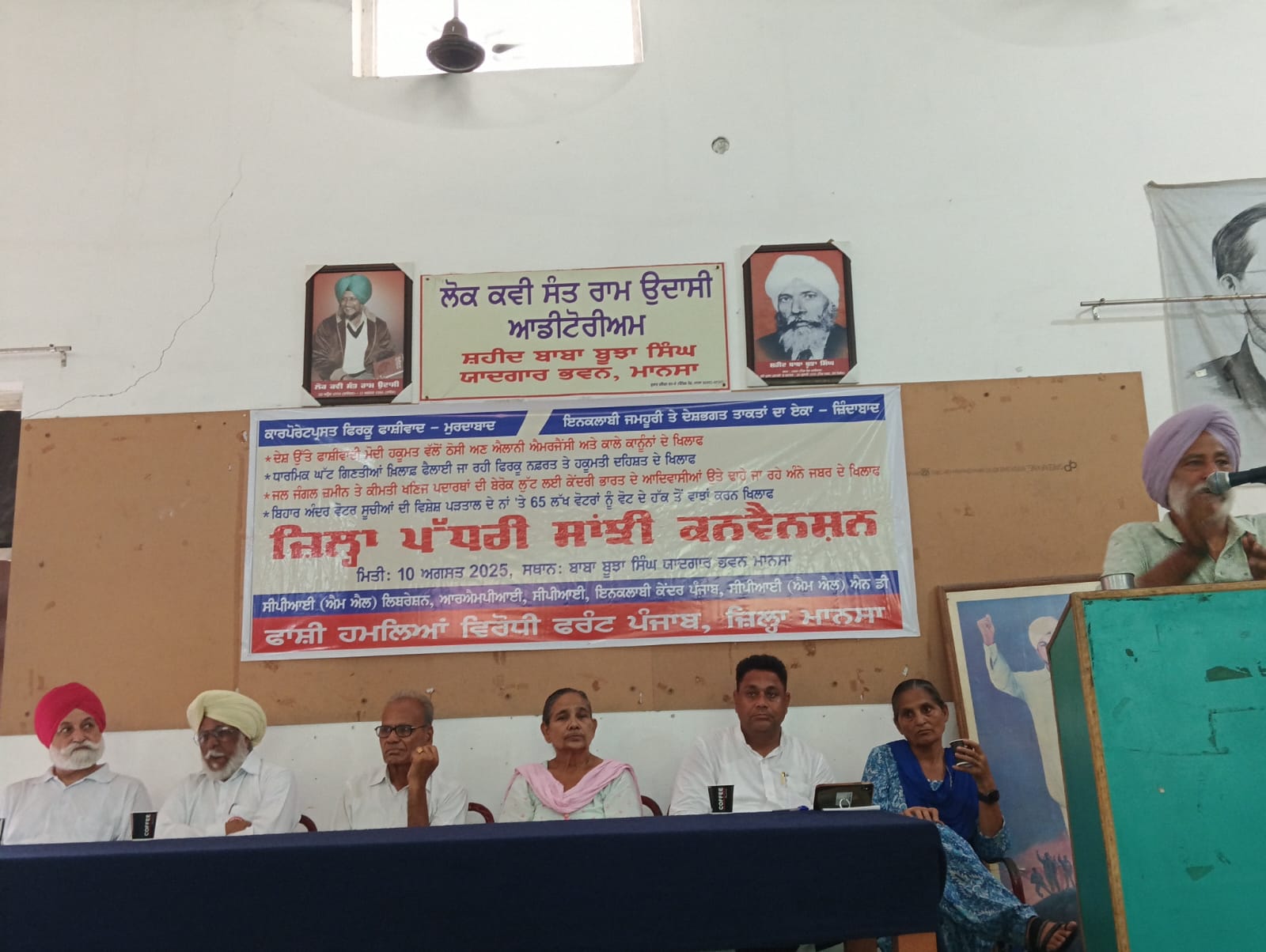 ਫਾਸ਼ੀਵਾਦੀ ਹਮਲਿਆਂ ਵਿਰੋਧੀ ਫਰੰਟ ਪੰਜਾਬ ਵਲੋਂ ਅੱਜ ਬਾਬਾ ਬੂਝਾ ਸਿੰਘ ਯਾਦਗਾਰ ਭਵਨ ਮਾਨਸਾ ਵਿਖੇ ਇਕ ਜ਼ਿਲ੍ਹਾ ਪੱਧਰੀ ਕਨਵੈਨਸ਼ਨ ਕੀਤੀ ਗਈ। ਕਨਵੈਨਸ਼ਨ ਦੀ ਪ੍ਰਧਾਨਗੀ ਕਾਮਰੇਡ ਬਲਵਿੰਦਰ ਕੌਰ ਖਾਰਾ, ਮਾਸਟਰ ਛੱਜੂ ਰਾਮ ਰਿਸ਼ੀ, ਕਾਮਰੇਡ ਰਤਨ ਭੋਲਾ ਤੇ ਜਗਮੇਲ ਸਿੰਘ ਨੇ ਕੀਤੀ।