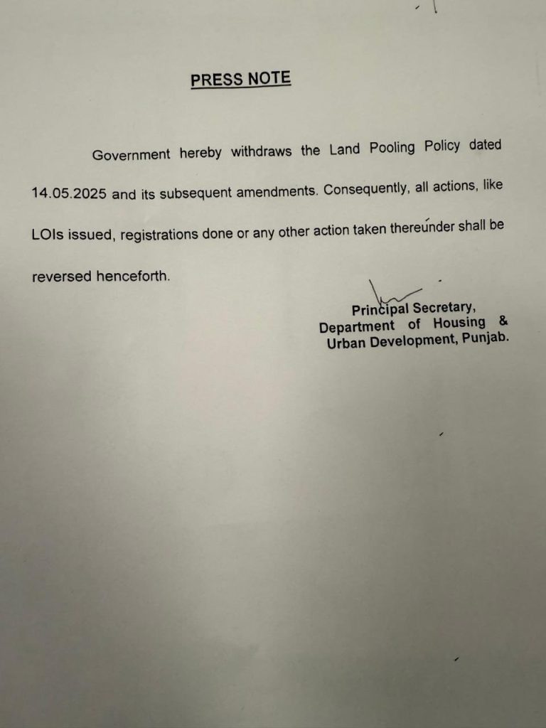 ਪੰਜਾਬ ਸਰਕਾਰ ਨੇ ਵਿਵਾਦਪੂਰਨ ਲੈਂਡ ਪੂਲਿੰਗ ਨੀਤੀ ਵਾਪਸ ਲੈ ਲਈ ਹੈ। ਇਸ ਸਬੰਧੀ ਪੰਜਾਬ ਸਰਕਾਰ ਦੇ ਹਾਊਸਿੰਗ ਅਤੇ ਸ਼ਹਿਰੀ ਵਿਕਾਸ ਦੇ ਪ੍ਰਮੁੱਖ ਸਕੱਤਰ ਨੇ ਇੱਕ ਪੱਤਰ ਜਾਰੀ ਕੀਤਾ ਹੈ। ਇਸ ਵਿੱਚ ਕਿਹਾ ਗਿਆ ਹੈ ਕਿ 14 ਮਈ, 2025 ਨੂੰ ਲਿਆਂਦੀ ਗਈ ਪੰਜਾਬ ਲੈਂਡ ਪੂਲਿੰਗ ਨੀਤੀ ਅਤੇ ਇਸ ਨਾਲ ਸਬੰਧਤ ਸੋਧਾਂ ਵਾਪਸ ਲਈਆਂ ਜਾ ਰਹੀਆਂ ਹਨ। ਇਸ ਨੀਤੀ ਤਹਿਤ ਜਾਰੀ ਕੀਤਾ ਗਿਆ ਇਰਾਦਾ ਪੱਤਰ (LOI), ਰਜਿਸਟ੍ਰੇਸ਼ਨ ਅਤੇ ਹੋਰ ਕੋਈ ਵੀ ਕੰਮ ਵਾਪਸ ਲਿਆ ਜਾਵੇ। ਤੁਹਾਨੂੰ ਦੱਸ ਦੇਈਏ ਕਿ ਪੰਜਾਬ ਦੇ ਕਿਸਾਨ ਲਗਾਤਾਰ ਇਸ ਨੀਤੀ ਦਾ ਵਿਰੋਧ ਕਰ ਰਹੇ ਸਨ। ਉਨ੍ਹਾਂ ਕਿਹਾ ਕਿ ਇਸ ਨੀਤੀ ਰਾਹੀਂ ਸਰਕਾਰ ਉਨ੍ਹਾਂ ਦੀ ਜ਼ਮੀਨ ਹੜੱਪਣਾ ਚਾਹੁੰਦੀ ਹੈ। ਇਹ ਮਾਮਲਾ ਹਾਈ ਕੋਰਟ ਵਿੱਚ ਵੀ ਪਹੁੰਚਿਆ। ਹਾਈ ਕੋਰਟ ਨੇ ਕੁਝ ਦਿਨ ਪਹਿਲਾਂ ਇਸ ਮਾਮਲੇ ਵਿੱਚ 4 ਹਫ਼ਤਿਆਂ ਦੀ ਸਟੇਅ ਲਗਾਈ ਸੀ। ਇਸ ਮਾਮਲੇ ਦੀ ਸੁਣਵਾਈ 10 ਸਤੰਬਰ ਨੂੰ ਹਾਈ ਕੋਰਟ ਵਿੱਚ ਹੋਵੇਗੀ।