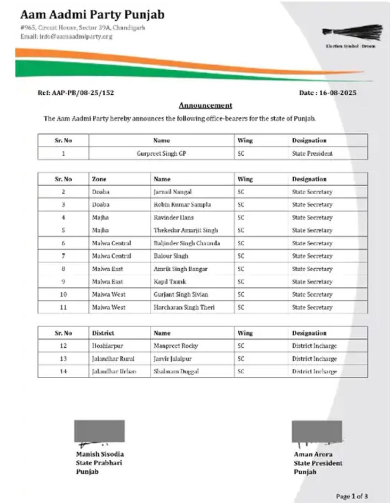 ਆਮ ਆਦਮੀ ਪਾਰਟੀ (ਆਪ) ਨੇ ਆਪਣੇ ਸੰਗਠਨ ਦਾ ਵਿਸਥਾਰ ਕੀਤਾ ਹੈ ਅਤੇ ਹੁਣ ਐਸਸੀ ਵਿੰਗ ਬਣਾਇਆ ਹੈ। ਸਾਬਕਾ ਵਿਧਾਇਕ ਅਤੇ ਫਤਿਹਗੜ੍ਹ ਸਾਹਿਬ ਲੋਕ ਸਭਾ ਉਮੀਦਵਾਰ ਗੁਰਪ੍ਰੀਤ ਸਿੰਘ ਨੂੰ ਇਸਦਾ ਪ੍ਰਧਾਨ ਨਿਯੁਕਤ ਕੀਤਾ ਗਿਆ ਹੈ।