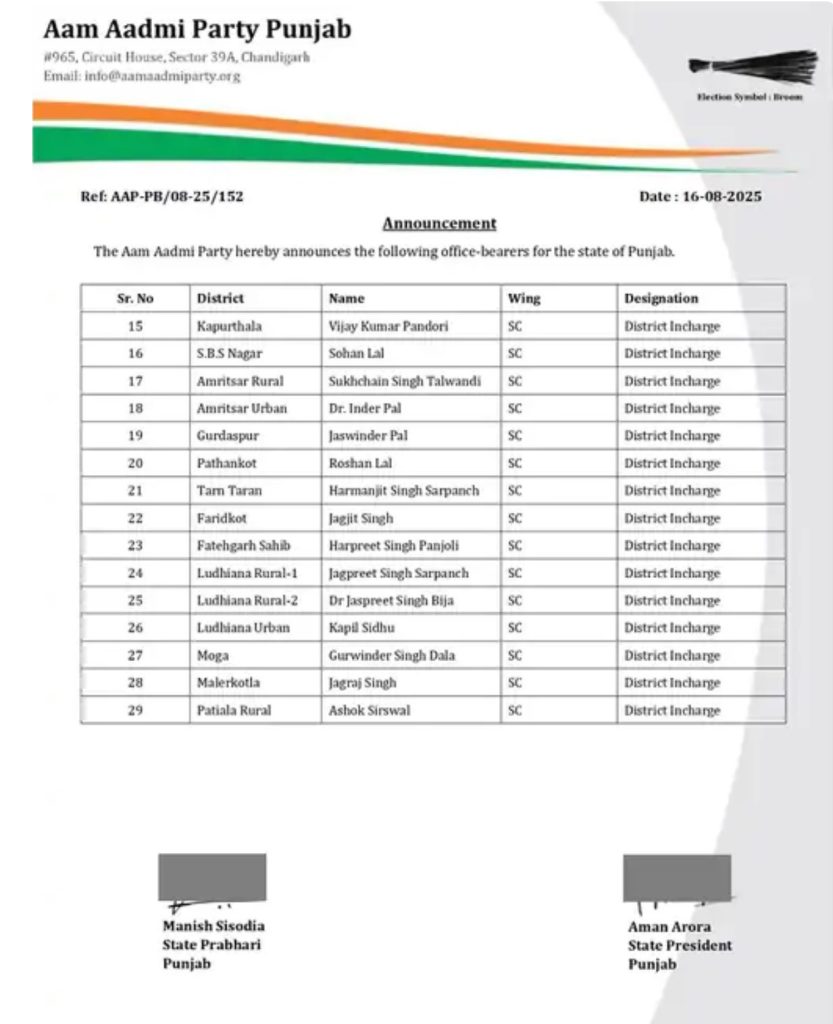 ਪਾਰਟੀ ਨੇ ਇੱਕ ਪੂਰੀ ਰਣਨੀਤੀ ਦੇ ਹਿੱਸੇ ਵਜੋਂ ਐਸਸੀ ਵਿੰਗ ਬਣਾਇਆ ਹੈ। ਦੋਆਬਾ, ਮਾਝਾ, ਮਾਲਵਾ ਸੈਂਟਰਲ, ਮਾਲਵਾ ਪੂਰਬੀ ਅਤੇ ਮਾਲਵਾ ਪੱਛਮੀ ਵਿੱਚ 11 ਸੂਬਾ ਸਕੱਤਰ ਨਿਯੁਕਤ ਕੀਤੇ ਗਏ ਹਨ ਅਤੇ ਸਾਰੇ 23 ਜ਼ਿਲ੍ਹਿਆਂ ਲਈ ਇੰਚਾਰਜ ਵੀ ਨਿਯੁਕਤ ਕੀਤੇ ਗਏ ਹਨ।