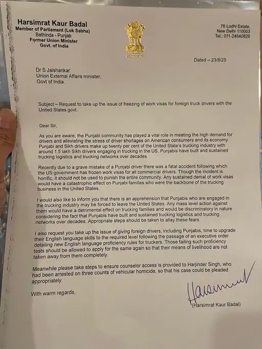ਪੰਜਾਬ ਸ਼੍ਰੋਮਣੀ ਅਕਾਲੀ ਦਲ ਦੀ ਬਠਿੰਡਾ ਤੋਂ ਸੰਸਦ ਮੈਂਬਰ ਹਰਸਿਮਰਤ ਕੌਰ ਬਾਦਲ ਨੇ ਭਾਰਤ ਦੇ ਵਿਦੇਸ਼ ਮੰਤਰੀ ਡਾ. ਐਸ. ਜੈਸ਼ੰਕਰ ਨੂੰ ਪੱਤਰ ਲਿਖ ਕੇ ਅਮਰੀਕਾ ਵਿੱਚ ਪੰਜਾਬੀ ਟਰੱਕ ਡਰਾਈਵਰਾਂ ਸਬੰਧੀ ਪੈਦਾ ਹੋਏ ਸੰਕਟ ਵਿੱਚ ਤੁਰੰਤ ਦਖਲ ਦੇਣ ਦੀ ਅਪੀਲ ਕੀਤੀ ਹੈ। ਇਸ ਦੌਰਾਨ ਹਰਜਿੰਦਰ ਸਿੰਘ ਨੂੰ ਪਹਿਲੀ ਵਾਰ ਅਮਰੀਕੀ ਅਦਾਲਤ ਵਿੱਚ ਪੇਸ਼ ਕੀਤਾ ਗਿਆ ਹੈ ਅਤੇ ਅਦਾਲਤ ਨੇ ਉਨ੍ਹਾਂ ਨੂੰ ਜ਼ਮਾਨਤ ਦੇਣ ਤੋਂ ਇਨਕਾਰ ਕਰ ਦਿੱਤਾ ਹੈ। ਹਰਸਿਮਰਤ ਬਾਦਲ ਨੇ ਕਿਹਾ ਕਿ ਇੱਕ ਪੰਜਾਬੀ ਟਰੱਕ ਡਰਾਈਵਰ ਨਾਲ ਹੋਏ ਹਾਲ ਹੀ ਵਿੱਚ ਹੋਏ ਸੜਕ ਹਾਦਸੇ ਤੋਂ ਬਾਅਦ, ਅਮਰੀਕੀ ਸਰਕਾਰ ਨੇ ਸਾਰੇ ਵਿਦੇਸ਼ੀ ਟਰੱਕ ਡਰਾਈਵਰਾਂ ਦੇ ਵਰਕ ਵੀਜ਼ੇ ਫ੍ਰੀਜ਼ ਕਰ ਦਿੱਤੇ ਹਨ। ਹਰਸਿਮਰਤ ਕੌਰ ਨੇ ਮੰਗ ਕੀਤੀ ਕਿ ਭਾਰਤ ਸਰਕਾਰ ਅਮਰੀਕੀ ਪ੍ਰਸ਼ਾਸਨ ਨਾਲ ਗੱਲ ਕਰੇ ਅਤੇ ਇਸ ਹੁਕਮ ਨੂੰ ਵਾਪਸ ਲੈਣ ਲਈ ਪਹਿਲ ਕਰੇ। ਇੱਕ ਡਰਾਈਵਰ ਦੀ ਗਲਤੀ ਲਈ ਪੂਰੇ ਭਾਈਚਾਰੇ ਨੂੰ ਸਜ਼ਾ ਦੇਣਾ ਬੇਇਨਸਾਫ਼ੀ ਹੋਵੇਗੀ। ਪੰਜਾਬੀ ਭਾਈਚਾਰੇ ਨੇ ਦਹਾਕਿਆਂ ਤੋਂ ਅਮਰੀਕਾ ਦੇ ਟਰੱਕਿੰਗ ਲੌਜਿਸਟਿਕਸ ਅਤੇ ਨੈੱਟਵਰਕ ਦਾ ਨਿਰਮਾਣ ਅਤੇ ਪ੍ਰਬੰਧਨ ਕੀਤਾ ਹੈ। ਅਜਿਹੀ ਸਥਿਤੀ ਵਿੱਚ, ਉਨ੍ਹਾਂ ਵਿਰੁੱਧ ਸਮੂਹਿਕ ਕਾਰਵਾਈ ਕਰਨਾ ਵਿਤਕਰਾ ਹੋਵੇਗਾ। ਹਰਸਿਮਰਤ ਨੇ ਵਿਦੇਸ਼ ਮੰਤਰੀ ਨੂੰ ਇਹ ਵੀ ਅਪੀਲ ਕੀਤੀ ਕਿ ਉਹ ਗ੍ਰਿਫ਼ਤਾਰ ਕੀਤੇ ਗਏ ਪੰਜਾਬੀ ਡਰਾਈਵਰ ਹਰਜਿੰਦਰ ਸਿੰਘ ਨੂੰ ਤੁਰੰਤ ਕੌਂਸਲਰ ਪਹੁੰਚ ਪ੍ਰਦਾਨ ਕਰਨ, ਜਿਸ ‘ਤੇ ਤਿੰਨ ਵਾਹਨਾਂ ਦੀਆਂ ਮੌਤਾਂ ਦਾ ਦੋਸ਼ ਹੈ, ਤਾਂ ਜੋ ਉਸਦਾ ਕੇਸ ਸਹੀ ਢੰਗ ਨਾਲ ਲੜਿਆ ਜਾ ਸਕੇ