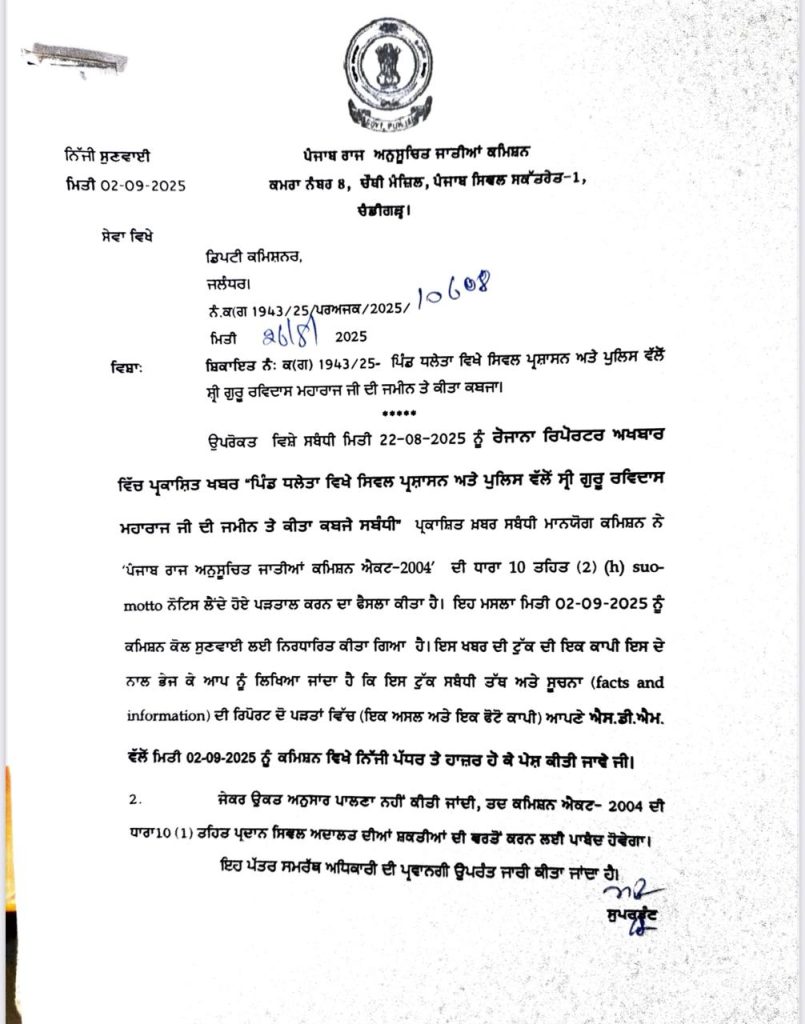 ਪੰਜਾਬ ਰਾਜ ਅਨੁਸੂਚਿਤ ਜਾਤੀਆਂ ਕਮਿਸ਼ਨ ਵੱਲੋਂ ਜਲੰਧਰ ਜ਼ਿਲ੍ਹੇ ਦੇ ਧਲੇਤਾ ਪਿੰਡ ਵਿਖੇ ਸ੍ਰੀ ਗੁਰੂ ਰਵਿਦਾਸ ਜੀ ਗੁਰੂਦਵਾਰਾ ਦੀ ਜ਼ਮੀਨ ਉੱਤੇ ਸਿਵਲ ਪ੍ਰਸ਼ਾਸ਼ਨ ਵਲੋਂ ਪੁਲਿਸ ਪ੍ਰਸ਼ਾਸ਼ਨ ਦੀ ਸਹਾਇਤਾ ਨਾਲ ਕਬਜਾ ਕਰਨ ਸਬੰਧੀ ਮਾਮਲੇ ਵਿੱਚ ਡਿਪਟੀ ਕਮਿਸ਼ਨਰ ਜਲੰਧਰ ਤੋਂ ਰਿਪੋਰਟ ਤਲਬ ਕੀਤੀ ਹੈ।