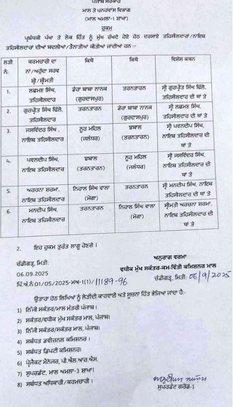 ਪੰਜਾਬ ਸਰਕਾਰ ਵਲੋਂ ਪ੍ਰਬੰਧਕੀ ਜ਼ਰੂਰਤਾਂ ਦੇ ਮੱਦੇਨਜ਼ਰ ਤਹਿਸੀਲਦਾਰਾਂ ਤੇ ਨਾਇਬ ਤਹਿਸੀਲਦਾਰਾਂ ਦੀਆਂ ਬਦਲੀਆਂ ਤੇ ਤਾਇਨਾਤੀਆਂ ਕੀਤੀਆਂ ਹਨ ਜੋ ਹੇਠ ਲਿਖੇ ਅਨੁਸਾਰ ਹਨ