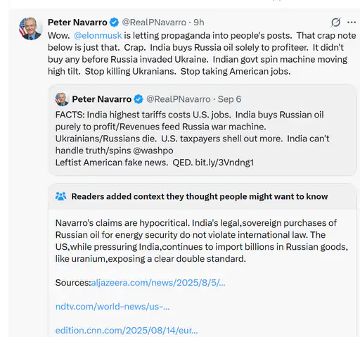 ਟੇਸਲਾ ਦੇ ਮਾਲਕ ਐਲੋਨ ਮਸਕ ਦੇ ਸੋਸ਼ਲ ਮੀਡੀਆ ਪਲੇਟਫਾਰਮ ਐਕਸ ਦੇ ਤੱਥ ਜਾਂਚ ਫੀਚਰ ਨੇ ਟਰੰਪ ਦੇ ਸਲਾਹਕਾਰ ਪੀਟਰ ਨਵਾਰੋ ਦੇ ਭਾਰਤ ਵੱਲੋਂ ਰੂਸੀ ਤੇਲ ਖਰੀਦਣ ਦੇ ਦਾਅਵਿਆਂ ਨੂੰ ਝੂਠਾ ਕਰਾਰ ਦਿੱਤਾ ਹੈ। ਐਕਸ ਨੇ ਇੱਕ ਨੋਟ ਵਿੱਚ ਲਿਖਿਆ- ਭਾਰਤ ਰੂਸ ਤੋਂ ਤੇਲ ਆਪਣੀ ਊਰਜਾ ਸੁਰੱਖਿਆ ਲਈ ਖਰੀਦਦਾ ਹੈ, ਸਿਰਫ਼ ਮੁਨਾਫ਼ੇ ਲਈ ਨਹੀਂ। ਇਹ ਖਰੀਦ ਅੰਤਰਰਾਸ਼ਟਰੀ ਪਾਬੰਦੀਆਂ ਦੀ ਉਲੰਘਣਾ ਨਹੀਂ ਕਰਦੀ। ਅਮਰੀਕਾ ਖੁਦ ਰੂਸ ਤੋਂ ਯੂਰੇਨੀਅਮ ਅਤੇ ਹੋਰ ਚੀਜ਼ਾਂ ਖਰੀਦਦਾ ਹੈ, ਭਾਰਤ ‘ਤੇ ਪਾਬੰਦੀ ਅਮਰੀਕੀ ਪ੍ਰਸ਼ਾਸਨ ਦੇ ਦੋਹਰੇ ਮਾਪਦੰਡਾਂ ਨੂੰ ਦਰਸਾਉਂਦੀ ਹੈ। ਦਰਅਸਲ, ਪੀਟਰ ਨਵਾਰੋ ਨੇ ਭਾਰਤ ‘ਤੇ ਰੂਸ ਤੋਂ ਤੇਲ ਖਰੀਦ ਕੇ ਅਤੇ ਯੂਕਰੇਨ ਯੁੱਧ ਨੂੰ ਉਤਸ਼ਾਹਿਤ ਕਰਕੇ ਮੁਨਾਫ਼ਾ ਕਮਾਉਣ ਦਾ ਗੰਭੀਰ ਦੋਸ਼ ਲਗਾਇਆ ਸੀ।