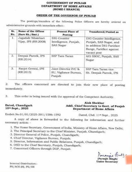 ਪੰਜਾਬ ਸਰਕਾਰ ਵੱਲੋਂ IPS ਅਧਿਕਾਰੀਆਂ ਦੀਆਂ ਬਦਲੀਆਂ ਚੰਡੀਗੜ੍ਹ ਪੰਜਾਬ ਸਤੰਬਰ 11, 2025ਸਤੰਬਰ 11, 2025BolePunjab.comLeave a Comment on ਪੰਜਾਬ ਸਰਕਾਰ ਵੱਲੋਂ IPS ਅਧਿਕਾਰੀਆਂ ਦੀਆਂ ਬਦਲੀਆਂ ਚੰਡੀਗੜ੍ਹ, 11 ਸਤੰਬਰ,ਬੋਲੇ ਪੰਜਾਬ ਬਿਊਰੋ; ਪੰਜਾਬ ਸਰਕਾਰ ਵੱਲੋਂ IPS ਅਧਿਕਾਰੀਆਂ ਦੀਆਂ ਬਦਲੀਆਂ ਕੀਤੀਆਂ ਗਈਆਂ ਹਨ। ਆਈਪੀਐਸ ਅਧਿਕਾਰੀਆਂ ਦੀਆਂ ਕੀਤੀਆਂ ਗਈਆਂ ਬਦਲੀਆਂ ਵਿੱਚ ਤਰਨ ਤਾਰਨ ਜ਼ਿਲ੍ਹੇ ਦੇ ਐਸਐਸਪੀ ਦੀ ਬਦਲੀ ਵੀ ਕੀਤੀ ਗਈ ਹੈ। Related Postਪੰਜਾਬ ਨੇ ਸਕੂਲ ਅਧਿਆਪਕਾਂ ਨੂੰ ਕਰੀਅਰ ਮੈਂਟਰ ਵਜੋਂ ਸਿਖਲਾਈ ਦੇਣ ਲਈ ਆਈ.ਆਈ.ਟੀ. ਮਦਰਾਸ ਨਾਲ ਹੱਥ ਮਿਲਾਇਆਦਸੰਬਰ 5, 2025ਪੰਜਾਬ ਵਿੱਚ ਜ਼ਿਲ੍ਹਾ ਪ੍ਰੀਸ਼ਦ ਚੋਣਾਂ ਨੂੰ ਲੈ ਕੇ ਕਾਂਗਰਸ ਨੇ ਹਾਈ ਕੋਰਟ ਦਾ ਦਰਵਾਜ਼ਾ ਖੜਕਾਇਆਦਸੰਬਰ 5, 2025ਚੰਡੀਗੜ੍ਹ ਪੁਲਿਸ ਦੇ ਸ਼ਰਾਬੀ ASI ਨੇ 10 ਵਾਹਨਾਂ ਨੂੰ ਮਾਰੀ ਟੱਕਰਦਸੰਬਰ 5, 2025Latest Newsਪੰਜਾਬ ਨੇ ਸਕੂਲ ਅਧਿਆਪਕਾਂ ਨੂੰ ਕਰੀਅਰ ਮੈਂਟਰ ਵਜੋਂ ਸਿਖਲਾਈ ਦੇਣ ਲਈ ਆਈ.ਆਈ.ਟੀ. ਮਦਰਾਸ ਨਾਲ ਹੱਥ ਮਿਲਾਇਆਸੰਸਦ ਮੈਂਬਰ ਸ਼੍ਰੀ ਮਨੀਸ਼ ਤਿਵਾੜੀ ਨੇ ਲੋਕ ਸਭਾ ਵਿੱਚ ਹਰਿਆਣਾ, ਪੰਜਾਬ ਅਤੇ ਹਿਮਾਚਲ ਪ੍ਰਦੇਸ਼ ਦੇ ਡੈਮਾਂ ਦੀ ਡੀ-ਸਿਲਟਿੰਗ ਅਤੇ ਘਟਦੀ ਸਟੋਰੇਜ ਸਮਰੱਥਾ ਦਾ ਮੁੱਦਾ ਉਠਾਇਆਮੁੱਖ ਪ੍ਰਸ਼ਾਸ਼ਕ ਪੁੱਡਾ ਮੈਡਮ ਨੀਰੂ ਕਤਿਆਲ ਗੁਪਤਾ ਦੇ ਦਫਤਰ ਪੁੱਡਾ ਭਵਨ ਮੋਹਾਲੀ ਵਿਖੇ ਲੜੀਵਾਰ ਭੁੱਖ ਹੜਤਾਲਪੰਜਾਬ ਵਿੱਚ ਜ਼ਿਲ੍ਹਾ ਪ੍ਰੀਸ਼ਦ ਚੋਣਾਂ ਨੂੰ ਲੈ ਕੇ ਕਾਂਗਰਸ ਨੇ ਹਾਈ ਕੋਰਟ ਦਾ ਦਰਵਾਜ਼ਾ ਖੜਕਾਇਆਬਿਜਲੀ ਸੋਧ ਬਿਲ ਤੇ ਨਵੇਂ ਬੀਜ ਬਿੱਲ ਖਿਲਾਫ ਕਿਰਤੀ ਕਿਸਾਨ ਮੋਰਚਾ ਦੀ ਹੋਈ ਮੀਟਿੰਗPreviousNextLatest Newsਪੰਜਾਬ ਨੇ ਸਕੂਲ ਅਧਿਆਪਕਾਂ ਨੂੰ ਕਰੀਅਰ ਮੈਂਟਰ ਵਜੋਂ ਸਿਖਲਾਈ ਦੇਣ ਲਈ ਆਈ.ਆਈ.ਟੀ. ਮਦਰਾਸ ਨਾਲ ਹੱਥ ਮਿਲਾਇਆਸੰਸਦ ਮੈਂਬਰ ਸ਼੍ਰੀ ਮਨੀਸ਼ ਤਿਵਾੜੀ ਨੇ ਲੋਕ ਸਭਾ ਵਿੱਚ ਹਰਿਆਣਾ, ਪੰਜਾਬ ਅਤੇ ਹਿਮਾਚਲ ਪ੍ਰਦੇਸ਼ ਦੇ ਡੈਮਾਂ ਦੀ ਡੀ-ਸਿਲਟਿੰਗ ਅਤੇ ਘਟਦੀ ਸਟੋਰੇਜ ਸਮਰੱਥਾ ਦਾ ਮੁੱਦਾ ਉਠਾਇਆਮੁੱਖ ਪ੍ਰਸ਼ਾਸ਼ਕ ਪੁੱਡਾ ਮੈਡਮ ਨੀਰੂ ਕਤਿਆਲ ਗੁਪਤਾ ਦੇ ਦਫਤਰ ਪੁੱਡਾ ਭਵਨ ਮੋਹਾਲੀ ਵਿਖੇ ਲੜੀਵਾਰ ਭੁੱਖ ਹੜਤਾਲਪੰਜਾਬ ਵਿੱਚ ਜ਼ਿਲ੍ਹਾ ਪ੍ਰੀਸ਼ਦ ਚੋਣਾਂ ਨੂੰ ਲੈ ਕੇ ਕਾਂਗਰਸ ਨੇ ਹਾਈ ਕੋਰਟ ਦਾ ਦਰਵਾਜ਼ਾ ਖੜਕਾਇਆਬਿਜਲੀ ਸੋਧ ਬਿਲ ਤੇ ਨਵੇਂ ਬੀਜ ਬਿੱਲ ਖਿਲਾਫ ਕਿਰਤੀ ਕਿਸਾਨ ਮੋਰਚਾ ਦੀ ਹੋਈ ਮੀਟਿੰਗਪਾਈਟੈਕਸ ਵਿਖੇ ਅਪਾਹਜਾਂ ਅਤੇ ਬਜ਼ੁਰਗਾਂ ਲਈ ਵ੍ਹੀਲਚੇਅਰ ਦੀ ਸਹੂਲਤਚੰਡੀਗੜ੍ਹ ਪੁਲਿਸ ਦੇ ਸ਼ਰਾਬੀ ASI ਨੇ 10 ਵਾਹਨਾਂ ਨੂੰ ਮਾਰੀ ਟੱਕਰਪੰਜਾਬ ਵਿੱਚ ਰੇਲਵੇ ਪਟੜੀਆਂ ‘ਤੇ ਕਿਸਾਨਾਂ ਅਤੇ ਪੁਲਿਸ ਵਿਚਕਾਰ ਝੜਪਾਂਦੇਸ਼ ਭਗਤ ਯੂਨੀਵਰਸਿਟੀ ਨੇ ਕਰਵਾਈ ਅੰਤਰਰਾਸ਼ਟਰੀ ਕਾਨਫਰੰਸ ਅਤੇ ਅਗਾਂਹਵਧੂ ਕਿਸਾਨ ਮਿਲਣੀਆਮ ਆਦਮੀ ਪਾਰਟੀ ਵੱਲੋਂ ਨਾਮਜ਼ਦਗੀ ਪੱਤਰ ਦਾਖਲ ਕਰਨ ਦੌਰਾਨ ਸ਼ਰੇਆਮ ਗੁੰਡਾਗਰਦੀ ਦੀਆਂ ਘਟਨਾਵਾਂ ਅਤੇ ਚੋਣ ਪ੍ਰਕਿਰਿਆ ਦੌਰਾਨ ਸਰਕਾਰੀ ਮਸ਼ੀਨਰੀ ਦੀ ਕਥਿਤ ਦੁਰਵਰਤੋਂ ਲੋਕਤੰਤਰ ਲਈ ਖ਼ਤਰਨਾਕ – ਕੈਂਥ ਪੁਲਿਸ ਮੁਲਾਜ਼ਮਾਂ ‘ਤੇ ਵਰਦੀ ‘ਚ ਰੀਲਾਂ ਬਣਾਉਣ ‘ਤੇ ਲੱਗੀ ਪਾਬੰਦੀਜਲੰਧਰ ‘ਚ ਰੋਡਵੇਜ਼ ਬੱਸ ਨੇ ਸਕੂਟਰ ਨੂੰ ਟੱਕਰ ਮਾਰੀ, ਪੁੱਤ ਦੀ ਮੌਤ ਪਿਤਾ ਗੰਭੀਰ ਜ਼ਖ਼ਮੀ PreviousNext