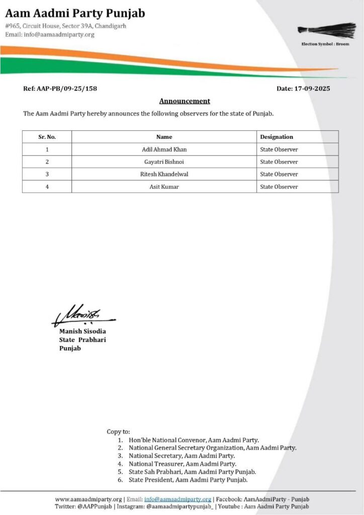 ਆਮ ਆਦਮੀ ਪਾਰਟੀ ਨੇ ਪੰਜਾਬ ’ਚ ਲਗਾਏ 4 ਨਵੇਂ ਆਬਜ਼ਰਵਰ ਚੰਡੀਗੜ੍ਹ ਪੰਜਾਬ ਸਤੰਬਰ 17, 2025ਸਤੰਬਰ 17, 2025BolePunjab.comLeave a Comment on ਆਮ ਆਦਮੀ ਪਾਰਟੀ ਨੇ ਪੰਜਾਬ ’ਚ ਲਗਾਏ 4 ਨਵੇਂ ਆਬਜ਼ਰਵਰ ਚੰਡੀਗੜ੍ਹ, 17 ਸਤੰਬਰ, ਬੋਲੇ ਪੰਜਾਬ ਬਿਊਰੋ; ਆਮ ਆਦਮੀ ਪਾਰਟੀ ਵੱਲੋਂ ਪੰਜਾਬ ਵਿੱਚ 4 ਨਵੇਂ ਆਬਜ਼ਰਵਰਾਂ ਦਾ ਐਲਾਨ ਕੀਤਾ ਗਿਆ ਹੈ। Related Postਪੰਜਾਬ ਨੇ ਸਕੂਲ ਅਧਿਆਪਕਾਂ ਨੂੰ ਕਰੀਅਰ ਮੈਂਟਰ ਵਜੋਂ ਸਿਖਲਾਈ ਦੇਣ ਲਈ ਆਈ.ਆਈ.ਟੀ. ਮਦਰਾਸ ਨਾਲ ਹੱਥ ਮਿਲਾਇਆਦਸੰਬਰ 5, 2025ਪੰਜਾਬ ਵਿੱਚ ਜ਼ਿਲ੍ਹਾ ਪ੍ਰੀਸ਼ਦ ਚੋਣਾਂ ਨੂੰ ਲੈ ਕੇ ਕਾਂਗਰਸ ਨੇ ਹਾਈ ਕੋਰਟ ਦਾ ਦਰਵਾਜ਼ਾ ਖੜਕਾਇਆਦਸੰਬਰ 5, 2025ਚੰਡੀਗੜ੍ਹ ਪੁਲਿਸ ਦੇ ਸ਼ਰਾਬੀ ASI ਨੇ 10 ਵਾਹਨਾਂ ਨੂੰ ਮਾਰੀ ਟੱਕਰਦਸੰਬਰ 5, 2025Latest Newsਪੰਜਾਬ ਨੇ ਸਕੂਲ ਅਧਿਆਪਕਾਂ ਨੂੰ ਕਰੀਅਰ ਮੈਂਟਰ ਵਜੋਂ ਸਿਖਲਾਈ ਦੇਣ ਲਈ ਆਈ.ਆਈ.ਟੀ. ਮਦਰਾਸ ਨਾਲ ਹੱਥ ਮਿਲਾਇਆਸੰਸਦ ਮੈਂਬਰ ਸ਼੍ਰੀ ਮਨੀਸ਼ ਤਿਵਾੜੀ ਨੇ ਲੋਕ ਸਭਾ ਵਿੱਚ ਹਰਿਆਣਾ, ਪੰਜਾਬ ਅਤੇ ਹਿਮਾਚਲ ਪ੍ਰਦੇਸ਼ ਦੇ ਡੈਮਾਂ ਦੀ ਡੀ-ਸਿਲਟਿੰਗ ਅਤੇ ਘਟਦੀ ਸਟੋਰੇਜ ਸਮਰੱਥਾ ਦਾ ਮੁੱਦਾ ਉਠਾਇਆਮੁੱਖ ਪ੍ਰਸ਼ਾਸ਼ਕ ਪੁੱਡਾ ਮੈਡਮ ਨੀਰੂ ਕਤਿਆਲ ਗੁਪਤਾ ਦੇ ਦਫਤਰ ਪੁੱਡਾ ਭਵਨ ਮੋਹਾਲੀ ਵਿਖੇ ਲੜੀਵਾਰ ਭੁੱਖ ਹੜਤਾਲਪੰਜਾਬ ਵਿੱਚ ਜ਼ਿਲ੍ਹਾ ਪ੍ਰੀਸ਼ਦ ਚੋਣਾਂ ਨੂੰ ਲੈ ਕੇ ਕਾਂਗਰਸ ਨੇ ਹਾਈ ਕੋਰਟ ਦਾ ਦਰਵਾਜ਼ਾ ਖੜਕਾਇਆਬਿਜਲੀ ਸੋਧ ਬਿਲ ਤੇ ਨਵੇਂ ਬੀਜ ਬਿੱਲ ਖਿਲਾਫ ਕਿਰਤੀ ਕਿਸਾਨ ਮੋਰਚਾ ਦੀ ਹੋਈ ਮੀਟਿੰਗPreviousNextLatest Newsਪੰਜਾਬ ਨੇ ਸਕੂਲ ਅਧਿਆਪਕਾਂ ਨੂੰ ਕਰੀਅਰ ਮੈਂਟਰ ਵਜੋਂ ਸਿਖਲਾਈ ਦੇਣ ਲਈ ਆਈ.ਆਈ.ਟੀ. ਮਦਰਾਸ ਨਾਲ ਹੱਥ ਮਿਲਾਇਆਸੰਸਦ ਮੈਂਬਰ ਸ਼੍ਰੀ ਮਨੀਸ਼ ਤਿਵਾੜੀ ਨੇ ਲੋਕ ਸਭਾ ਵਿੱਚ ਹਰਿਆਣਾ, ਪੰਜਾਬ ਅਤੇ ਹਿਮਾਚਲ ਪ੍ਰਦੇਸ਼ ਦੇ ਡੈਮਾਂ ਦੀ ਡੀ-ਸਿਲਟਿੰਗ ਅਤੇ ਘਟਦੀ ਸਟੋਰੇਜ ਸਮਰੱਥਾ ਦਾ ਮੁੱਦਾ ਉਠਾਇਆਮੁੱਖ ਪ੍ਰਸ਼ਾਸ਼ਕ ਪੁੱਡਾ ਮੈਡਮ ਨੀਰੂ ਕਤਿਆਲ ਗੁਪਤਾ ਦੇ ਦਫਤਰ ਪੁੱਡਾ ਭਵਨ ਮੋਹਾਲੀ ਵਿਖੇ ਲੜੀਵਾਰ ਭੁੱਖ ਹੜਤਾਲਪੰਜਾਬ ਵਿੱਚ ਜ਼ਿਲ੍ਹਾ ਪ੍ਰੀਸ਼ਦ ਚੋਣਾਂ ਨੂੰ ਲੈ ਕੇ ਕਾਂਗਰਸ ਨੇ ਹਾਈ ਕੋਰਟ ਦਾ ਦਰਵਾਜ਼ਾ ਖੜਕਾਇਆਬਿਜਲੀ ਸੋਧ ਬਿਲ ਤੇ ਨਵੇਂ ਬੀਜ ਬਿੱਲ ਖਿਲਾਫ ਕਿਰਤੀ ਕਿਸਾਨ ਮੋਰਚਾ ਦੀ ਹੋਈ ਮੀਟਿੰਗਪਾਈਟੈਕਸ ਵਿਖੇ ਅਪਾਹਜਾਂ ਅਤੇ ਬਜ਼ੁਰਗਾਂ ਲਈ ਵ੍ਹੀਲਚੇਅਰ ਦੀ ਸਹੂਲਤਚੰਡੀਗੜ੍ਹ ਪੁਲਿਸ ਦੇ ਸ਼ਰਾਬੀ ASI ਨੇ 10 ਵਾਹਨਾਂ ਨੂੰ ਮਾਰੀ ਟੱਕਰਪੰਜਾਬ ਵਿੱਚ ਰੇਲਵੇ ਪਟੜੀਆਂ ‘ਤੇ ਕਿਸਾਨਾਂ ਅਤੇ ਪੁਲਿਸ ਵਿਚਕਾਰ ਝੜਪਾਂਦੇਸ਼ ਭਗਤ ਯੂਨੀਵਰਸਿਟੀ ਨੇ ਕਰਵਾਈ ਅੰਤਰਰਾਸ਼ਟਰੀ ਕਾਨਫਰੰਸ ਅਤੇ ਅਗਾਂਹਵਧੂ ਕਿਸਾਨ ਮਿਲਣੀਆਮ ਆਦਮੀ ਪਾਰਟੀ ਵੱਲੋਂ ਨਾਮਜ਼ਦਗੀ ਪੱਤਰ ਦਾਖਲ ਕਰਨ ਦੌਰਾਨ ਸ਼ਰੇਆਮ ਗੁੰਡਾਗਰਦੀ ਦੀਆਂ ਘਟਨਾਵਾਂ ਅਤੇ ਚੋਣ ਪ੍ਰਕਿਰਿਆ ਦੌਰਾਨ ਸਰਕਾਰੀ ਮਸ਼ੀਨਰੀ ਦੀ ਕਥਿਤ ਦੁਰਵਰਤੋਂ ਲੋਕਤੰਤਰ ਲਈ ਖ਼ਤਰਨਾਕ – ਕੈਂਥ ਪੁਲਿਸ ਮੁਲਾਜ਼ਮਾਂ ‘ਤੇ ਵਰਦੀ ‘ਚ ਰੀਲਾਂ ਬਣਾਉਣ ‘ਤੇ ਲੱਗੀ ਪਾਬੰਦੀਜਲੰਧਰ ‘ਚ ਰੋਡਵੇਜ਼ ਬੱਸ ਨੇ ਸਕੂਟਰ ਨੂੰ ਟੱਕਰ ਮਾਰੀ, ਪੁੱਤ ਦੀ ਮੌਤ ਪਿਤਾ ਗੰਭੀਰ ਜ਼ਖ਼ਮੀ PreviousNext