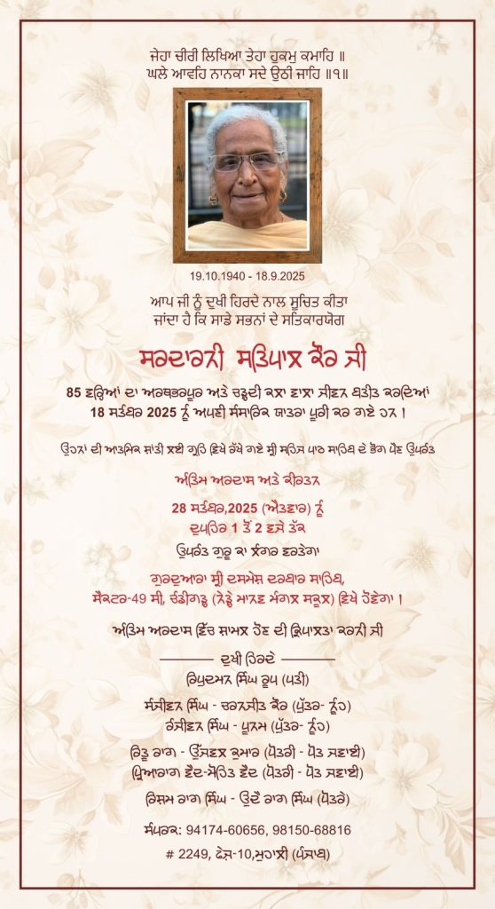 ਸਰਦਾਰਨੀ ਸਤਪਾਲ ਕੌਰ ਦੀ ਆਤਮਿਕ ਸ਼ਾਂਤੀ ਲਈ ਰੱਖੇ ਗਏ ਸ੍ਰੀ ਸਹਿਜ ਪਾਠ ਸਾਹਿਬ ਦੇ ਭੋਗ ਅਤੇ ਅੰਤਿਮ ਅਰਦਾਸ ਅੱਜ ਮਿਤੀ 28ਸਤੰਬਰ , ਦਿਨ ਐਤਵਾਰ ਨੂੰ ਦੁਪਹਿਰ 1 ਵਜੇ ਤੋਂ 2 ਵਜੇ ਤੱਕ ਗੁਰਦੁਆਰਾ ਸ੍ਰੀ ਦਸਮੇਸ਼ ਦਰਬਾਰ ਸਾਹਿਬ, ਸੈਕਟਰ-49ਸੀ, ਚੰਡੀਗੜ੍ਹ(ਨੇੜੇ ਮਾਨਵ ਮੰਗਲ ਸਕੂਲ) ਵਿਖੇ ਹੋਵੇਗੀ।