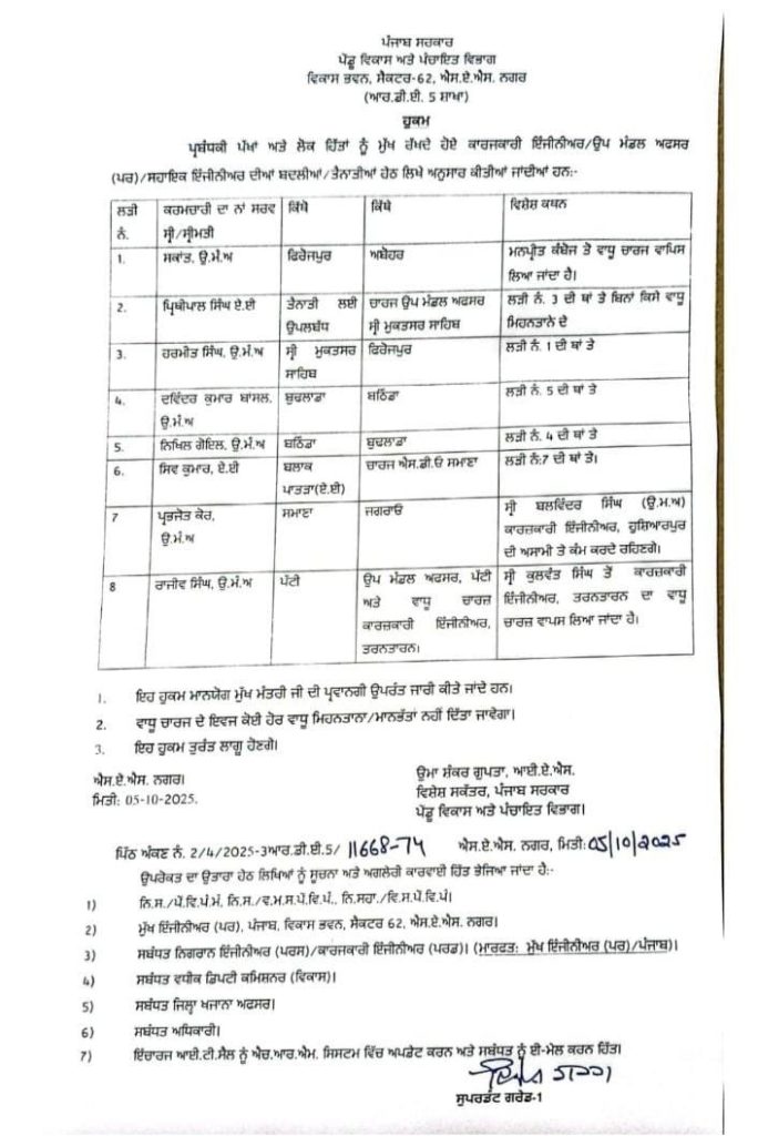 ਪੰਜਾਬ ਸਰਕਾਰ ਵੱਲੋਂ 8 ਅਧਿਕਾਰੀਆਂ ਦੀਆਂ ਬਦਲੀਆਂ ਚੰਡੀਗੜ੍ਹ ਪੰਜਾਬ ਅਕਤੂਬਰ 6, 2025ਅਕਤੂਬਰ 6, 2025BolePunjab.comLeave a Comment on ਪੰਜਾਬ ਸਰਕਾਰ ਵੱਲੋਂ 8 ਅਧਿਕਾਰੀਆਂ ਦੀਆਂ ਬਦਲੀਆਂ ਚੰਡੀਗੜ੍ਹ 6 ਅਕਤੂਬਰ ,ਬੋਲੇ ਪੰਜਾਬ ਬਿਉਰੋ; ਪੰਜਾਬ ਸਰਕਾਰ ਦੇ ਵੱਲੋਂ ਪੇਂਡੂ ਵਿਕਾਸ ਤੇ ਪੰਚਾਇਤ ਵਿਭਾਗ ਦੇ 8 ਐਕਸੀਅਨ/ ਐਸਡੀਓਜ਼ ਤੇ ਜੇਈਜ਼ ਦੀਆਂ ਬਦਲੀਆਂ ਕੀਤੀਆਂ ਗਈਆਂ ਹਨ। Related Postਪੰਜਾਬ ਨੇ ਸਕੂਲ ਅਧਿਆਪਕਾਂ ਨੂੰ ਕਰੀਅਰ ਮੈਂਟਰ ਵਜੋਂ ਸਿਖਲਾਈ ਦੇਣ ਲਈ ਆਈ.ਆਈ.ਟੀ. ਮਦਰਾਸ ਨਾਲ ਹੱਥ ਮਿਲਾਇਆਦਸੰਬਰ 5, 2025ਪੰਜਾਬ ਵਿੱਚ ਜ਼ਿਲ੍ਹਾ ਪ੍ਰੀਸ਼ਦ ਚੋਣਾਂ ਨੂੰ ਲੈ ਕੇ ਕਾਂਗਰਸ ਨੇ ਹਾਈ ਕੋਰਟ ਦਾ ਦਰਵਾਜ਼ਾ ਖੜਕਾਇਆਦਸੰਬਰ 5, 2025ਚੰਡੀਗੜ੍ਹ ਪੁਲਿਸ ਦੇ ਸ਼ਰਾਬੀ ASI ਨੇ 10 ਵਾਹਨਾਂ ਨੂੰ ਮਾਰੀ ਟੱਕਰਦਸੰਬਰ 5, 2025Latest Newsਪੰਜਾਬ ਨੇ ਸਕੂਲ ਅਧਿਆਪਕਾਂ ਨੂੰ ਕਰੀਅਰ ਮੈਂਟਰ ਵਜੋਂ ਸਿਖਲਾਈ ਦੇਣ ਲਈ ਆਈ.ਆਈ.ਟੀ. ਮਦਰਾਸ ਨਾਲ ਹੱਥ ਮਿਲਾਇਆਸੰਸਦ ਮੈਂਬਰ ਸ਼੍ਰੀ ਮਨੀਸ਼ ਤਿਵਾੜੀ ਨੇ ਲੋਕ ਸਭਾ ਵਿੱਚ ਹਰਿਆਣਾ, ਪੰਜਾਬ ਅਤੇ ਹਿਮਾਚਲ ਪ੍ਰਦੇਸ਼ ਦੇ ਡੈਮਾਂ ਦੀ ਡੀ-ਸਿਲਟਿੰਗ ਅਤੇ ਘਟਦੀ ਸਟੋਰੇਜ ਸਮਰੱਥਾ ਦਾ ਮੁੱਦਾ ਉਠਾਇਆਮੁੱਖ ਪ੍ਰਸ਼ਾਸ਼ਕ ਪੁੱਡਾ ਮੈਡਮ ਨੀਰੂ ਕਤਿਆਲ ਗੁਪਤਾ ਦੇ ਦਫਤਰ ਪੁੱਡਾ ਭਵਨ ਮੋਹਾਲੀ ਵਿਖੇ ਲੜੀਵਾਰ ਭੁੱਖ ਹੜਤਾਲਪੰਜਾਬ ਵਿੱਚ ਜ਼ਿਲ੍ਹਾ ਪ੍ਰੀਸ਼ਦ ਚੋਣਾਂ ਨੂੰ ਲੈ ਕੇ ਕਾਂਗਰਸ ਨੇ ਹਾਈ ਕੋਰਟ ਦਾ ਦਰਵਾਜ਼ਾ ਖੜਕਾਇਆਬਿਜਲੀ ਸੋਧ ਬਿਲ ਤੇ ਨਵੇਂ ਬੀਜ ਬਿੱਲ ਖਿਲਾਫ ਕਿਰਤੀ ਕਿਸਾਨ ਮੋਰਚਾ ਦੀ ਹੋਈ ਮੀਟਿੰਗPreviousNextLatest Newsਪੰਜਾਬ ਨੇ ਸਕੂਲ ਅਧਿਆਪਕਾਂ ਨੂੰ ਕਰੀਅਰ ਮੈਂਟਰ ਵਜੋਂ ਸਿਖਲਾਈ ਦੇਣ ਲਈ ਆਈ.ਆਈ.ਟੀ. ਮਦਰਾਸ ਨਾਲ ਹੱਥ ਮਿਲਾਇਆਸੰਸਦ ਮੈਂਬਰ ਸ਼੍ਰੀ ਮਨੀਸ਼ ਤਿਵਾੜੀ ਨੇ ਲੋਕ ਸਭਾ ਵਿੱਚ ਹਰਿਆਣਾ, ਪੰਜਾਬ ਅਤੇ ਹਿਮਾਚਲ ਪ੍ਰਦੇਸ਼ ਦੇ ਡੈਮਾਂ ਦੀ ਡੀ-ਸਿਲਟਿੰਗ ਅਤੇ ਘਟਦੀ ਸਟੋਰੇਜ ਸਮਰੱਥਾ ਦਾ ਮੁੱਦਾ ਉਠਾਇਆਮੁੱਖ ਪ੍ਰਸ਼ਾਸ਼ਕ ਪੁੱਡਾ ਮੈਡਮ ਨੀਰੂ ਕਤਿਆਲ ਗੁਪਤਾ ਦੇ ਦਫਤਰ ਪੁੱਡਾ ਭਵਨ ਮੋਹਾਲੀ ਵਿਖੇ ਲੜੀਵਾਰ ਭੁੱਖ ਹੜਤਾਲਪੰਜਾਬ ਵਿੱਚ ਜ਼ਿਲ੍ਹਾ ਪ੍ਰੀਸ਼ਦ ਚੋਣਾਂ ਨੂੰ ਲੈ ਕੇ ਕਾਂਗਰਸ ਨੇ ਹਾਈ ਕੋਰਟ ਦਾ ਦਰਵਾਜ਼ਾ ਖੜਕਾਇਆਬਿਜਲੀ ਸੋਧ ਬਿਲ ਤੇ ਨਵੇਂ ਬੀਜ ਬਿੱਲ ਖਿਲਾਫ ਕਿਰਤੀ ਕਿਸਾਨ ਮੋਰਚਾ ਦੀ ਹੋਈ ਮੀਟਿੰਗਪਾਈਟੈਕਸ ਵਿਖੇ ਅਪਾਹਜਾਂ ਅਤੇ ਬਜ਼ੁਰਗਾਂ ਲਈ ਵ੍ਹੀਲਚੇਅਰ ਦੀ ਸਹੂਲਤਚੰਡੀਗੜ੍ਹ ਪੁਲਿਸ ਦੇ ਸ਼ਰਾਬੀ ASI ਨੇ 10 ਵਾਹਨਾਂ ਨੂੰ ਮਾਰੀ ਟੱਕਰਪੰਜਾਬ ਵਿੱਚ ਰੇਲਵੇ ਪਟੜੀਆਂ ‘ਤੇ ਕਿਸਾਨਾਂ ਅਤੇ ਪੁਲਿਸ ਵਿਚਕਾਰ ਝੜਪਾਂਦੇਸ਼ ਭਗਤ ਯੂਨੀਵਰਸਿਟੀ ਨੇ ਕਰਵਾਈ ਅੰਤਰਰਾਸ਼ਟਰੀ ਕਾਨਫਰੰਸ ਅਤੇ ਅਗਾਂਹਵਧੂ ਕਿਸਾਨ ਮਿਲਣੀਆਮ ਆਦਮੀ ਪਾਰਟੀ ਵੱਲੋਂ ਨਾਮਜ਼ਦਗੀ ਪੱਤਰ ਦਾਖਲ ਕਰਨ ਦੌਰਾਨ ਸ਼ਰੇਆਮ ਗੁੰਡਾਗਰਦੀ ਦੀਆਂ ਘਟਨਾਵਾਂ ਅਤੇ ਚੋਣ ਪ੍ਰਕਿਰਿਆ ਦੌਰਾਨ ਸਰਕਾਰੀ ਮਸ਼ੀਨਰੀ ਦੀ ਕਥਿਤ ਦੁਰਵਰਤੋਂ ਲੋਕਤੰਤਰ ਲਈ ਖ਼ਤਰਨਾਕ – ਕੈਂਥ ਪੁਲਿਸ ਮੁਲਾਜ਼ਮਾਂ ‘ਤੇ ਵਰਦੀ ‘ਚ ਰੀਲਾਂ ਬਣਾਉਣ ‘ਤੇ ਲੱਗੀ ਪਾਬੰਦੀਜਲੰਧਰ ‘ਚ ਰੋਡਵੇਜ਼ ਬੱਸ ਨੇ ਸਕੂਟਰ ਨੂੰ ਟੱਕਰ ਮਾਰੀ, ਪੁੱਤ ਦੀ ਮੌਤ ਪਿਤਾ ਗੰਭੀਰ ਜ਼ਖ਼ਮੀ PreviousNext