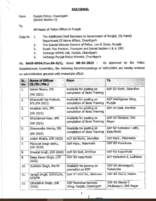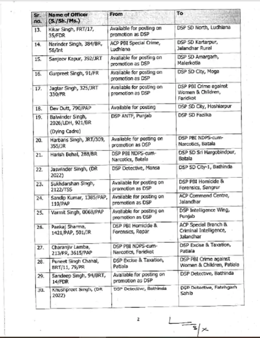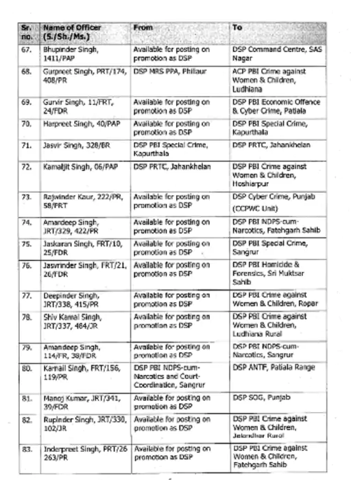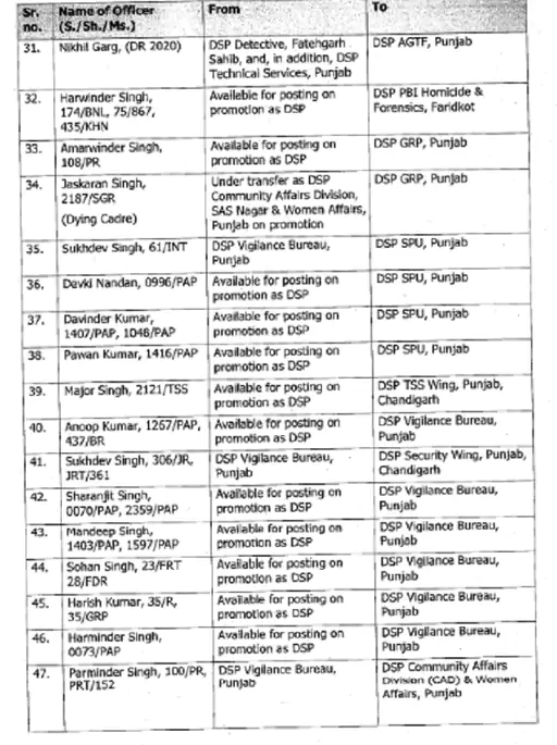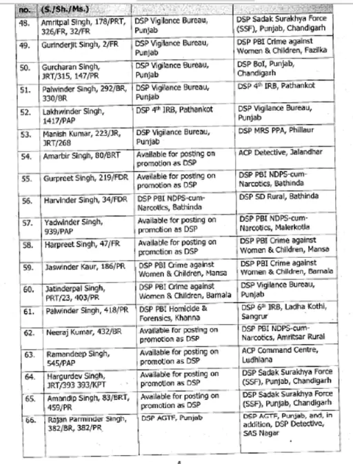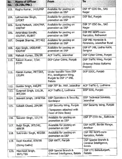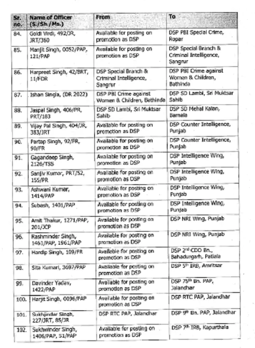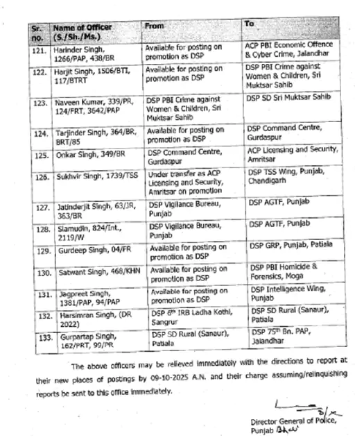 ਪੰਜਾਬ ਪੁਲਿਸ ਨੇ ਏਐਸਪੀ ਅਤੇ ਡੀਐਸਪੀ ਰੈਂਕ ਦੇ ਅਧਿਕਾਰੀਆਂ ਦੇ ਵੱਡੇ ਪੱਧਰ ‘ਤੇ ਤਬਾਦਲੇ ਕੀਤੇ ਹਨ। 133 ਅਧਿਕਾਰੀਆਂ ਦੇ ਤਬਾਦਲੇ ਦੇ ਹੁਕਮ ਜਾਰੀ ਕੀਤੇ ਗਏ ਹਨ। ਇਸ ਸਮੇਂ ਦੌਰਾਨ ਨਿਯੁਕਤ ਕੀਤੇ ਗਏ ਅਧਿਕਾਰੀ ਕਾਫ਼ੀ ਸਮੇਂ ਤੋਂ ਪੋਸਟਿੰਗ ਦੀ ਉਡੀਕ ਕਰ ਰਹੇ ਸਨ। ਇਨ੍ਹਾਂ ਅਧਿਕਾਰੀਆਂ ਨੂੰ ਵਿਜੀਲੈਂਸ ਬਿਊਰੋ ਅਤੇ ਰੋਡ ਸੇਫਟੀ ਫੋਰਸ ਸਮੇਤ ਵੱਖ-ਵੱਖ ਵਿੰਗਾਂ ਵਿੱਚ ਤਾਇਨਾਤ ਕੀਤਾ ਗਿਆ ਹੈ।