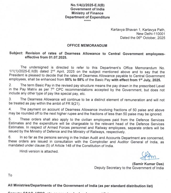 ਦਿਵਾਲੀ ਤੋਂ ਪਹਿਲਾਂ ਸਰਕਾਰ ਵੱਲੋਂ ਮੁਲਾਜ਼ਮਾਂ ਤੇ ਪੈਨਸ਼ਨਰਾਂ ਦੇ ਵਧਾਏ ਗਏ ਮਹਿੰਗਾਈ ਭੱਤੇ (DA) ਦਾ ਨੋਟੀਫਿਕੇਸ਼ਨ ਜਾਰੀ ਕਰ ਦਿੱਤਾ ਗਿਆ ਹੈ। ਜ਼ਿਕਰਯੋਗ ਹੈ ਕਿ ਬੀਤੇ ਦਿਨੀਂ ਕੇਂਦਰ ਸਰਕਾਰ ਵੱਲੋਂ ਮੁਲਾਜ਼ਮਾਂ ਦੇ ਡੀਏ ਵਿੱਚ 3 ਫੀਸਦੀ ਵਾਧਾ ਕੀਤਾ ਗਿਆ ਸੀ। ਇਸ ਵਾਧੇ ਨਾਲ ਡੀਏ 55 ਫੀਸਦੀ ਤੋਂ ਵਧਕੇ 58 ਫੀਸਦੀ ਹੋ ਗਿਆ ਸੀ।