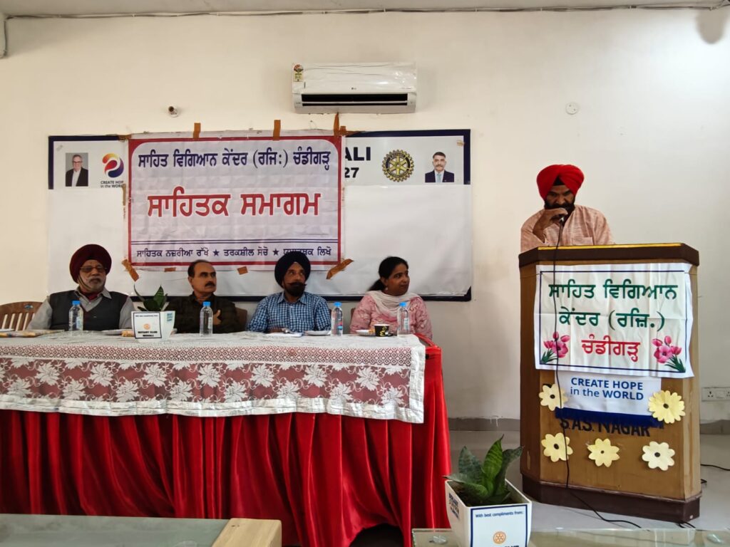 ਸਾਹਿਤ ਵਿਗਿਆਨ ਕੇਂਦਰ ਚੰਡੀਗੜ੍ਹ ਵੱਲੋਂ ਮਹੀਨੇਵਾਰ ਸਾਹਿਤਕ ਸਮਾਗਮ ਰੋਟਰੀ ਕਲੱਬ ਸੈਕਟਰ 70 ਮੁਹਾਲੀ ਵਿਖੇ ਕਰਵਾਇਆ ਗਿਆ । ਪ੍ਰਧਾਨਗੀ ਮੰਡਲ ਵਿੱਚ ਕਰਨਲ ਟੀ.ਬੀ.ਐੱਸ. ਬੇਦੀ ਜੀ (ਸਾਬਕਾ ਪ੍ਰਧਾਨ, ਰੋਟਰੀ ਕਲੱਬ) ਸ਼੍ਰੀ ਸੁਭਾਸ਼ ਭਾਸਕਰ ਜੀ(ਸਕੱਤਰ,ਚੰਡੀਗੜ੍ਹ ਸਾਹਿਤ ਅਕਾਦਮੀ) ਗੁਰਦਰਸ਼ਨ ਸਿੰਘ ਮਾਵੀ ਜੀ (ਪ੍ਰਧਾਨ,ਸਾਹਿਤ ਵਿਗਿਆਨ ਕੇਂਦਰ) ਤੇ ਦਵਿੰਦਰ ਕੌਰ ਢਿੱਲੋਂ ਸ਼ਾਮਿਲ ਹੋਏ ।ਸਭ ਤੋਂ ਪਹਿਲਾਂ ਸਾਡੇ ਕੋਲੋਂ ਸਦਾ ਲਈ ਵਿਛੜ ਗਈਆਂ ਸ਼ਖਸ਼ੀਅਤਾਂ ਸ. ਕਰਮਜੀਤ ਸਿੰਘ ਬੱਗਾ ਜੀ(ਅੰਤਰਰਾਸ਼ਟਰੀ ਅਲਗੋਜ਼ਾ ਵਾਦਕ),ਪ੍ਰਸਿੱਧ ਗਾਇਕ ਰਾਜਵੀਰ ਜਵੰਦਾ, ਪ੍ਰਸਿੱਧ ਗੀਤਕਾਰ ਬਾਬੂ ਸਿੰਘ ਮਾਨ ਮਰਾੜਾਂ ਵਾਲਾ ਜੀ ਦੀ ਪਤਨੀ ਸ਼੍ਰੀਮਤੀ ਗੁਰਨਾਮ ਕੌਰ ਅਤੇ ਪ੍ਰਸਿੱਧ ਖਿਡਾਰੀ ਵਰਿੰਦਰ ਘੁੰਮਣ ਨੂੰ ਦੋ ਮਿੰਟ ਦਾ