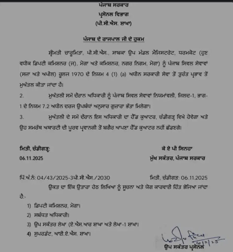 ਪੰਜਾਬ ਸਰਕਾਰ ਵੱਲੋਂ PCS ਅਫ਼ਸਰ ਸਸਪੈਂਡ ਚੰਡੀਗੜ੍ਹ ਪੰਜਾਬ ਨਵੰਬਰ 7, 2025ਨਵੰਬਰ 7, 2025BolePunjab.comLeave a Comment on ਪੰਜਾਬ ਸਰਕਾਰ ਵੱਲੋਂ PCS ਅਫ਼ਸਰ ਸਸਪੈਂਡ ਚੰਡੀਗੜ੍ਹ 7 ਨਵੰਬਰ,ਬੋਲੇ ਪੰਜਾਬ ਬਿਊਰੋ; ਪੰਜਾਬ ਸਰਕਾਰ ਦੇ ਵੱਲੋਂ ਮੋਗਾ ਦੀ ਏਡੀਸੀ (ADC) ਸ਼੍ਰੀਮਤੀ ਚਾਰੂਮਿਤਾ (PCS) ਨੂੰ ਸਸਪੈਂਡ ਕਰ ਦਿੱਤਾ ਗਿਆ ਹੈ। Related Postਪੰਜਾਬ ਨੇ ਸਕੂਲ ਅਧਿਆਪਕਾਂ ਨੂੰ ਕਰੀਅਰ ਮੈਂਟਰ ਵਜੋਂ ਸਿਖਲਾਈ ਦੇਣ ਲਈ ਆਈ.ਆਈ.ਟੀ. ਮਦਰਾਸ ਨਾਲ ਹੱਥ ਮਿਲਾਇਆਦਸੰਬਰ 5, 2025ਪੰਜਾਬ ਵਿੱਚ ਜ਼ਿਲ੍ਹਾ ਪ੍ਰੀਸ਼ਦ ਚੋਣਾਂ ਨੂੰ ਲੈ ਕੇ ਕਾਂਗਰਸ ਨੇ ਹਾਈ ਕੋਰਟ ਦਾ ਦਰਵਾਜ਼ਾ ਖੜਕਾਇਆਦਸੰਬਰ 5, 2025ਚੰਡੀਗੜ੍ਹ ਪੁਲਿਸ ਦੇ ਸ਼ਰਾਬੀ ASI ਨੇ 10 ਵਾਹਨਾਂ ਨੂੰ ਮਾਰੀ ਟੱਕਰਦਸੰਬਰ 5, 2025Latest Newsਪੰਜਾਬ ਨੇ ਸਕੂਲ ਅਧਿਆਪਕਾਂ ਨੂੰ ਕਰੀਅਰ ਮੈਂਟਰ ਵਜੋਂ ਸਿਖਲਾਈ ਦੇਣ ਲਈ ਆਈ.ਆਈ.ਟੀ. ਮਦਰਾਸ ਨਾਲ ਹੱਥ ਮਿਲਾਇਆਸੰਸਦ ਮੈਂਬਰ ਸ਼੍ਰੀ ਮਨੀਸ਼ ਤਿਵਾੜੀ ਨੇ ਲੋਕ ਸਭਾ ਵਿੱਚ ਹਰਿਆਣਾ, ਪੰਜਾਬ ਅਤੇ ਹਿਮਾਚਲ ਪ੍ਰਦੇਸ਼ ਦੇ ਡੈਮਾਂ ਦੀ ਡੀ-ਸਿਲਟਿੰਗ ਅਤੇ ਘਟਦੀ ਸਟੋਰੇਜ ਸਮਰੱਥਾ ਦਾ ਮੁੱਦਾ ਉਠਾਇਆਮੁੱਖ ਪ੍ਰਸ਼ਾਸ਼ਕ ਪੁੱਡਾ ਮੈਡਮ ਨੀਰੂ ਕਤਿਆਲ ਗੁਪਤਾ ਦੇ ਦਫਤਰ ਪੁੱਡਾ ਭਵਨ ਮੋਹਾਲੀ ਵਿਖੇ ਲੜੀਵਾਰ ਭੁੱਖ ਹੜਤਾਲਪੰਜਾਬ ਵਿੱਚ ਜ਼ਿਲ੍ਹਾ ਪ੍ਰੀਸ਼ਦ ਚੋਣਾਂ ਨੂੰ ਲੈ ਕੇ ਕਾਂਗਰਸ ਨੇ ਹਾਈ ਕੋਰਟ ਦਾ ਦਰਵਾਜ਼ਾ ਖੜਕਾਇਆਬਿਜਲੀ ਸੋਧ ਬਿਲ ਤੇ ਨਵੇਂ ਬੀਜ ਬਿੱਲ ਖਿਲਾਫ ਕਿਰਤੀ ਕਿਸਾਨ ਮੋਰਚਾ ਦੀ ਹੋਈ ਮੀਟਿੰਗPreviousNextLatest Newsਪੰਜਾਬ ਨੇ ਸਕੂਲ ਅਧਿਆਪਕਾਂ ਨੂੰ ਕਰੀਅਰ ਮੈਂਟਰ ਵਜੋਂ ਸਿਖਲਾਈ ਦੇਣ ਲਈ ਆਈ.ਆਈ.ਟੀ. ਮਦਰਾਸ ਨਾਲ ਹੱਥ ਮਿਲਾਇਆਸੰਸਦ ਮੈਂਬਰ ਸ਼੍ਰੀ ਮਨੀਸ਼ ਤਿਵਾੜੀ ਨੇ ਲੋਕ ਸਭਾ ਵਿੱਚ ਹਰਿਆਣਾ, ਪੰਜਾਬ ਅਤੇ ਹਿਮਾਚਲ ਪ੍ਰਦੇਸ਼ ਦੇ ਡੈਮਾਂ ਦੀ ਡੀ-ਸਿਲਟਿੰਗ ਅਤੇ ਘਟਦੀ ਸਟੋਰੇਜ ਸਮਰੱਥਾ ਦਾ ਮੁੱਦਾ ਉਠਾਇਆਮੁੱਖ ਪ੍ਰਸ਼ਾਸ਼ਕ ਪੁੱਡਾ ਮੈਡਮ ਨੀਰੂ ਕਤਿਆਲ ਗੁਪਤਾ ਦੇ ਦਫਤਰ ਪੁੱਡਾ ਭਵਨ ਮੋਹਾਲੀ ਵਿਖੇ ਲੜੀਵਾਰ ਭੁੱਖ ਹੜਤਾਲਪੰਜਾਬ ਵਿੱਚ ਜ਼ਿਲ੍ਹਾ ਪ੍ਰੀਸ਼ਦ ਚੋਣਾਂ ਨੂੰ ਲੈ ਕੇ ਕਾਂਗਰਸ ਨੇ ਹਾਈ ਕੋਰਟ ਦਾ ਦਰਵਾਜ਼ਾ ਖੜਕਾਇਆਬਿਜਲੀ ਸੋਧ ਬਿਲ ਤੇ ਨਵੇਂ ਬੀਜ ਬਿੱਲ ਖਿਲਾਫ ਕਿਰਤੀ ਕਿਸਾਨ ਮੋਰਚਾ ਦੀ ਹੋਈ ਮੀਟਿੰਗਪਾਈਟੈਕਸ ਵਿਖੇ ਅਪਾਹਜਾਂ ਅਤੇ ਬਜ਼ੁਰਗਾਂ ਲਈ ਵ੍ਹੀਲਚੇਅਰ ਦੀ ਸਹੂਲਤਚੰਡੀਗੜ੍ਹ ਪੁਲਿਸ ਦੇ ਸ਼ਰਾਬੀ ASI ਨੇ 10 ਵਾਹਨਾਂ ਨੂੰ ਮਾਰੀ ਟੱਕਰਪੰਜਾਬ ਵਿੱਚ ਰੇਲਵੇ ਪਟੜੀਆਂ ‘ਤੇ ਕਿਸਾਨਾਂ ਅਤੇ ਪੁਲਿਸ ਵਿਚਕਾਰ ਝੜਪਾਂਦੇਸ਼ ਭਗਤ ਯੂਨੀਵਰਸਿਟੀ ਨੇ ਕਰਵਾਈ ਅੰਤਰਰਾਸ਼ਟਰੀ ਕਾਨਫਰੰਸ ਅਤੇ ਅਗਾਂਹਵਧੂ ਕਿਸਾਨ ਮਿਲਣੀਆਮ ਆਦਮੀ ਪਾਰਟੀ ਵੱਲੋਂ ਨਾਮਜ਼ਦਗੀ ਪੱਤਰ ਦਾਖਲ ਕਰਨ ਦੌਰਾਨ ਸ਼ਰੇਆਮ ਗੁੰਡਾਗਰਦੀ ਦੀਆਂ ਘਟਨਾਵਾਂ ਅਤੇ ਚੋਣ ਪ੍ਰਕਿਰਿਆ ਦੌਰਾਨ ਸਰਕਾਰੀ ਮਸ਼ੀਨਰੀ ਦੀ ਕਥਿਤ ਦੁਰਵਰਤੋਂ ਲੋਕਤੰਤਰ ਲਈ ਖ਼ਤਰਨਾਕ – ਕੈਂਥ ਪੁਲਿਸ ਮੁਲਾਜ਼ਮਾਂ ‘ਤੇ ਵਰਦੀ ‘ਚ ਰੀਲਾਂ ਬਣਾਉਣ ‘ਤੇ ਲੱਗੀ ਪਾਬੰਦੀਜਲੰਧਰ ‘ਚ ਰੋਡਵੇਜ਼ ਬੱਸ ਨੇ ਸਕੂਟਰ ਨੂੰ ਟੱਕਰ ਮਾਰੀ, ਪੁੱਤ ਦੀ ਮੌਤ ਪਿਤਾ ਗੰਭੀਰ ਜ਼ਖ਼ਮੀ PreviousNext