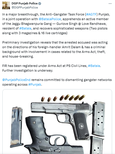 ਇਸ ਸਬੰਧ ਵਿੱਚ ਥਾਣਾ ਸਿਵਲ ਲਾਈਨਜ਼, ਬਟਾਲਾ ਵਿਖੇ ਆਰਮਜ਼ ਐਕਟ ਤਹਿਤ FIR ਦਰਜ ਕਰ ਲਈ ਗਈ ਹੈ ਅਤੇ ਅਗਲੇਰੀ ਜਾਂਚ ਜਾਰੀ ਹੈ। ਪੰਜਾਬ ਪੁਲਿਸ ਨੇ ਦੁਹਰਾਇਆ ਹੈ ਕਿ ਉਹ ਸੂਬੇ ਵਿੱਚੋਂ ਗੈਂਗਸਟਰ ਨੈੱਟਵਰਕਾਂ ਨੂੰ ਜੜ੍ਹੋਂ ਖ਼ਤਮ ਕਰਨ ਲਈ ਵਚਨਬੱਧ ਹੈ।