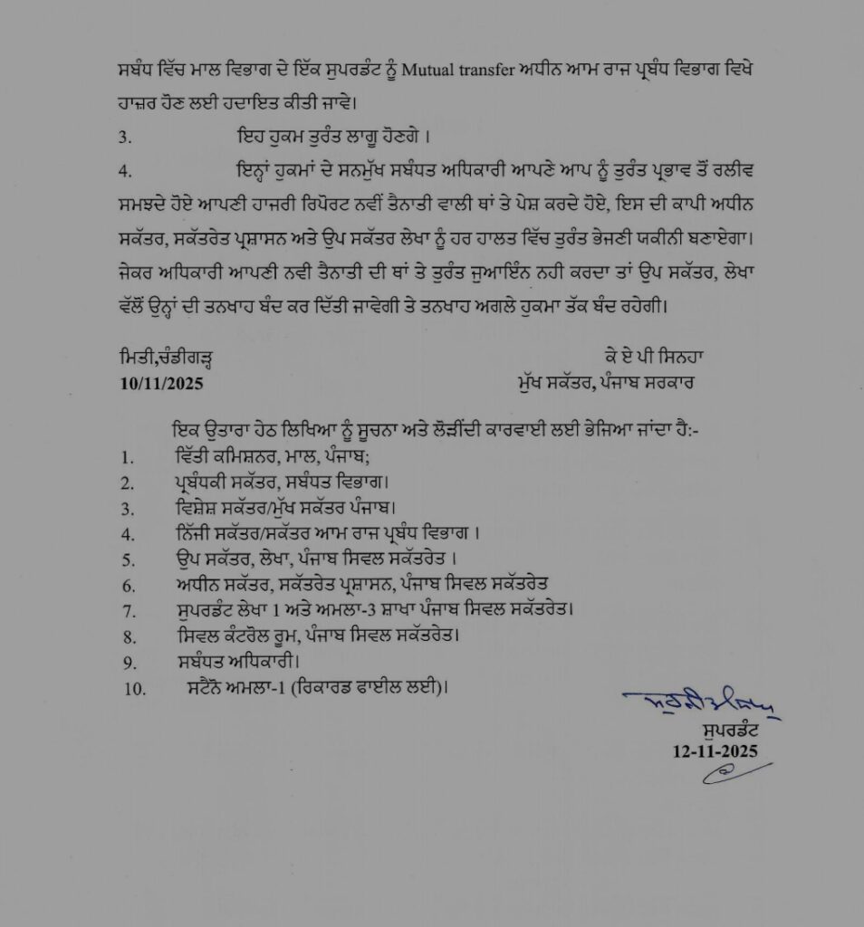 ਸਿਵਲ ਸਕੱਤਰੇਤ ਚ ਮੁਲਾਜ਼ਮ ਆਗੂ ਸੁਖਚੈਨ ਸਿੰਘ ਖਹਿਰਾ ਸਮੇਤ 7 ਅਧੀਨ ਸਕੱਤਰਾਂ ਸੁਪਰਡੈਂਟ ਪੱਧਰ ਦੇ ਅਧਿਕਾਰੀਆਂ ਦੇ ਕੀਤੇ ਤਬਾਦਲੇ ਚੰਡੀਗੜ੍ਹ ਪੰਜਾਬ ਨਵੰਬਰ 12, 2025ਨਵੰਬਰ 12, 2025BolePunjab.comLeave a Comment on ਸਿਵਲ ਸਕੱਤਰੇਤ ਚ ਮੁਲਾਜ਼ਮ ਆਗੂ ਸੁਖਚੈਨ ਸਿੰਘ ਖਹਿਰਾ ਸਮੇਤ 7 ਅਧੀਨ ਸਕੱਤਰਾਂ ਸੁਪਰਡੈਂਟ ਪੱਧਰ ਦੇ ਅਧਿਕਾਰੀਆਂ ਦੇ ਕੀਤੇ ਤਬਾਦਲੇ ਚੰਡੀਗੜ੍ਹ 12 ਨਵੰਬਰ ,ਬੋਲੇ ਪੰਜਾਬ ਬਿਊਰੋ; ਪੰਜਾਬ ਸਰਕਾਰ ਨੇ ਸਿਵਲ ਸਕੱਤਰੇਤ ਚ ਮੁਲਾਜ਼ਮ ਆਗੂ ਸੁਖਚੈਨ ਸਿੰਘ ਖਹਿਰਾ ਸਮੇਤ 7 ਅਧੀਨ ਸਕੱਤਰਾਂ ਸੁਪਰਡੈਂਟ ਪੱਧਰ ਦੇ ਅਧਿਕਾਰੀਆਂ ਦੇ ਤਬਾਦਲੇ ਕੀਤੇ ਹਨ Related Postਪੰਜਾਬ ਨੇ ਸਕੂਲ ਅਧਿਆਪਕਾਂ ਨੂੰ ਕਰੀਅਰ ਮੈਂਟਰ ਵਜੋਂ ਸਿਖਲਾਈ ਦੇਣ ਲਈ ਆਈ.ਆਈ.ਟੀ. ਮਦਰਾਸ ਨਾਲ ਹੱਥ ਮਿਲਾਇਆਦਸੰਬਰ 5, 2025ਪੰਜਾਬ ਵਿੱਚ ਜ਼ਿਲ੍ਹਾ ਪ੍ਰੀਸ਼ਦ ਚੋਣਾਂ ਨੂੰ ਲੈ ਕੇ ਕਾਂਗਰਸ ਨੇ ਹਾਈ ਕੋਰਟ ਦਾ ਦਰਵਾਜ਼ਾ ਖੜਕਾਇਆਦਸੰਬਰ 5, 2025ਚੰਡੀਗੜ੍ਹ ਪੁਲਿਸ ਦੇ ਸ਼ਰਾਬੀ ASI ਨੇ 10 ਵਾਹਨਾਂ ਨੂੰ ਮਾਰੀ ਟੱਕਰਦਸੰਬਰ 5, 2025Latest Newsਪੰਜਾਬ ਨੇ ਸਕੂਲ ਅਧਿਆਪਕਾਂ ਨੂੰ ਕਰੀਅਰ ਮੈਂਟਰ ਵਜੋਂ ਸਿਖਲਾਈ ਦੇਣ ਲਈ ਆਈ.ਆਈ.ਟੀ. ਮਦਰਾਸ ਨਾਲ ਹੱਥ ਮਿਲਾਇਆਸੰਸਦ ਮੈਂਬਰ ਸ਼੍ਰੀ ਮਨੀਸ਼ ਤਿਵਾੜੀ ਨੇ ਲੋਕ ਸਭਾ ਵਿੱਚ ਹਰਿਆਣਾ, ਪੰਜਾਬ ਅਤੇ ਹਿਮਾਚਲ ਪ੍ਰਦੇਸ਼ ਦੇ ਡੈਮਾਂ ਦੀ ਡੀ-ਸਿਲਟਿੰਗ ਅਤੇ ਘਟਦੀ ਸਟੋਰੇਜ ਸਮਰੱਥਾ ਦਾ ਮੁੱਦਾ ਉਠਾਇਆਮੁੱਖ ਪ੍ਰਸ਼ਾਸ਼ਕ ਪੁੱਡਾ ਮੈਡਮ ਨੀਰੂ ਕਤਿਆਲ ਗੁਪਤਾ ਦੇ ਦਫਤਰ ਪੁੱਡਾ ਭਵਨ ਮੋਹਾਲੀ ਵਿਖੇ ਲੜੀਵਾਰ ਭੁੱਖ ਹੜਤਾਲਪੰਜਾਬ ਵਿੱਚ ਜ਼ਿਲ੍ਹਾ ਪ੍ਰੀਸ਼ਦ ਚੋਣਾਂ ਨੂੰ ਲੈ ਕੇ ਕਾਂਗਰਸ ਨੇ ਹਾਈ ਕੋਰਟ ਦਾ ਦਰਵਾਜ਼ਾ ਖੜਕਾਇਆਬਿਜਲੀ ਸੋਧ ਬਿਲ ਤੇ ਨਵੇਂ ਬੀਜ ਬਿੱਲ ਖਿਲਾਫ ਕਿਰਤੀ ਕਿਸਾਨ ਮੋਰਚਾ ਦੀ ਹੋਈ ਮੀਟਿੰਗPreviousNextLatest Newsਪੰਜਾਬ ਨੇ ਸਕੂਲ ਅਧਿਆਪਕਾਂ ਨੂੰ ਕਰੀਅਰ ਮੈਂਟਰ ਵਜੋਂ ਸਿਖਲਾਈ ਦੇਣ ਲਈ ਆਈ.ਆਈ.ਟੀ. ਮਦਰਾਸ ਨਾਲ ਹੱਥ ਮਿਲਾਇਆਸੰਸਦ ਮੈਂਬਰ ਸ਼੍ਰੀ ਮਨੀਸ਼ ਤਿਵਾੜੀ ਨੇ ਲੋਕ ਸਭਾ ਵਿੱਚ ਹਰਿਆਣਾ, ਪੰਜਾਬ ਅਤੇ ਹਿਮਾਚਲ ਪ੍ਰਦੇਸ਼ ਦੇ ਡੈਮਾਂ ਦੀ ਡੀ-ਸਿਲਟਿੰਗ ਅਤੇ ਘਟਦੀ ਸਟੋਰੇਜ ਸਮਰੱਥਾ ਦਾ ਮੁੱਦਾ ਉਠਾਇਆਮੁੱਖ ਪ੍ਰਸ਼ਾਸ਼ਕ ਪੁੱਡਾ ਮੈਡਮ ਨੀਰੂ ਕਤਿਆਲ ਗੁਪਤਾ ਦੇ ਦਫਤਰ ਪੁੱਡਾ ਭਵਨ ਮੋਹਾਲੀ ਵਿਖੇ ਲੜੀਵਾਰ ਭੁੱਖ ਹੜਤਾਲਪੰਜਾਬ ਵਿੱਚ ਜ਼ਿਲ੍ਹਾ ਪ੍ਰੀਸ਼ਦ ਚੋਣਾਂ ਨੂੰ ਲੈ ਕੇ ਕਾਂਗਰਸ ਨੇ ਹਾਈ ਕੋਰਟ ਦਾ ਦਰਵਾਜ਼ਾ ਖੜਕਾਇਆਬਿਜਲੀ ਸੋਧ ਬਿਲ ਤੇ ਨਵੇਂ ਬੀਜ ਬਿੱਲ ਖਿਲਾਫ ਕਿਰਤੀ ਕਿਸਾਨ ਮੋਰਚਾ ਦੀ ਹੋਈ ਮੀਟਿੰਗਪਾਈਟੈਕਸ ਵਿਖੇ ਅਪਾਹਜਾਂ ਅਤੇ ਬਜ਼ੁਰਗਾਂ ਲਈ ਵ੍ਹੀਲਚੇਅਰ ਦੀ ਸਹੂਲਤਚੰਡੀਗੜ੍ਹ ਪੁਲਿਸ ਦੇ ਸ਼ਰਾਬੀ ASI ਨੇ 10 ਵਾਹਨਾਂ ਨੂੰ ਮਾਰੀ ਟੱਕਰਪੰਜਾਬ ਵਿੱਚ ਰੇਲਵੇ ਪਟੜੀਆਂ ‘ਤੇ ਕਿਸਾਨਾਂ ਅਤੇ ਪੁਲਿਸ ਵਿਚਕਾਰ ਝੜਪਾਂਦੇਸ਼ ਭਗਤ ਯੂਨੀਵਰਸਿਟੀ ਨੇ ਕਰਵਾਈ ਅੰਤਰਰਾਸ਼ਟਰੀ ਕਾਨਫਰੰਸ ਅਤੇ ਅਗਾਂਹਵਧੂ ਕਿਸਾਨ ਮਿਲਣੀਆਮ ਆਦਮੀ ਪਾਰਟੀ ਵੱਲੋਂ ਨਾਮਜ਼ਦਗੀ ਪੱਤਰ ਦਾਖਲ ਕਰਨ ਦੌਰਾਨ ਸ਼ਰੇਆਮ ਗੁੰਡਾਗਰਦੀ ਦੀਆਂ ਘਟਨਾਵਾਂ ਅਤੇ ਚੋਣ ਪ੍ਰਕਿਰਿਆ ਦੌਰਾਨ ਸਰਕਾਰੀ ਮਸ਼ੀਨਰੀ ਦੀ ਕਥਿਤ ਦੁਰਵਰਤੋਂ ਲੋਕਤੰਤਰ ਲਈ ਖ਼ਤਰਨਾਕ – ਕੈਂਥ ਪੁਲਿਸ ਮੁਲਾਜ਼ਮਾਂ ‘ਤੇ ਵਰਦੀ ‘ਚ ਰੀਲਾਂ ਬਣਾਉਣ ‘ਤੇ ਲੱਗੀ ਪਾਬੰਦੀਜਲੰਧਰ ‘ਚ ਰੋਡਵੇਜ਼ ਬੱਸ ਨੇ ਸਕੂਟਰ ਨੂੰ ਟੱਕਰ ਮਾਰੀ, ਪੁੱਤ ਦੀ ਮੌਤ ਪਿਤਾ ਗੰਭੀਰ ਜ਼ਖ਼ਮੀ PreviousNext