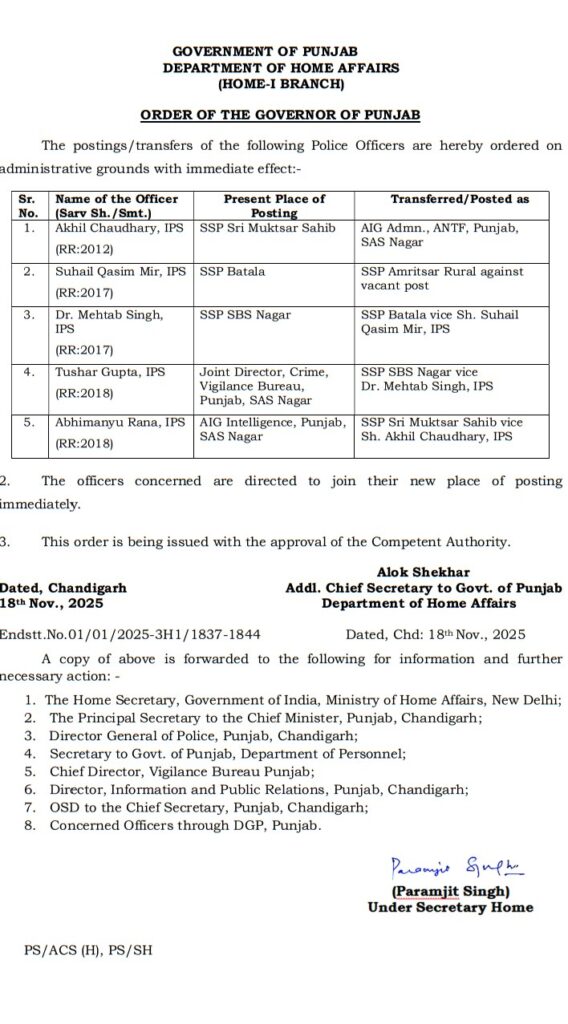 ਪੰਜਾਬ ਸਰਕਾਰ ਵੱਲੋਂ 5 IPS ਅਫ਼ਸਰਾਂ ਦਾ ਤਬਾਦਲਾ ਚੰਡੀਗੜ੍ਹ ਪੰਜਾਬ ਨਵੰਬਰ 19, 2025ਨਵੰਬਰ 19, 2025BolePunjab.comLeave a Comment on ਪੰਜਾਬ ਸਰਕਾਰ ਵੱਲੋਂ 5 IPS ਅਫ਼ਸਰਾਂ ਦਾ ਤਬਾਦਲਾ ਚੰਡੀਗੜ੍ਹ 19 ਨਵੰਬਰ ,ਬੋਲੇ ਪੰਜਾਬ ਬਿਊਰੋ; ਪੰਜਾਬ ਸਰਕਾਰ ਦੇ ਵੱਲੋਂ 5 ਆਈਪੀਐਸ ਅਫ਼ਸਰਾਂ ਦਾ ਤਬਾਦਲਾ ਕੀਤਾ ਗਿਆ ਹੈ। Related Postਪੰਜਾਬ ਨੇ ਸਕੂਲ ਅਧਿਆਪਕਾਂ ਨੂੰ ਕਰੀਅਰ ਮੈਂਟਰ ਵਜੋਂ ਸਿਖਲਾਈ ਦੇਣ ਲਈ ਆਈ.ਆਈ.ਟੀ. ਮਦਰਾਸ ਨਾਲ ਹੱਥ ਮਿਲਾਇਆਦਸੰਬਰ 5, 2025ਪੰਜਾਬ ਵਿੱਚ ਜ਼ਿਲ੍ਹਾ ਪ੍ਰੀਸ਼ਦ ਚੋਣਾਂ ਨੂੰ ਲੈ ਕੇ ਕਾਂਗਰਸ ਨੇ ਹਾਈ ਕੋਰਟ ਦਾ ਦਰਵਾਜ਼ਾ ਖੜਕਾਇਆਦਸੰਬਰ 5, 2025ਚੰਡੀਗੜ੍ਹ ਪੁਲਿਸ ਦੇ ਸ਼ਰਾਬੀ ASI ਨੇ 10 ਵਾਹਨਾਂ ਨੂੰ ਮਾਰੀ ਟੱਕਰਦਸੰਬਰ 5, 2025Latest Newsਪੰਜਾਬ ਨੇ ਸਕੂਲ ਅਧਿਆਪਕਾਂ ਨੂੰ ਕਰੀਅਰ ਮੈਂਟਰ ਵਜੋਂ ਸਿਖਲਾਈ ਦੇਣ ਲਈ ਆਈ.ਆਈ.ਟੀ. ਮਦਰਾਸ ਨਾਲ ਹੱਥ ਮਿਲਾਇਆਸੰਸਦ ਮੈਂਬਰ ਸ਼੍ਰੀ ਮਨੀਸ਼ ਤਿਵਾੜੀ ਨੇ ਲੋਕ ਸਭਾ ਵਿੱਚ ਹਰਿਆਣਾ, ਪੰਜਾਬ ਅਤੇ ਹਿਮਾਚਲ ਪ੍ਰਦੇਸ਼ ਦੇ ਡੈਮਾਂ ਦੀ ਡੀ-ਸਿਲਟਿੰਗ ਅਤੇ ਘਟਦੀ ਸਟੋਰੇਜ ਸਮਰੱਥਾ ਦਾ ਮੁੱਦਾ ਉਠਾਇਆਮੁੱਖ ਪ੍ਰਸ਼ਾਸ਼ਕ ਪੁੱਡਾ ਮੈਡਮ ਨੀਰੂ ਕਤਿਆਲ ਗੁਪਤਾ ਦੇ ਦਫਤਰ ਪੁੱਡਾ ਭਵਨ ਮੋਹਾਲੀ ਵਿਖੇ ਲੜੀਵਾਰ ਭੁੱਖ ਹੜਤਾਲਪੰਜਾਬ ਵਿੱਚ ਜ਼ਿਲ੍ਹਾ ਪ੍ਰੀਸ਼ਦ ਚੋਣਾਂ ਨੂੰ ਲੈ ਕੇ ਕਾਂਗਰਸ ਨੇ ਹਾਈ ਕੋਰਟ ਦਾ ਦਰਵਾਜ਼ਾ ਖੜਕਾਇਆਬਿਜਲੀ ਸੋਧ ਬਿਲ ਤੇ ਨਵੇਂ ਬੀਜ ਬਿੱਲ ਖਿਲਾਫ ਕਿਰਤੀ ਕਿਸਾਨ ਮੋਰਚਾ ਦੀ ਹੋਈ ਮੀਟਿੰਗPreviousNextLatest Newsਪੰਜਾਬ ਨੇ ਸਕੂਲ ਅਧਿਆਪਕਾਂ ਨੂੰ ਕਰੀਅਰ ਮੈਂਟਰ ਵਜੋਂ ਸਿਖਲਾਈ ਦੇਣ ਲਈ ਆਈ.ਆਈ.ਟੀ. ਮਦਰਾਸ ਨਾਲ ਹੱਥ ਮਿਲਾਇਆਸੰਸਦ ਮੈਂਬਰ ਸ਼੍ਰੀ ਮਨੀਸ਼ ਤਿਵਾੜੀ ਨੇ ਲੋਕ ਸਭਾ ਵਿੱਚ ਹਰਿਆਣਾ, ਪੰਜਾਬ ਅਤੇ ਹਿਮਾਚਲ ਪ੍ਰਦੇਸ਼ ਦੇ ਡੈਮਾਂ ਦੀ ਡੀ-ਸਿਲਟਿੰਗ ਅਤੇ ਘਟਦੀ ਸਟੋਰੇਜ ਸਮਰੱਥਾ ਦਾ ਮੁੱਦਾ ਉਠਾਇਆਮੁੱਖ ਪ੍ਰਸ਼ਾਸ਼ਕ ਪੁੱਡਾ ਮੈਡਮ ਨੀਰੂ ਕਤਿਆਲ ਗੁਪਤਾ ਦੇ ਦਫਤਰ ਪੁੱਡਾ ਭਵਨ ਮੋਹਾਲੀ ਵਿਖੇ ਲੜੀਵਾਰ ਭੁੱਖ ਹੜਤਾਲਪੰਜਾਬ ਵਿੱਚ ਜ਼ਿਲ੍ਹਾ ਪ੍ਰੀਸ਼ਦ ਚੋਣਾਂ ਨੂੰ ਲੈ ਕੇ ਕਾਂਗਰਸ ਨੇ ਹਾਈ ਕੋਰਟ ਦਾ ਦਰਵਾਜ਼ਾ ਖੜਕਾਇਆਬਿਜਲੀ ਸੋਧ ਬਿਲ ਤੇ ਨਵੇਂ ਬੀਜ ਬਿੱਲ ਖਿਲਾਫ ਕਿਰਤੀ ਕਿਸਾਨ ਮੋਰਚਾ ਦੀ ਹੋਈ ਮੀਟਿੰਗਪਾਈਟੈਕਸ ਵਿਖੇ ਅਪਾਹਜਾਂ ਅਤੇ ਬਜ਼ੁਰਗਾਂ ਲਈ ਵ੍ਹੀਲਚੇਅਰ ਦੀ ਸਹੂਲਤਚੰਡੀਗੜ੍ਹ ਪੁਲਿਸ ਦੇ ਸ਼ਰਾਬੀ ASI ਨੇ 10 ਵਾਹਨਾਂ ਨੂੰ ਮਾਰੀ ਟੱਕਰਪੰਜਾਬ ਵਿੱਚ ਰੇਲਵੇ ਪਟੜੀਆਂ ‘ਤੇ ਕਿਸਾਨਾਂ ਅਤੇ ਪੁਲਿਸ ਵਿਚਕਾਰ ਝੜਪਾਂਦੇਸ਼ ਭਗਤ ਯੂਨੀਵਰਸਿਟੀ ਨੇ ਕਰਵਾਈ ਅੰਤਰਰਾਸ਼ਟਰੀ ਕਾਨਫਰੰਸ ਅਤੇ ਅਗਾਂਹਵਧੂ ਕਿਸਾਨ ਮਿਲਣੀਆਮ ਆਦਮੀ ਪਾਰਟੀ ਵੱਲੋਂ ਨਾਮਜ਼ਦਗੀ ਪੱਤਰ ਦਾਖਲ ਕਰਨ ਦੌਰਾਨ ਸ਼ਰੇਆਮ ਗੁੰਡਾਗਰਦੀ ਦੀਆਂ ਘਟਨਾਵਾਂ ਅਤੇ ਚੋਣ ਪ੍ਰਕਿਰਿਆ ਦੌਰਾਨ ਸਰਕਾਰੀ ਮਸ਼ੀਨਰੀ ਦੀ ਕਥਿਤ ਦੁਰਵਰਤੋਂ ਲੋਕਤੰਤਰ ਲਈ ਖ਼ਤਰਨਾਕ – ਕੈਂਥ ਪੁਲਿਸ ਮੁਲਾਜ਼ਮਾਂ ‘ਤੇ ਵਰਦੀ ‘ਚ ਰੀਲਾਂ ਬਣਾਉਣ ‘ਤੇ ਲੱਗੀ ਪਾਬੰਦੀਜਲੰਧਰ ‘ਚ ਰੋਡਵੇਜ਼ ਬੱਸ ਨੇ ਸਕੂਟਰ ਨੂੰ ਟੱਕਰ ਮਾਰੀ, ਪੁੱਤ ਦੀ ਮੌਤ ਪਿਤਾ ਗੰਭੀਰ ਜ਼ਖ਼ਮੀ PreviousNext